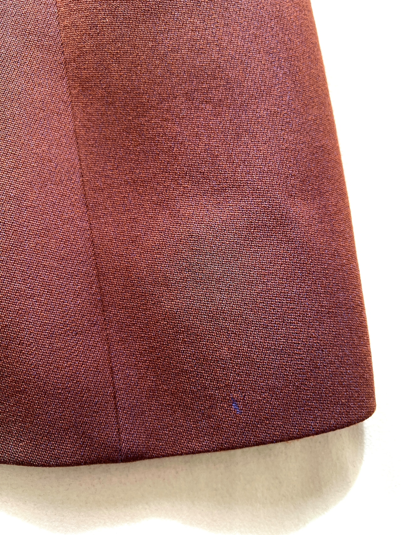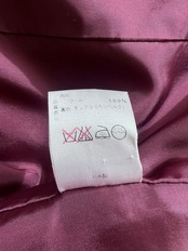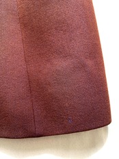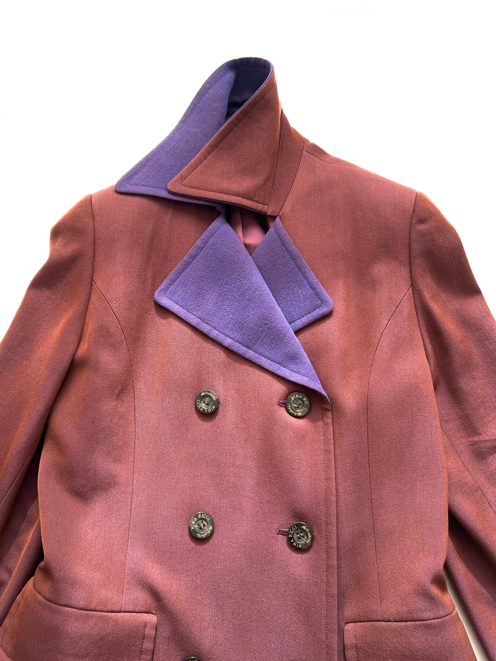 バイオレットカラーの大きなダブルカラーで、顔周りに華やかさと立体感を、袖口の折り返しにもバイオレットが現れ、玄人好みの色気と品格を醸し出しています。
