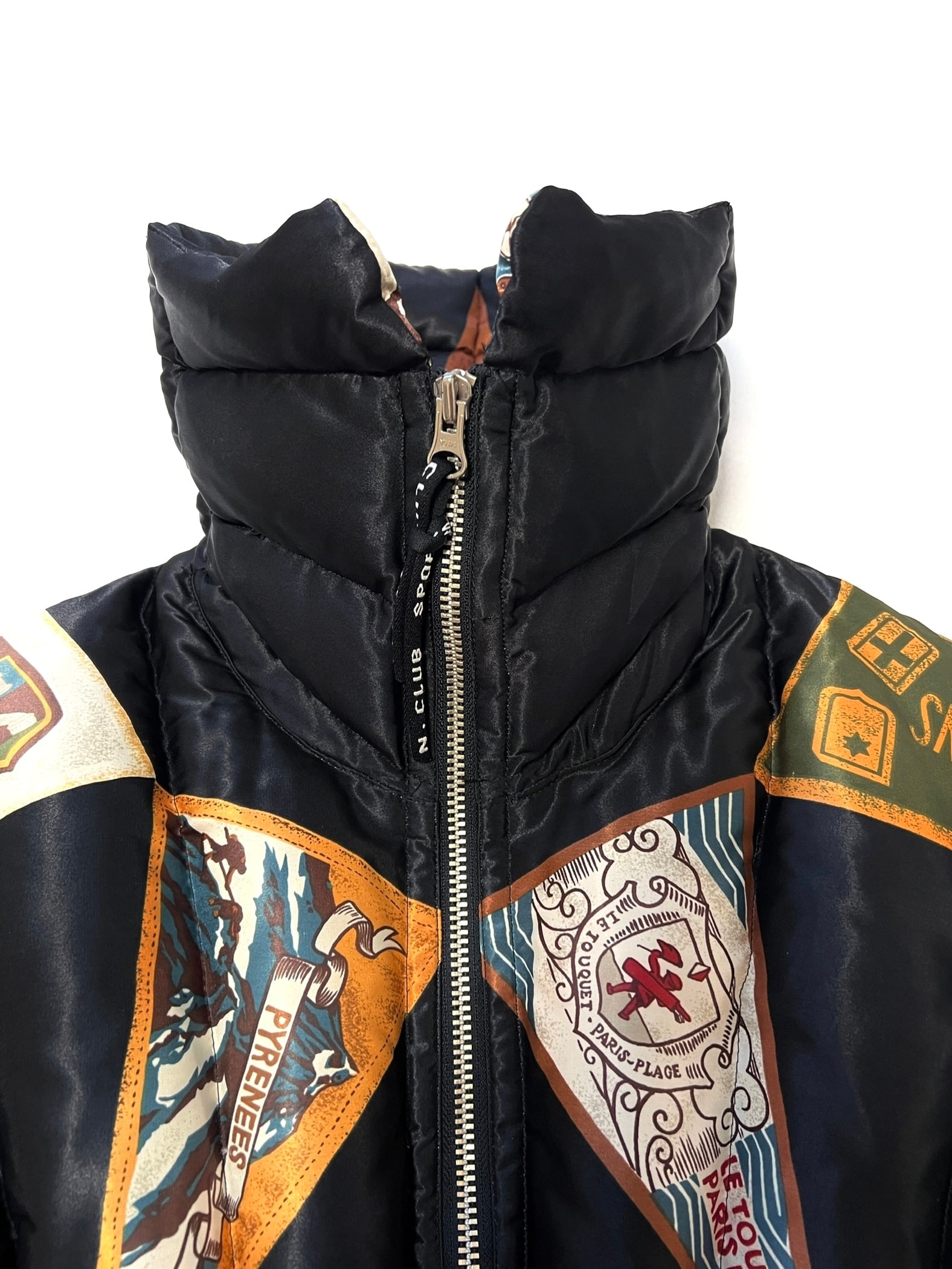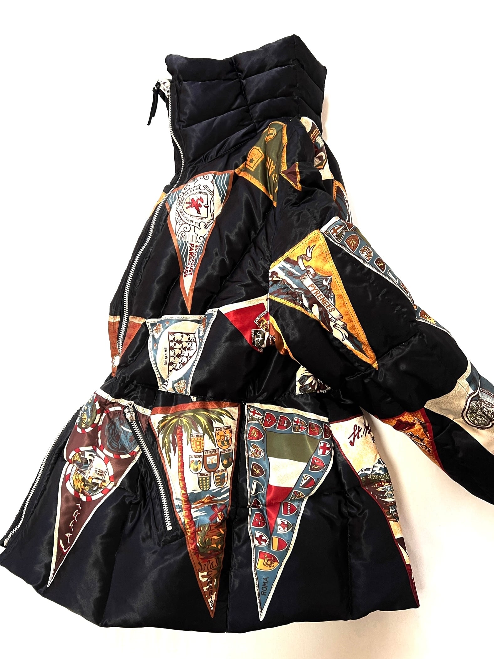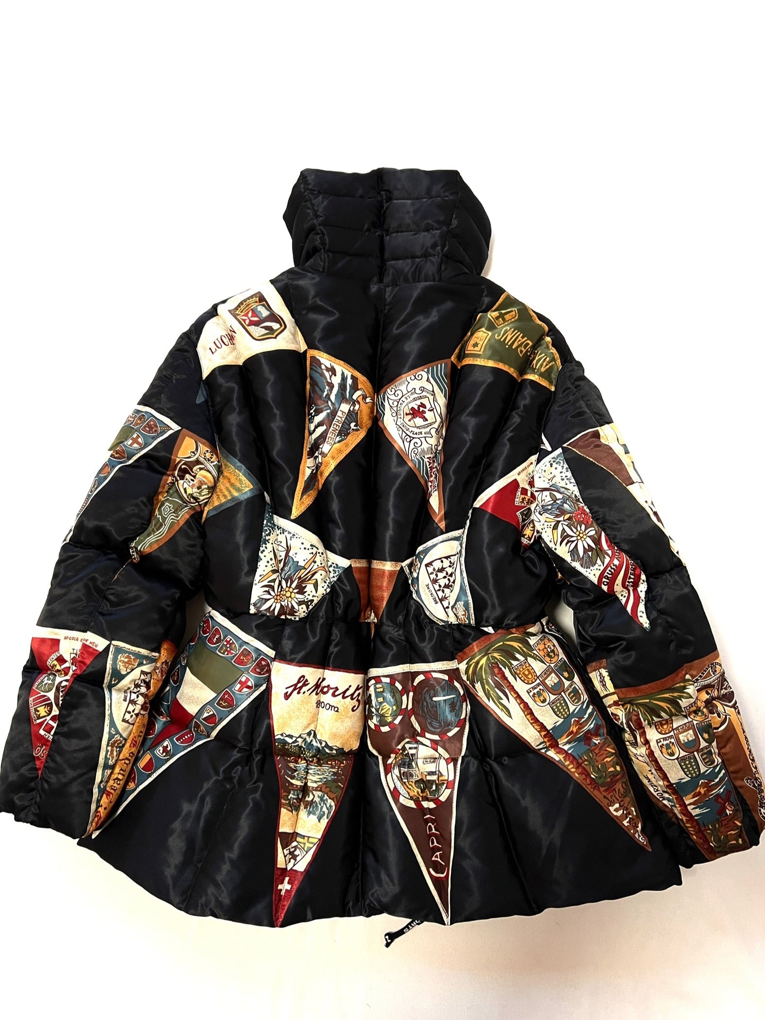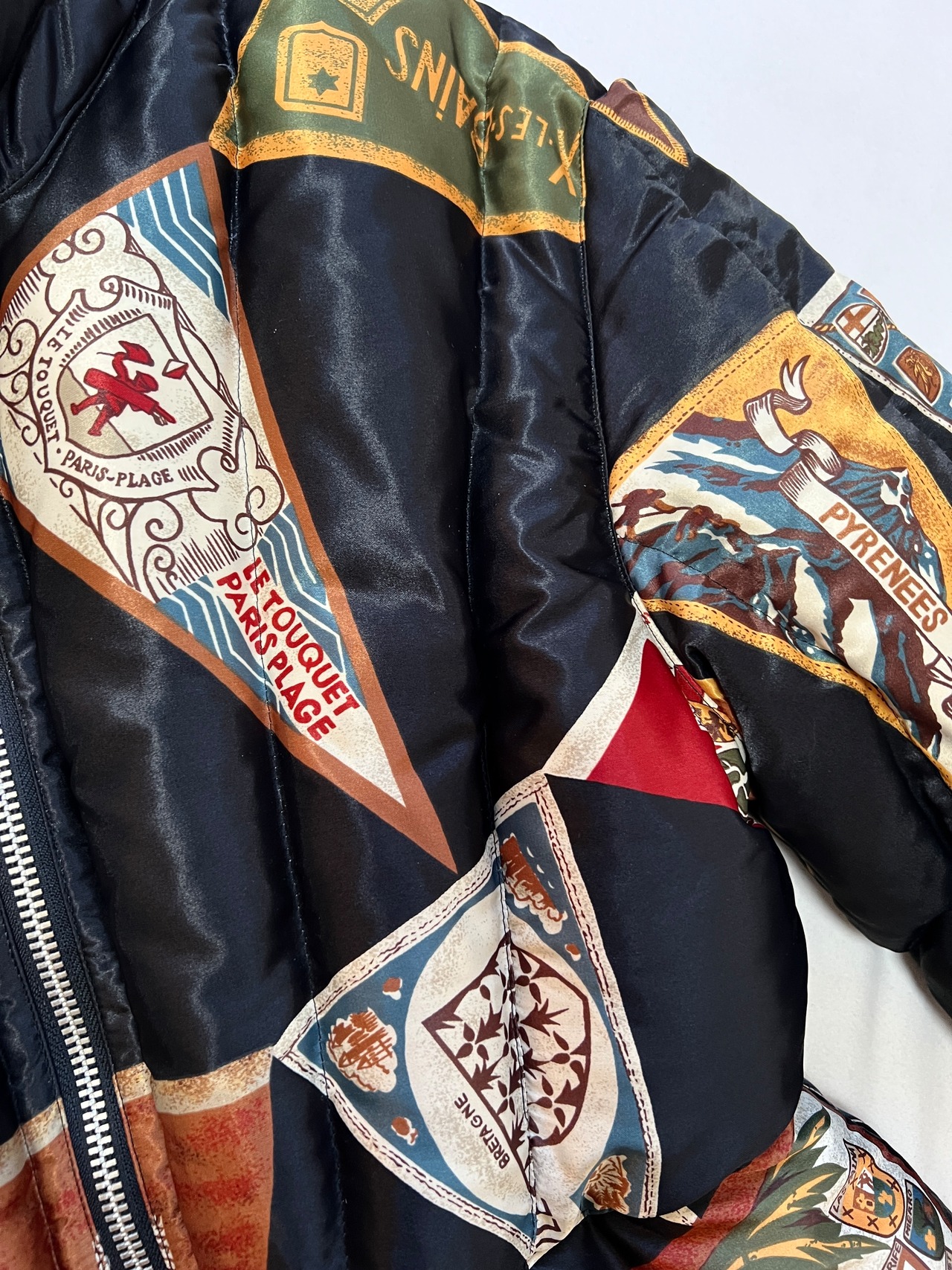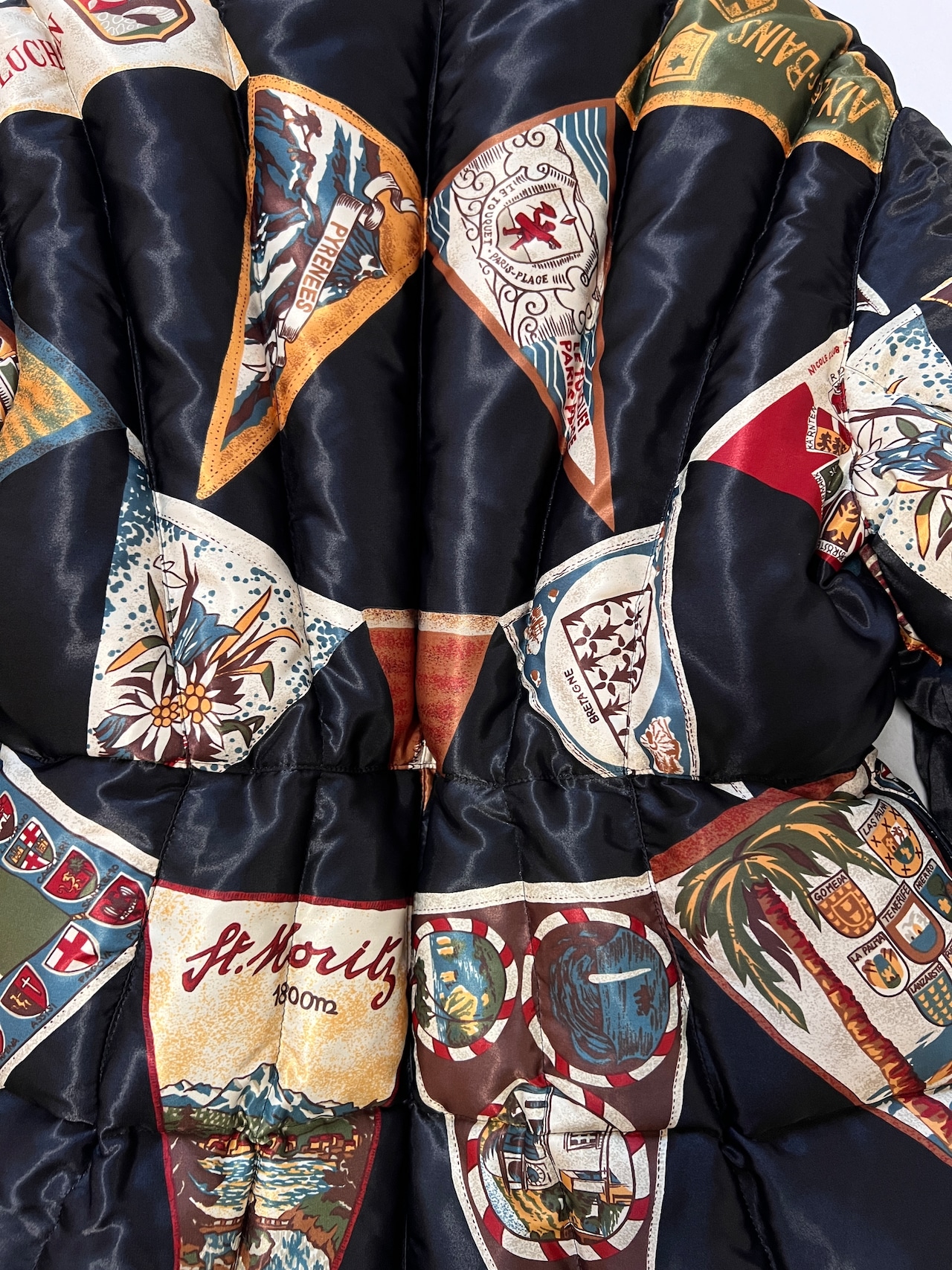 サテン地のボディはヨーロッパ各地(CAPRI, PYRENEES, BRETAGNEなど)の観光ペナントをパッチワークのように組み合わせた、非常に希少な総柄デザインです。鮮やかな色彩と繊細な紋章のグラフィックが、ヴィンテージならではの存在感を放ちます。