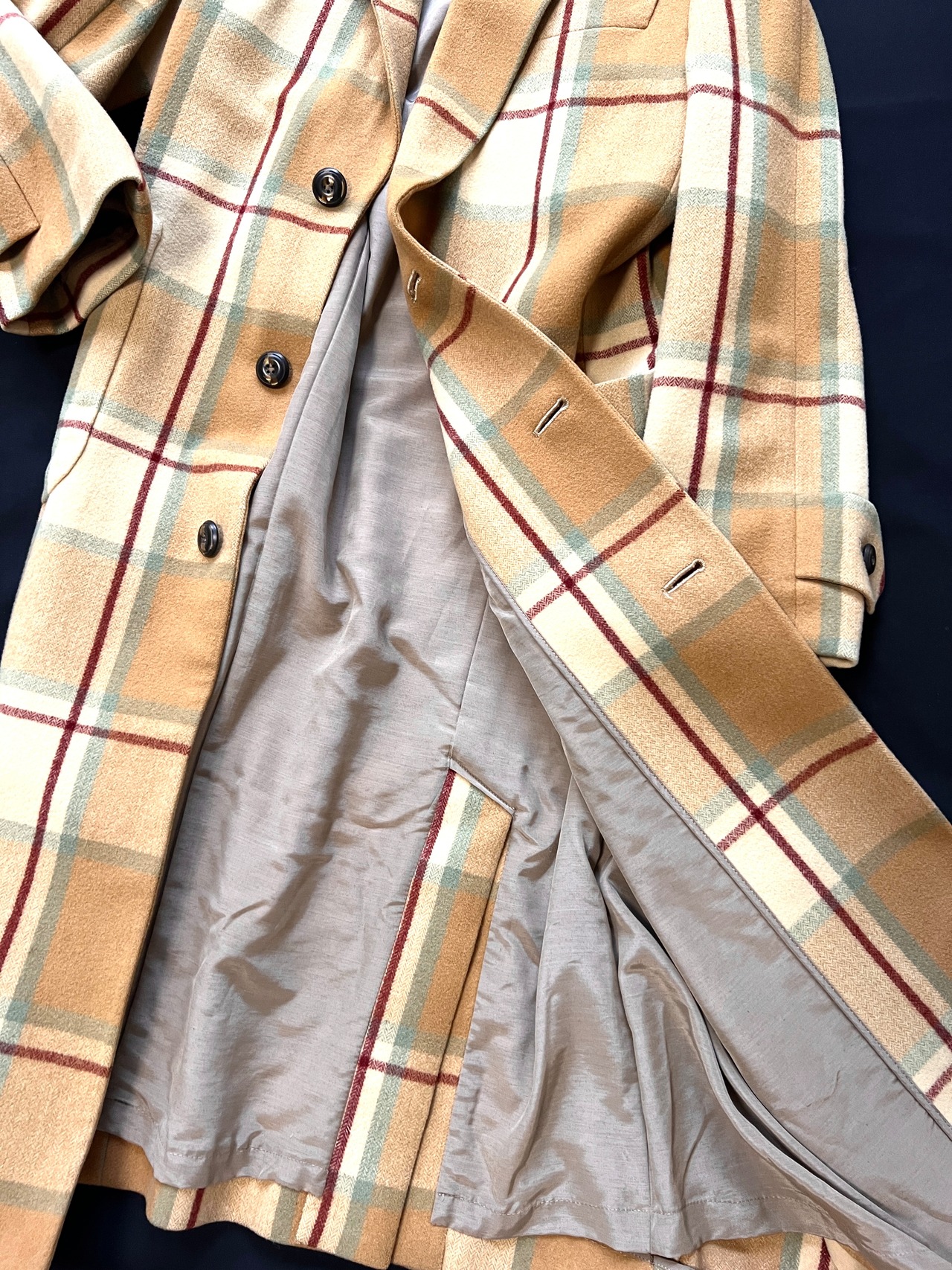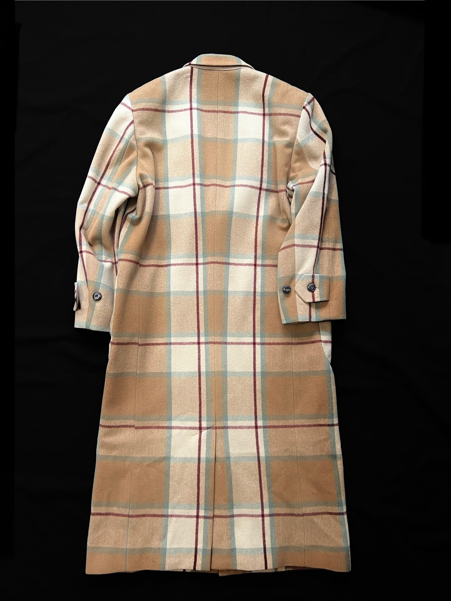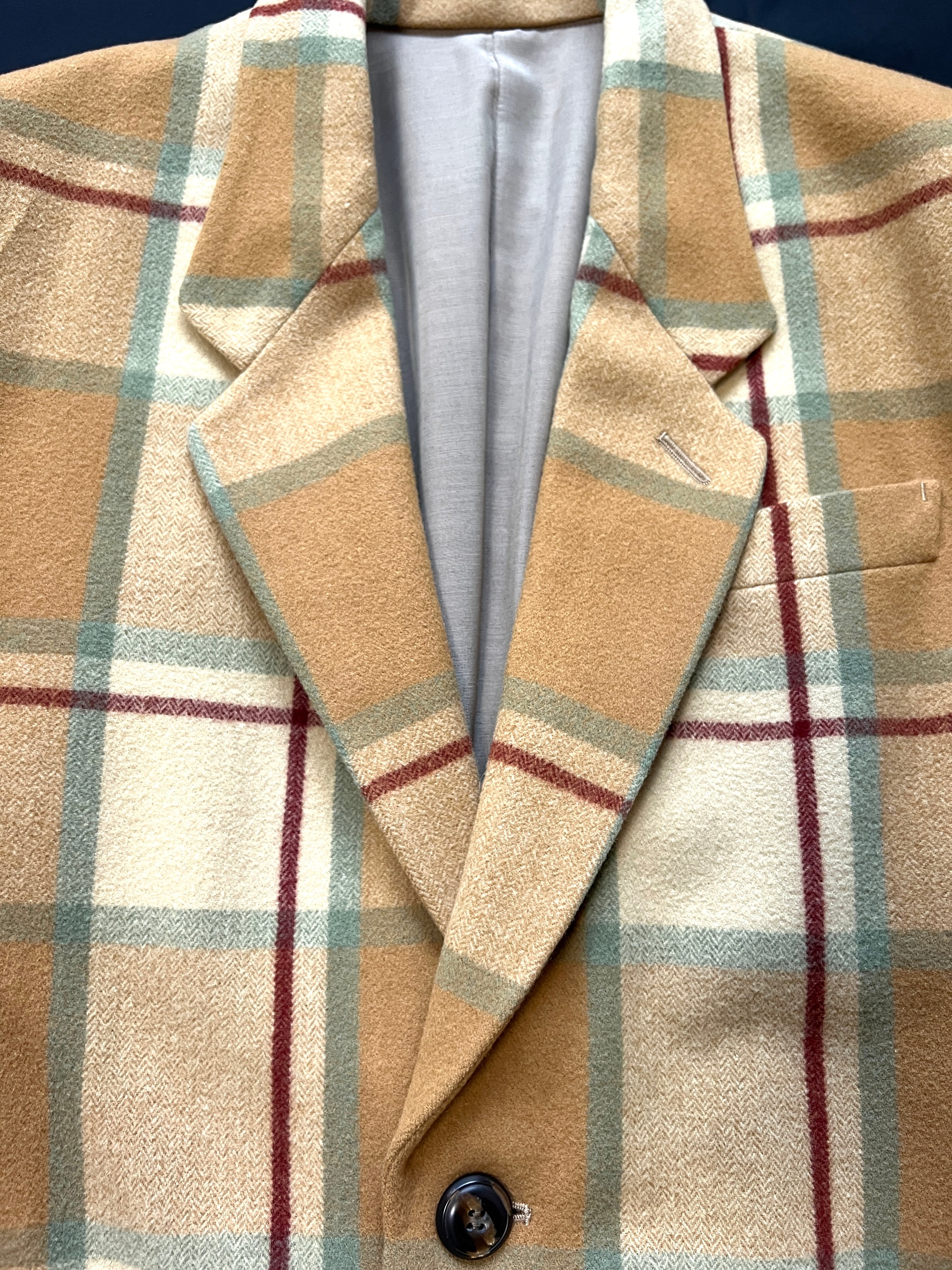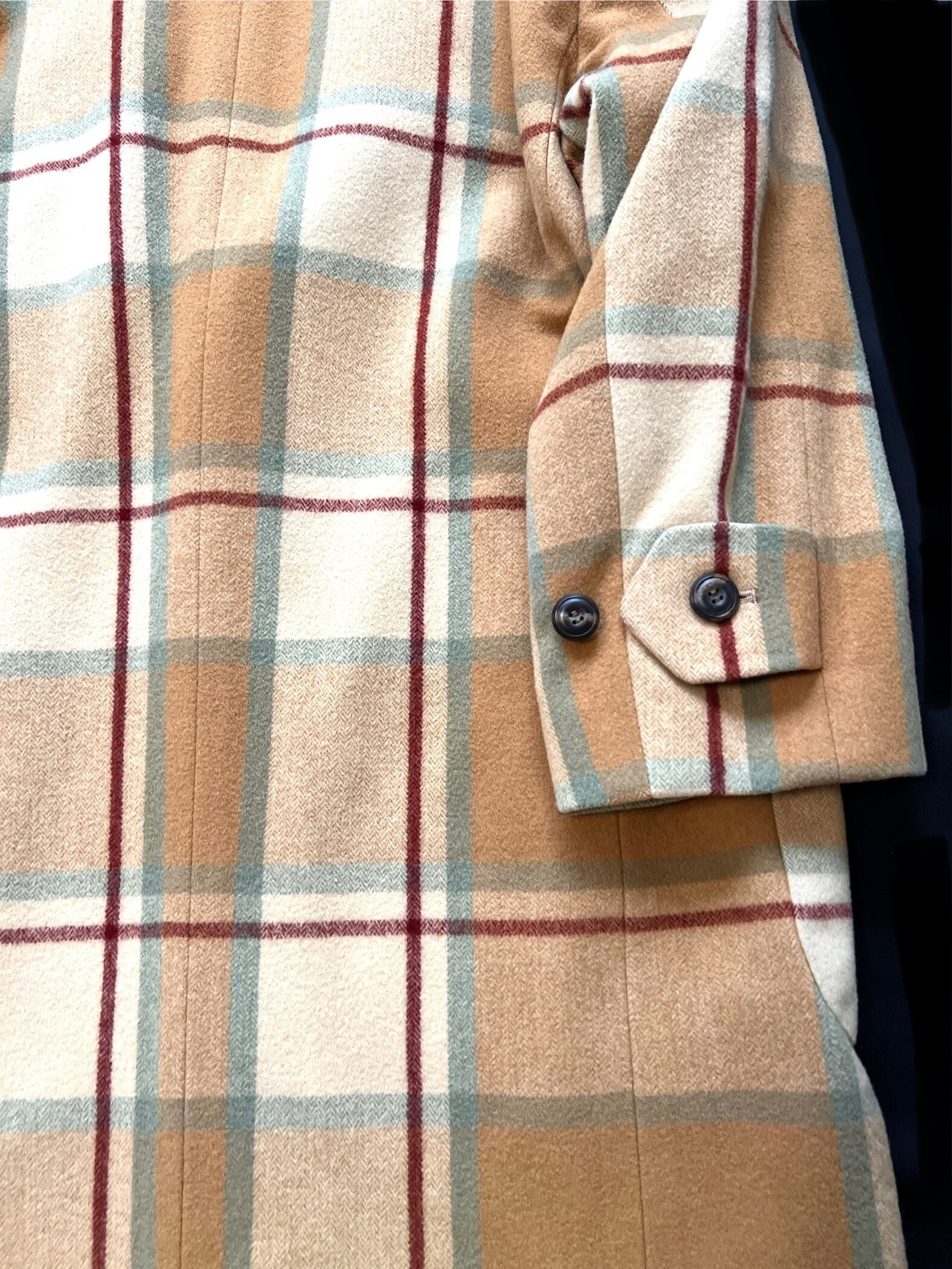 今では再現が難しいとされる、厚みがありながらもしなやかなウール地を贅沢に使用。温かみのあるベージュをベースに、ミントグリーンとボルドーが絶妙に交差するクラシックなチェック柄は、知性と遊び心を感じさせます。
