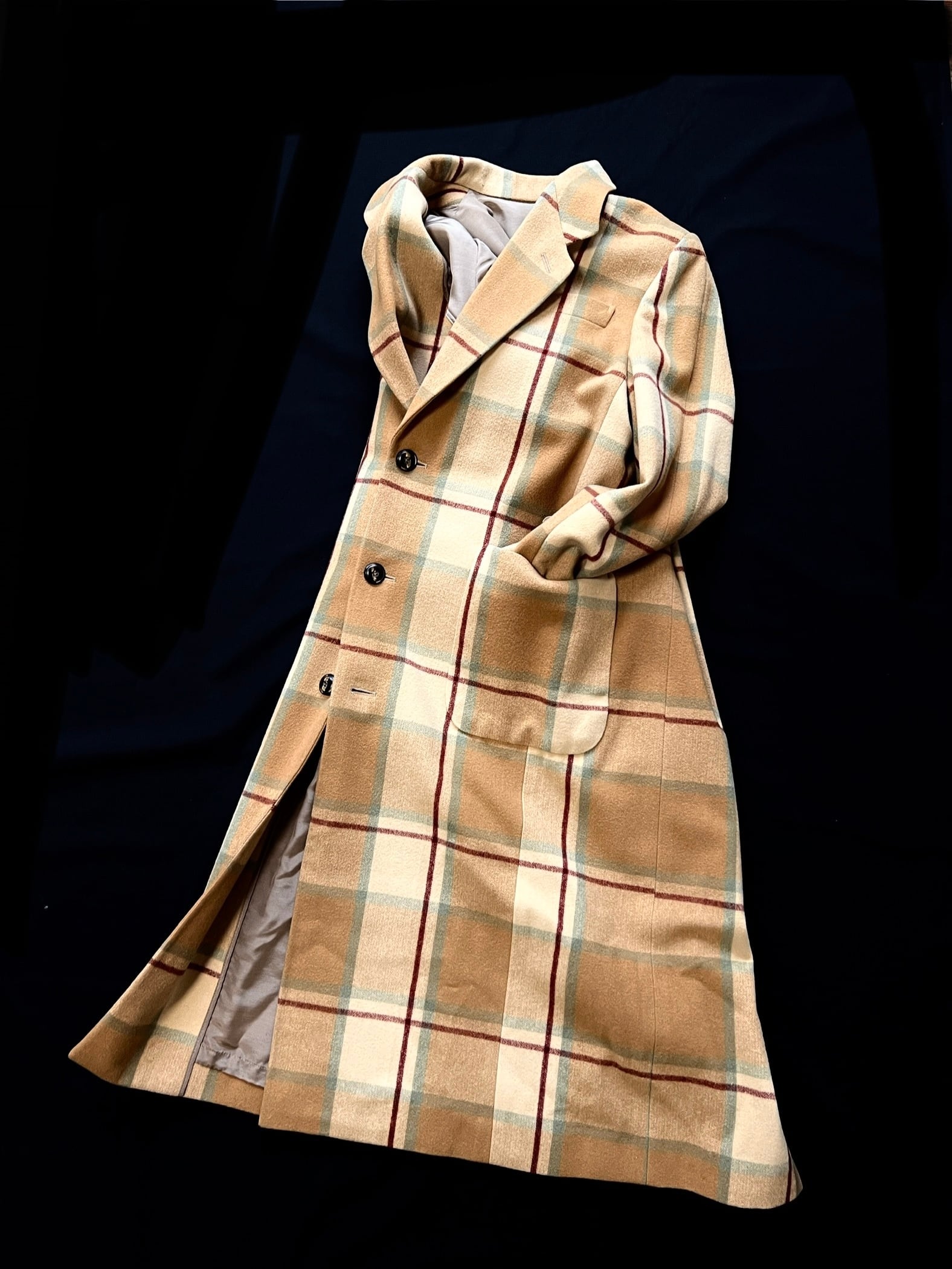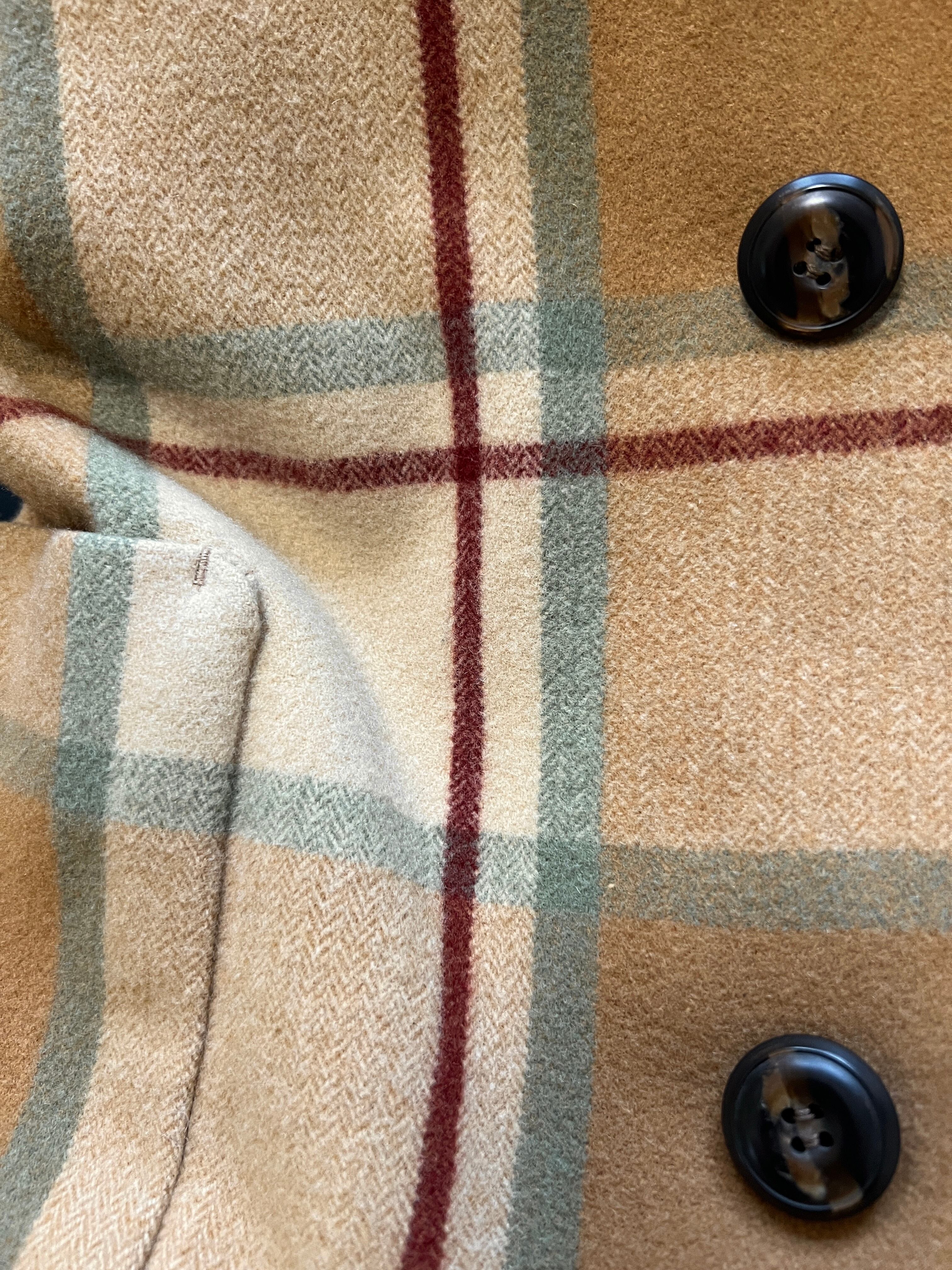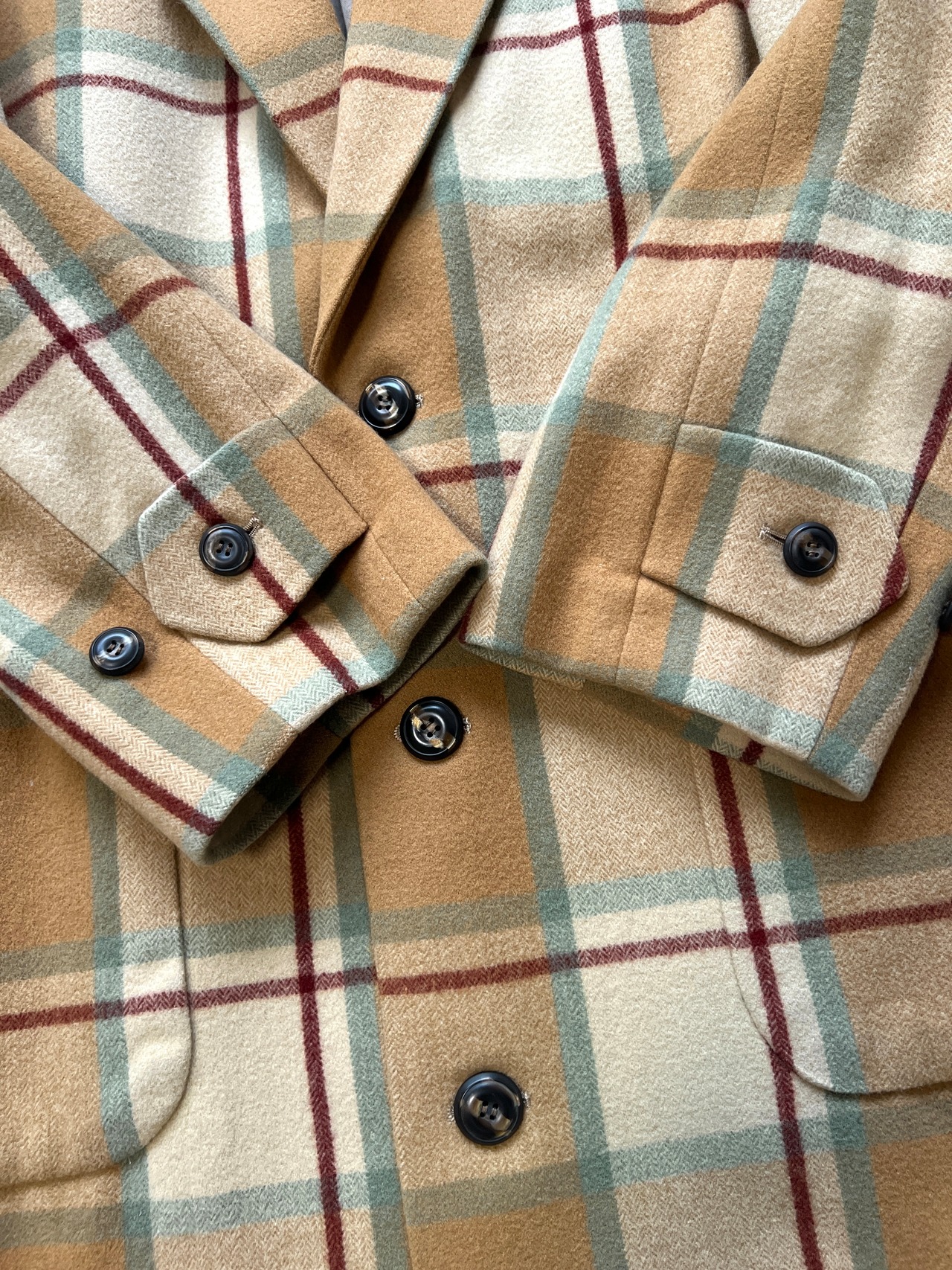 今では再現が難しいとされる、厚みがありながらもしなやかなウール地を贅沢に使用。温かみのあるベージュをベースに、ミントグリーンとボルドーが絶妙に交差するクラシックなチェック柄は、知性と遊び心を感じさせます。