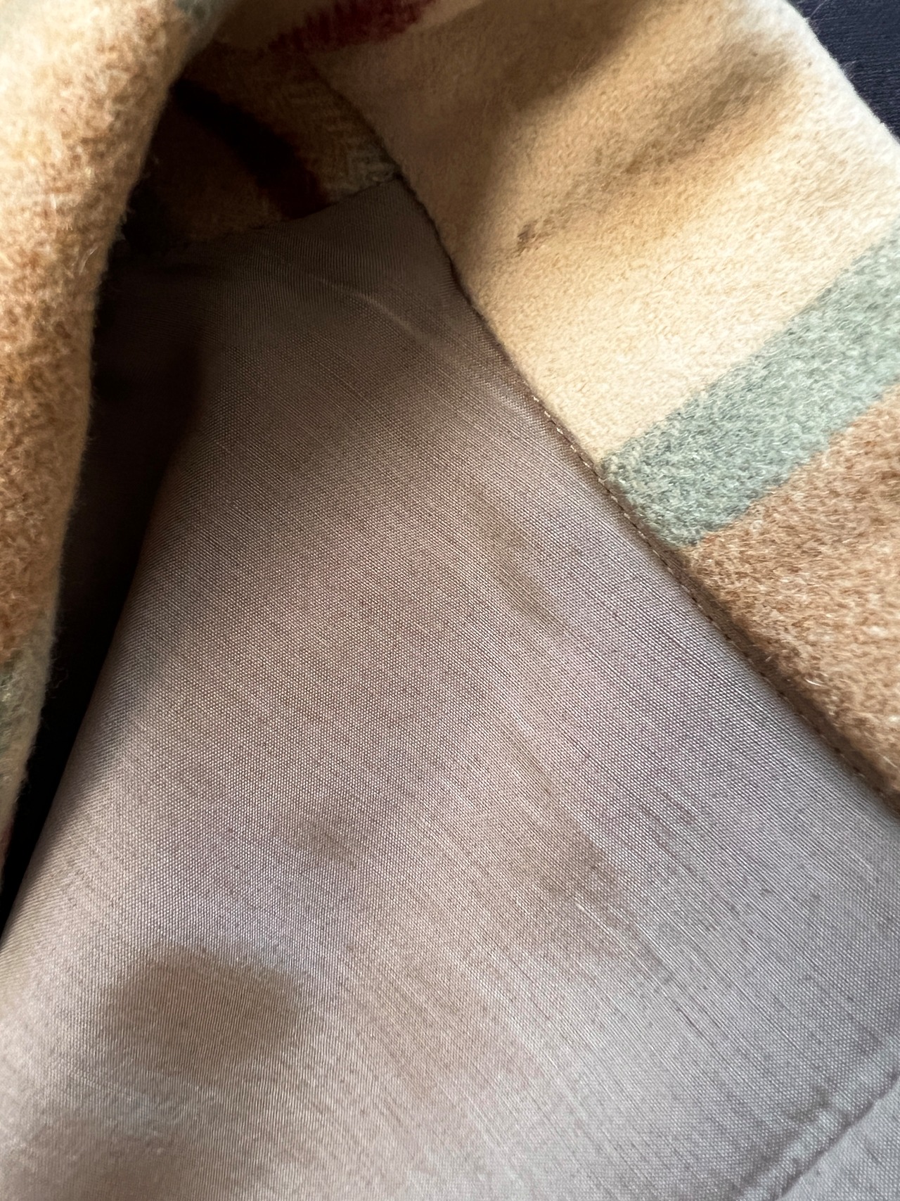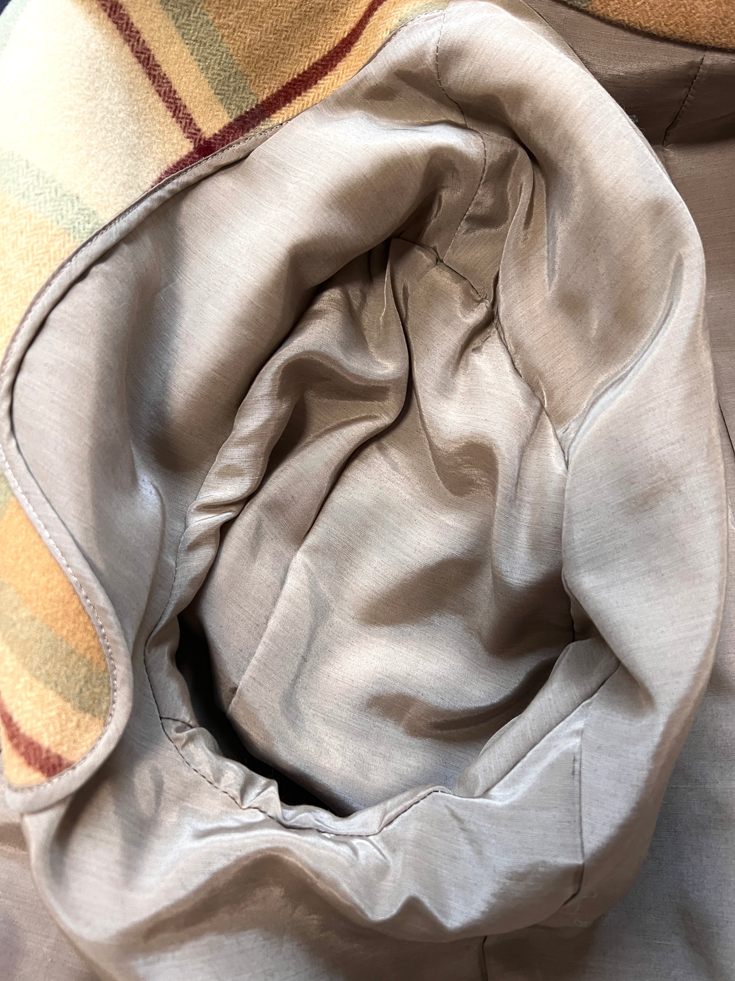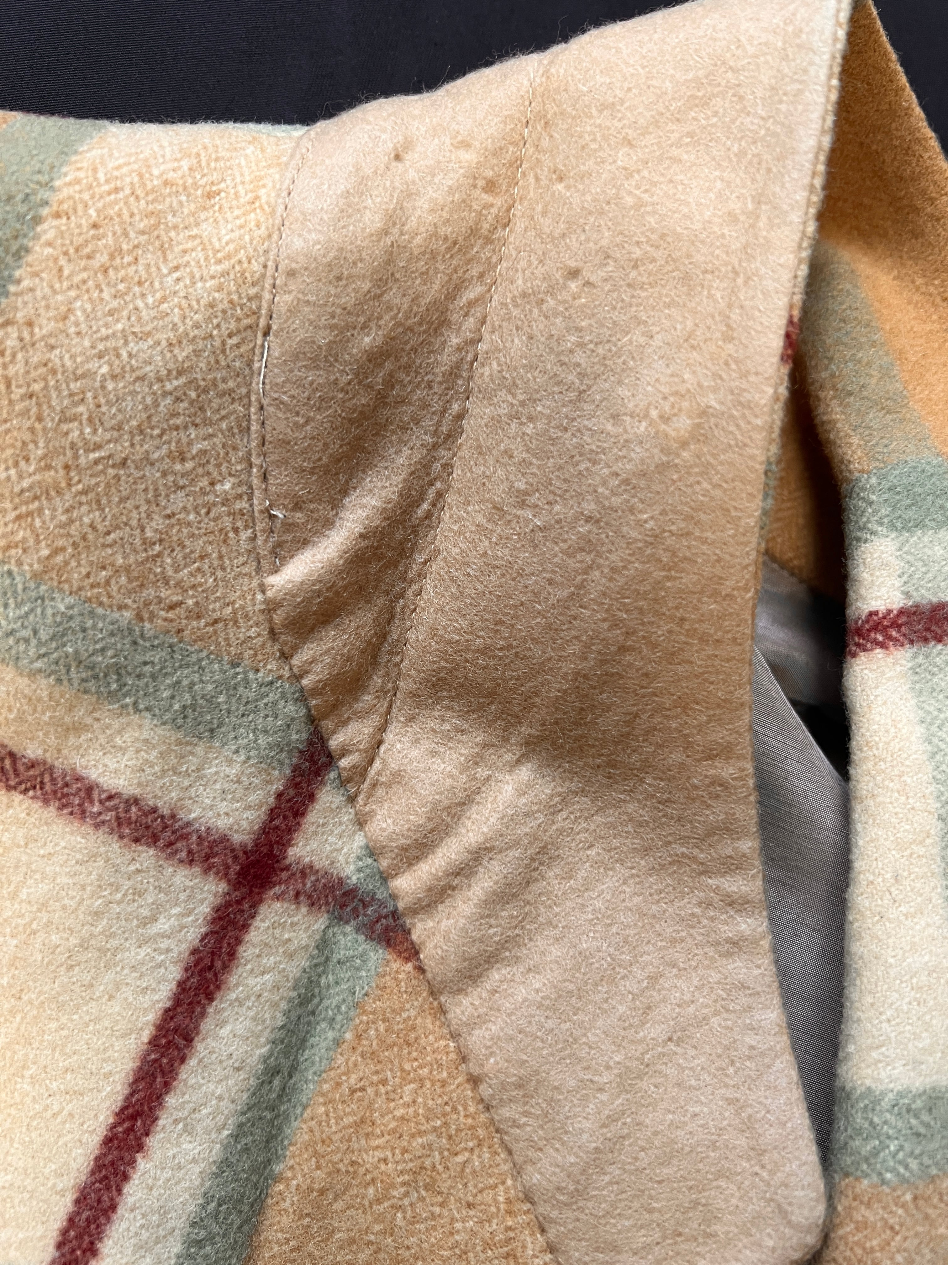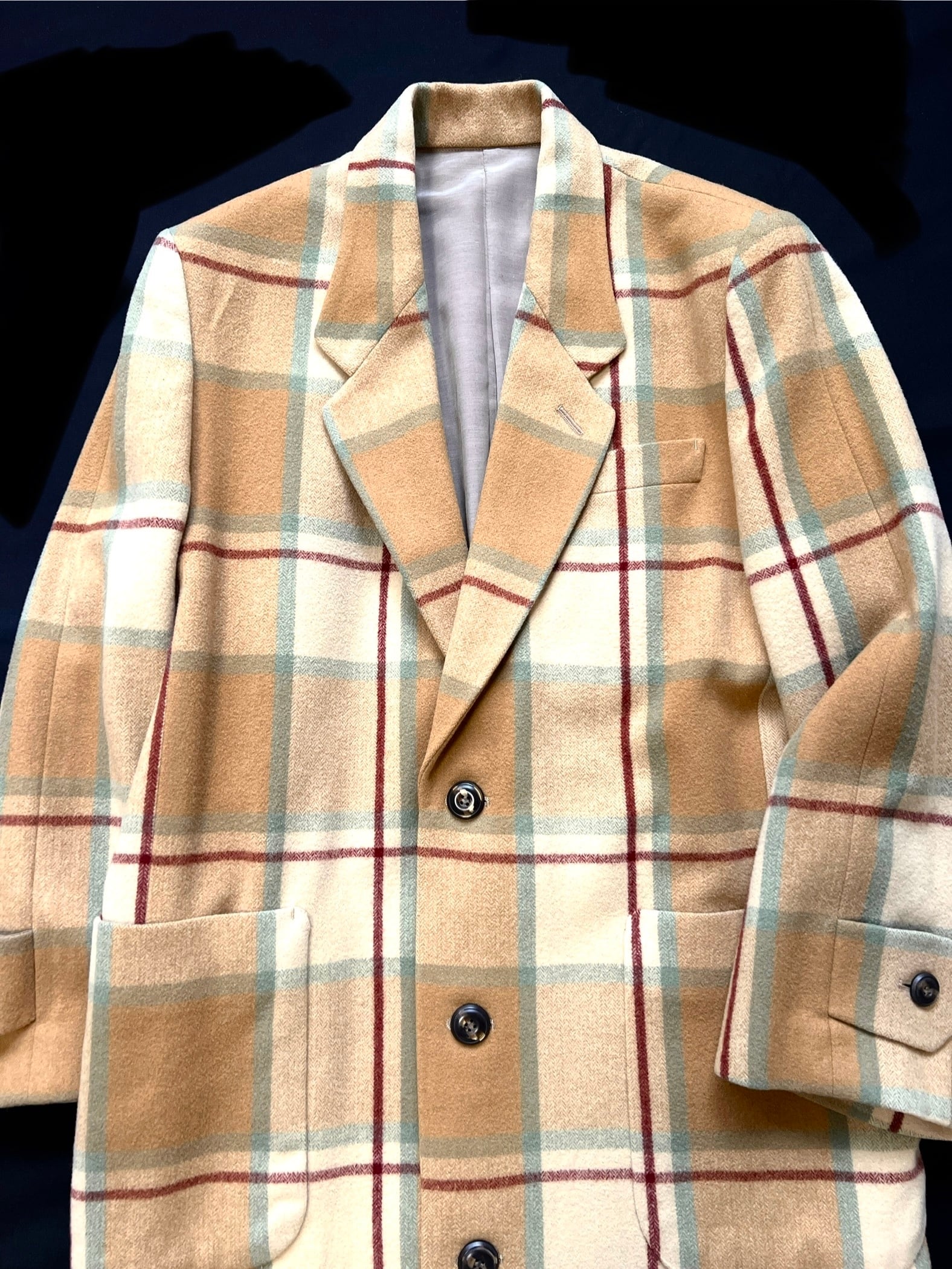 今では再現が難しいとされる、厚みがありながらもしなやかなウール地を贅沢に使用。温かみのあるベージュをベースに、ミントグリーンとボルドーが絶妙に交差するクラシックなチェック柄は、知性と遊び心を感じさせます。