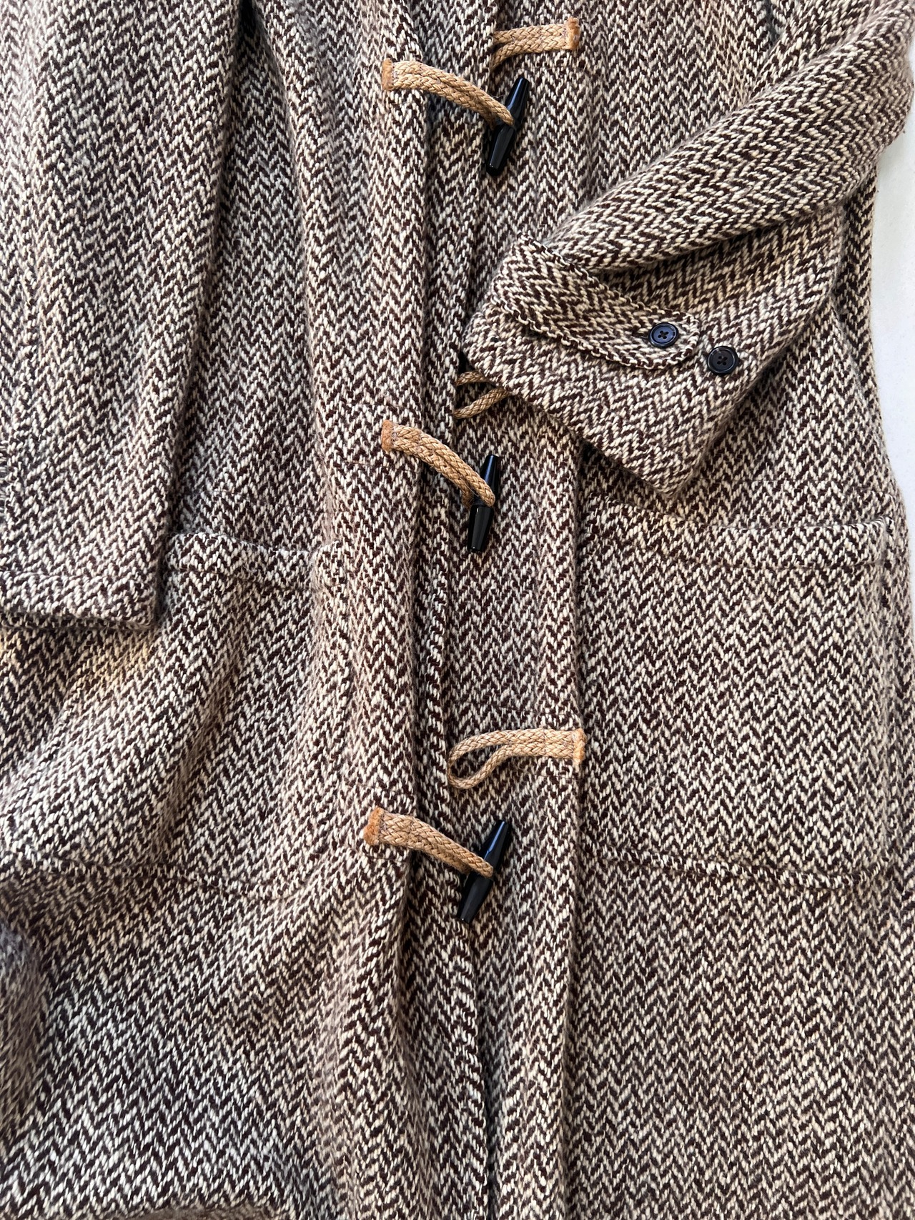 足元まで包み込む贅沢なロングシルエット。トグルボタンは縄編みのループに本格的なトグルを採用したトラッドな意匠。