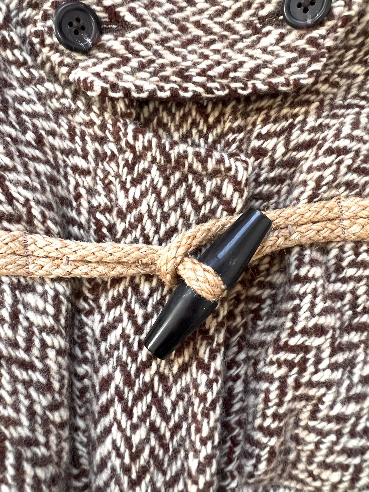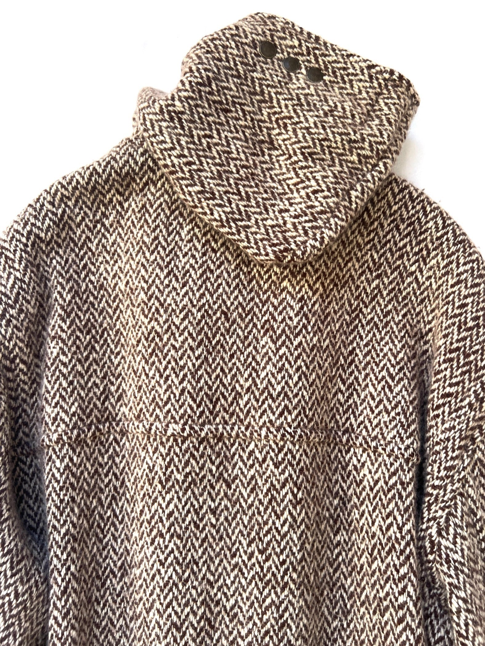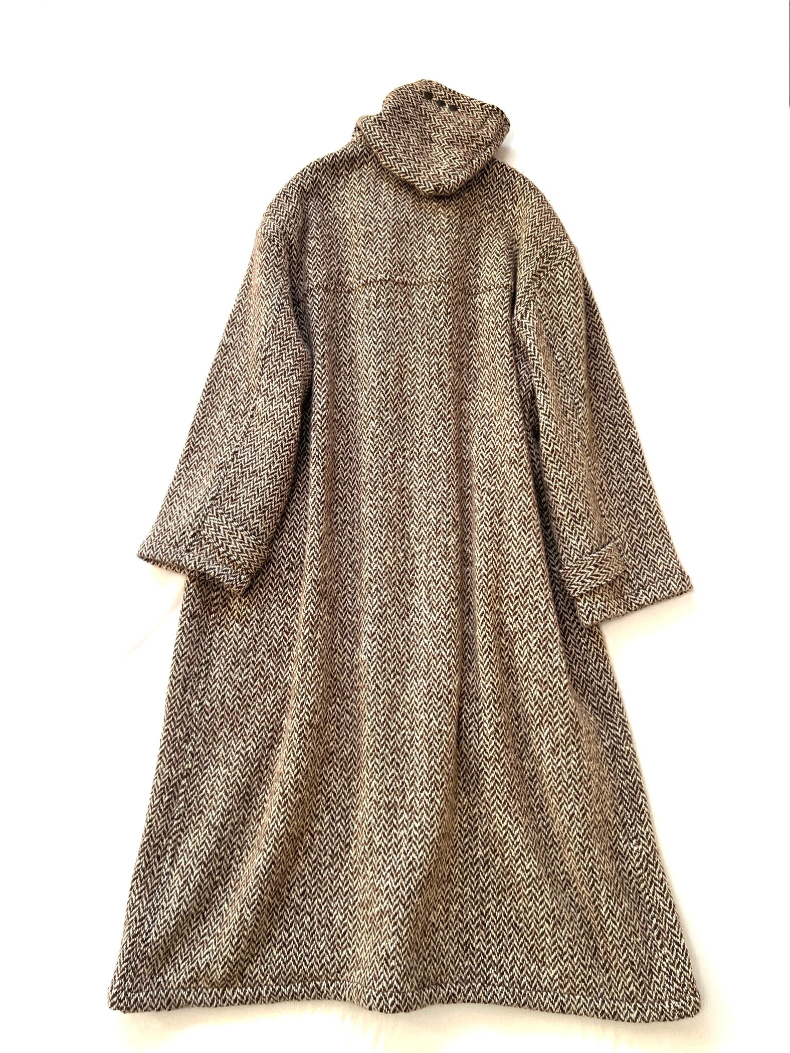厚みのあるウールニットで精巧に編み上げられたヘリンボーン柄。通常のメルトン生地とは異なる、ニット特有の柔らかな落ち感と温かみのある表情が、クラシックなダッフルスタイルをよりエレガントで洗練された印象に格上げしています。