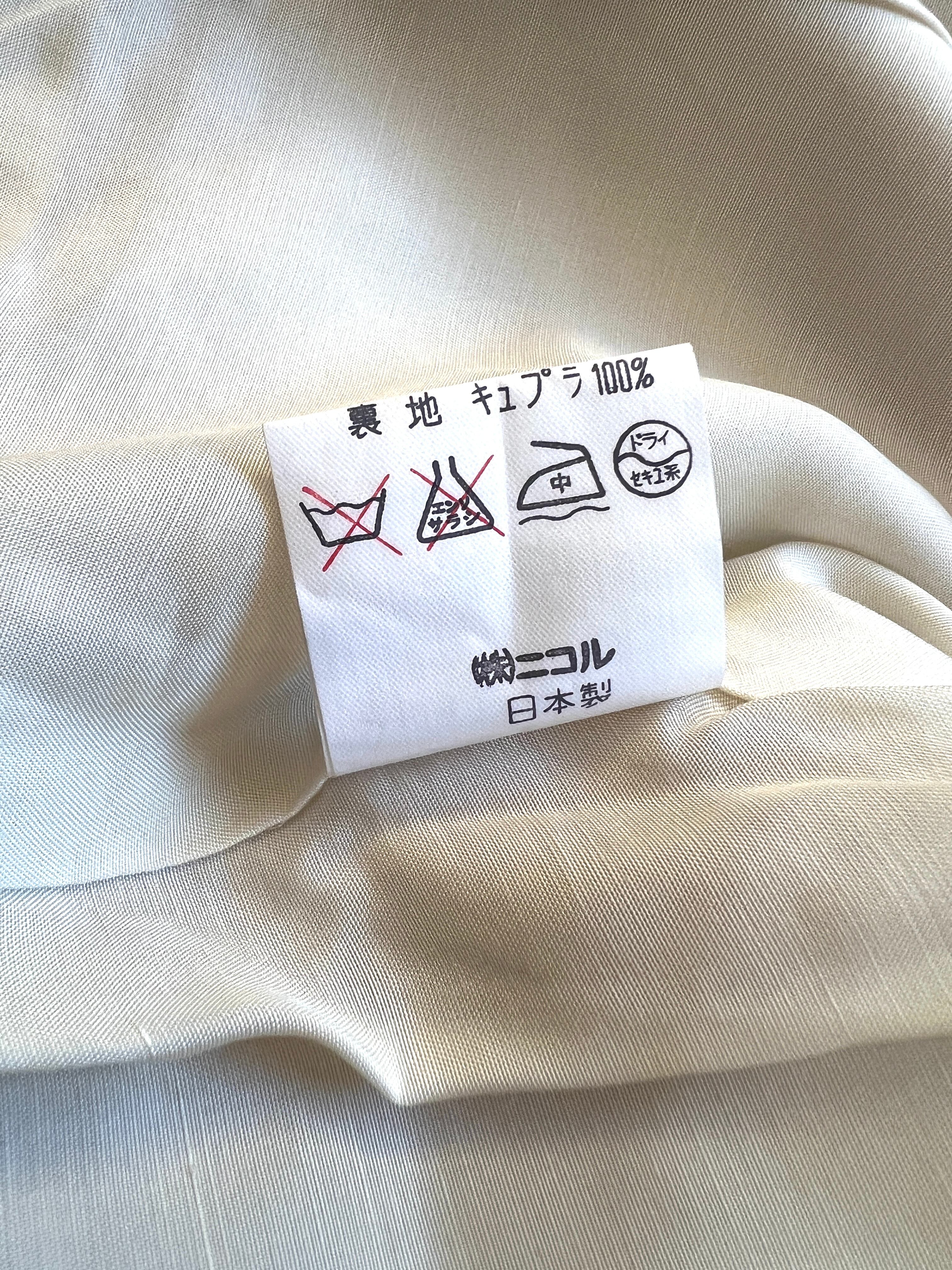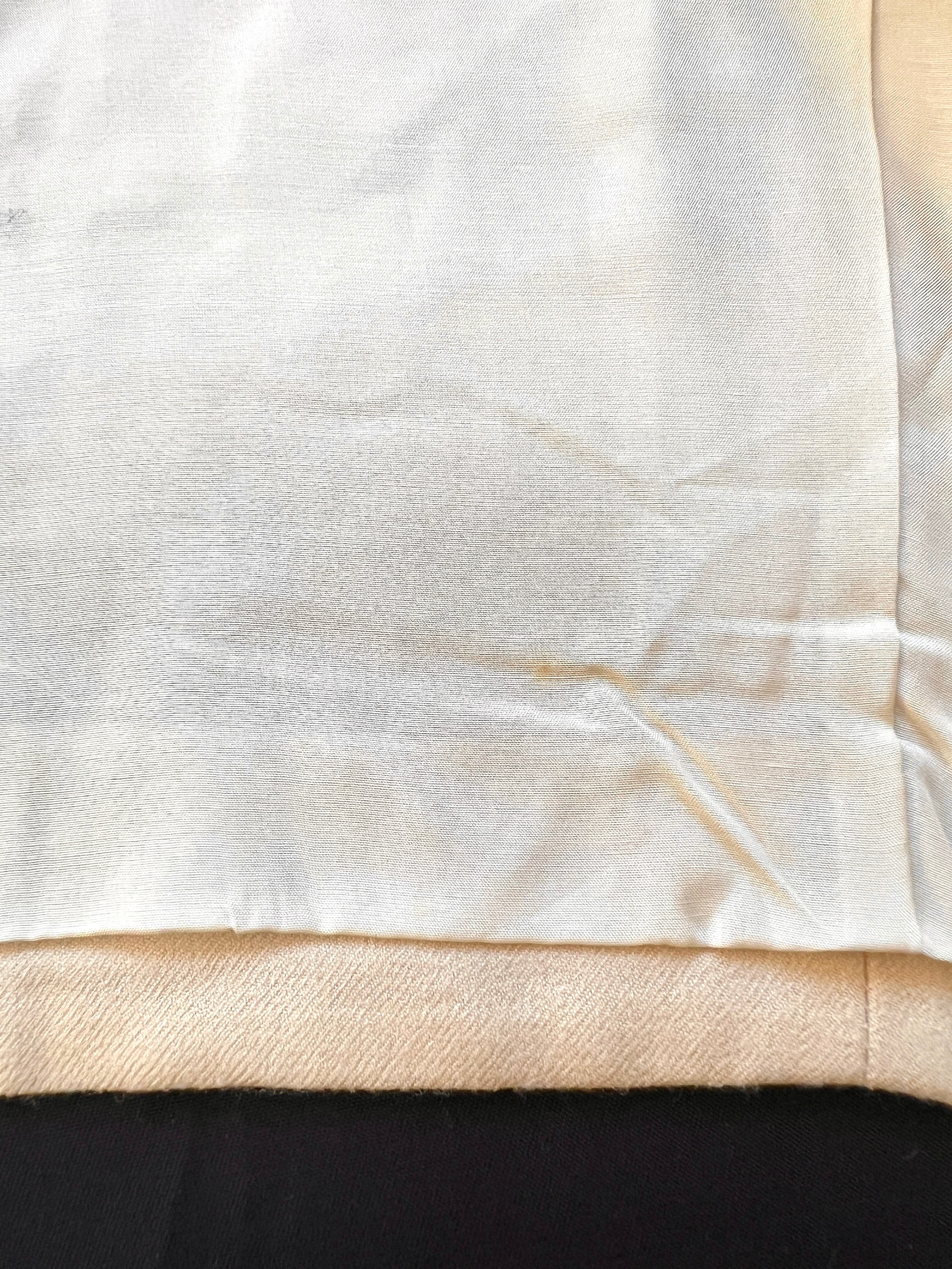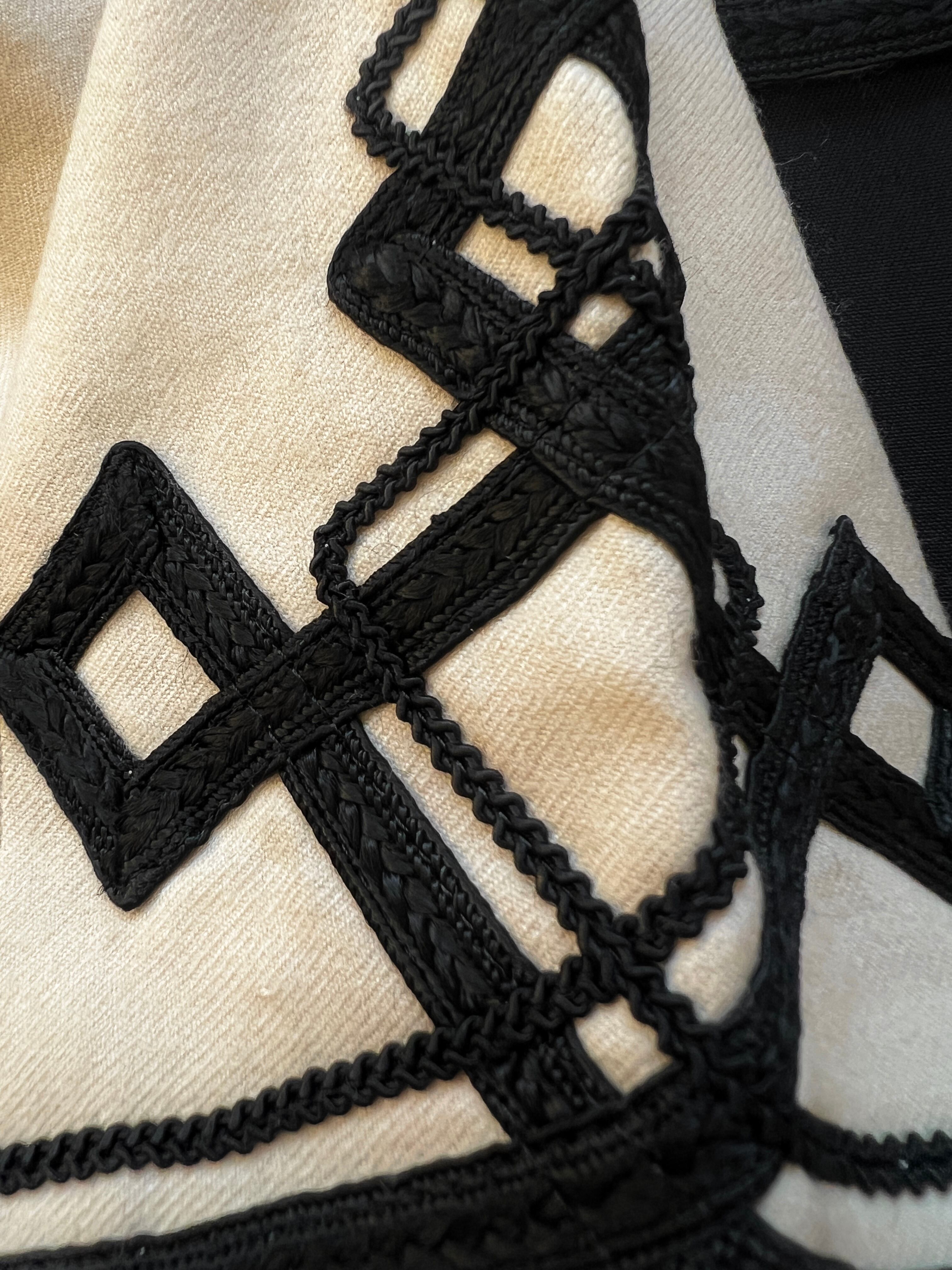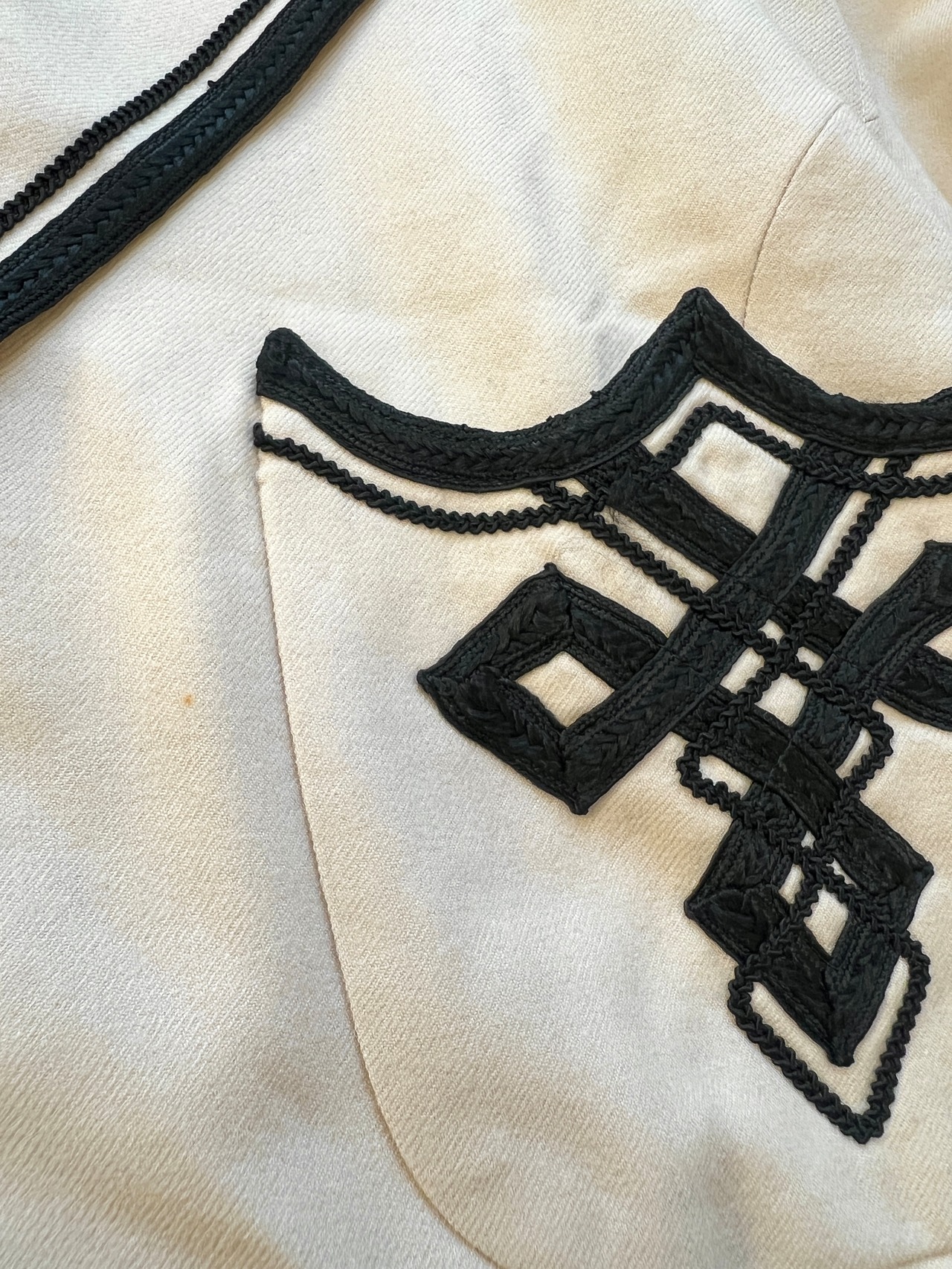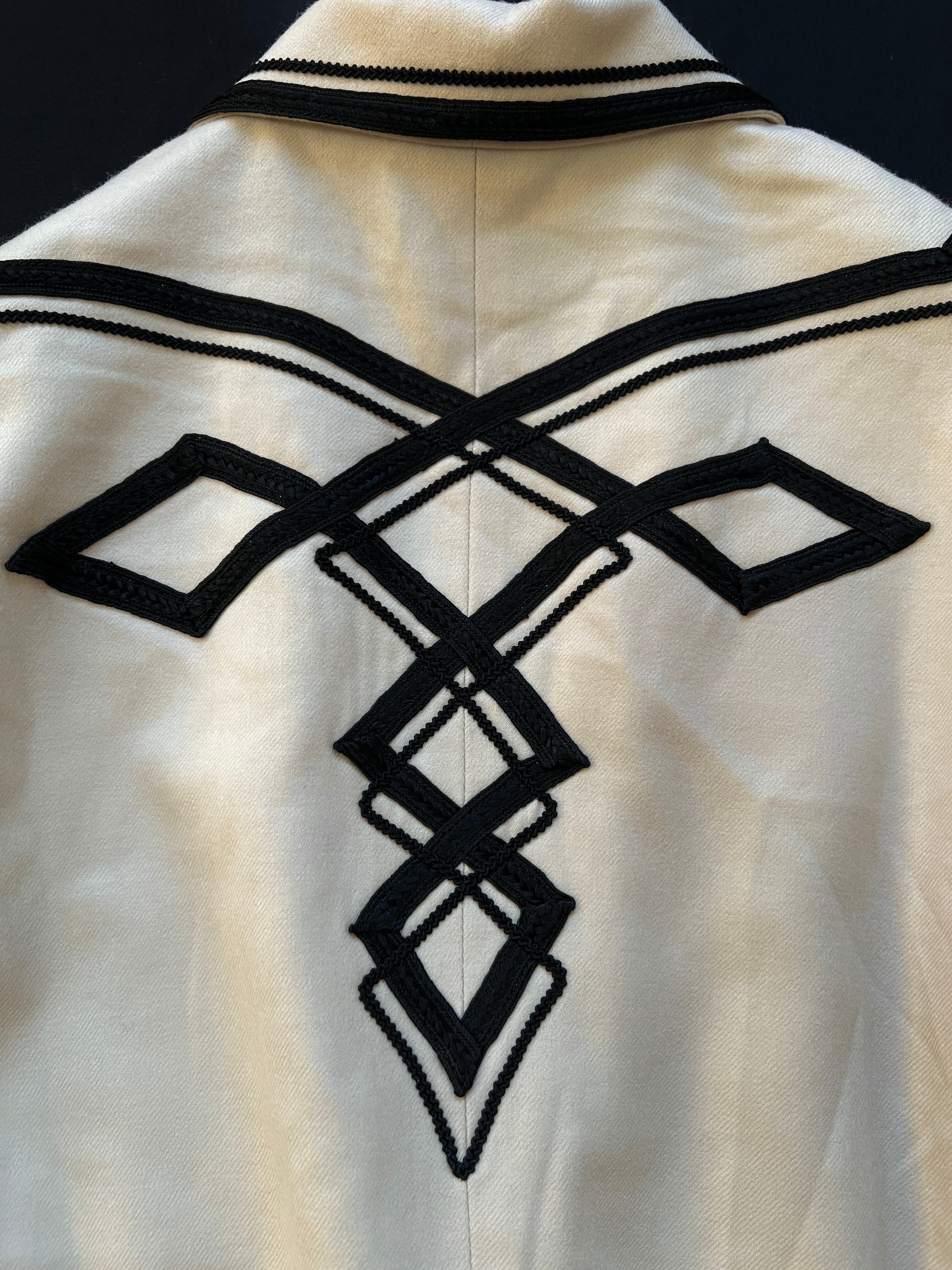一目で目を奪われるのはスカラップ状の刺繍パイピング。単なる装飾ではなく、服の輪郭を縁取るような立体的な刺繍が、当時の卓越したクラフトマンシップを感じさせます
