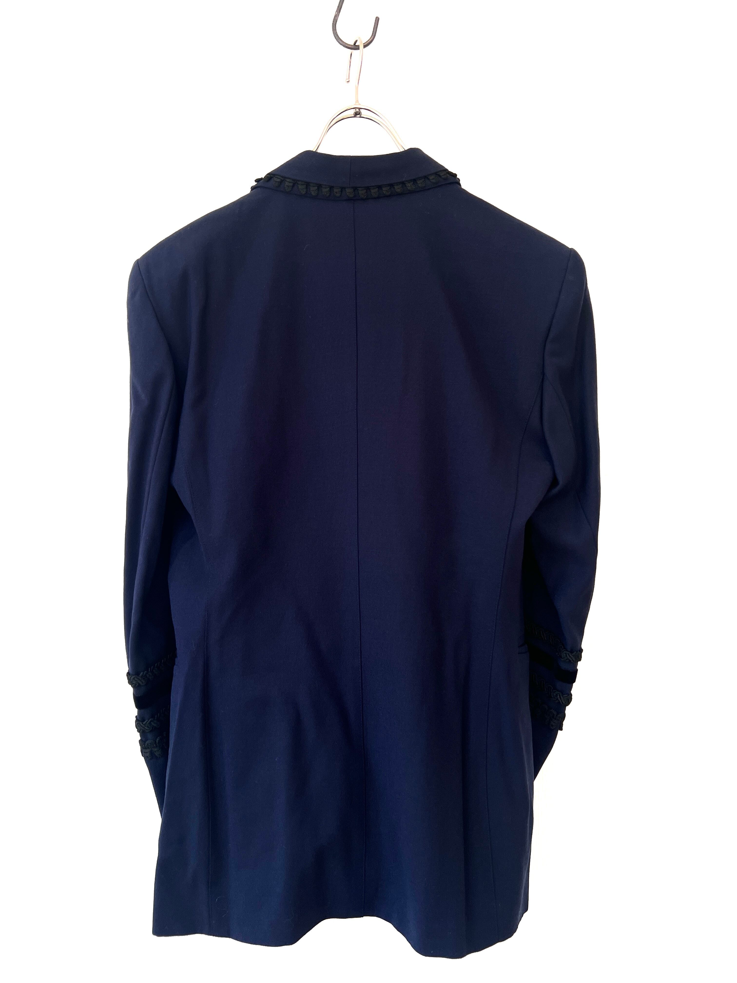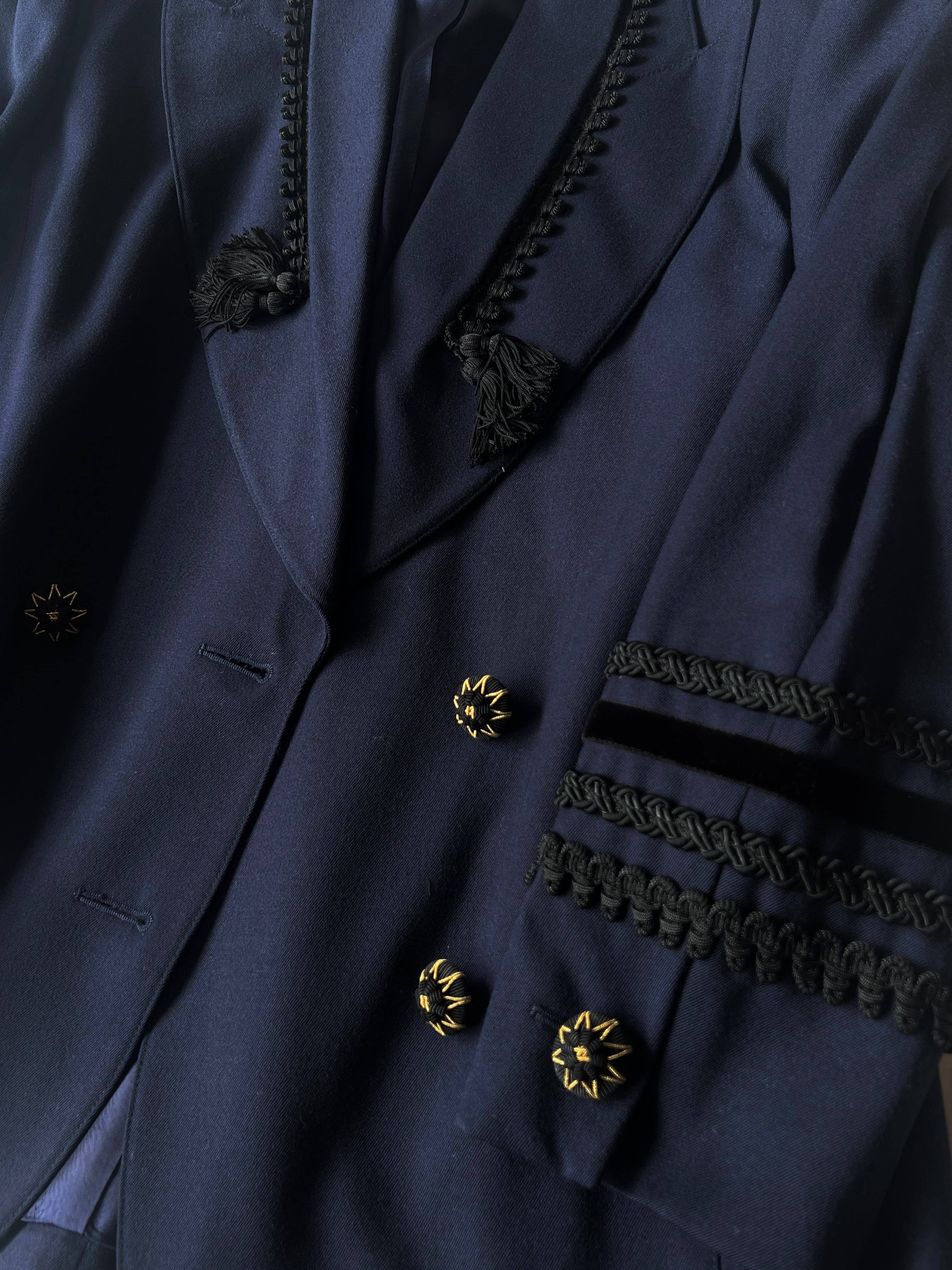 伝統的な軍服や式典服を彷彿とさせる緻密な編み込みと、揺れるタッセルのあしらいは、現代の既製服ではまず再現不可能な手間暇がかけられています。