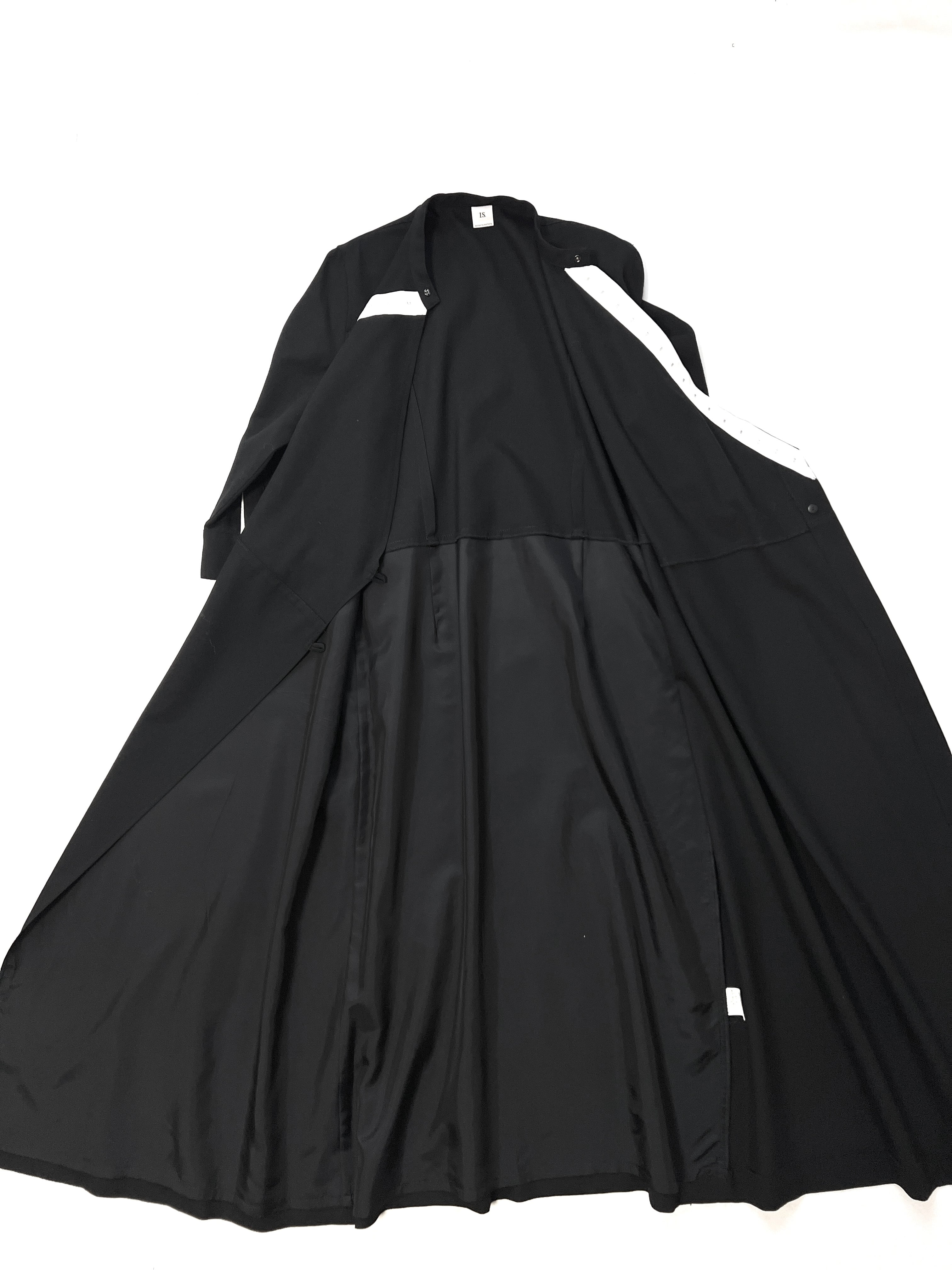 フックを留める数によってシルエットに変化をつけることができ、前を開ければロングコートとしても活躍します。白のラインが視覚的なアクセントとなり、マキシ丈ながら重たさを感じさせない、洗練された引き算の美学を感じる一着です。