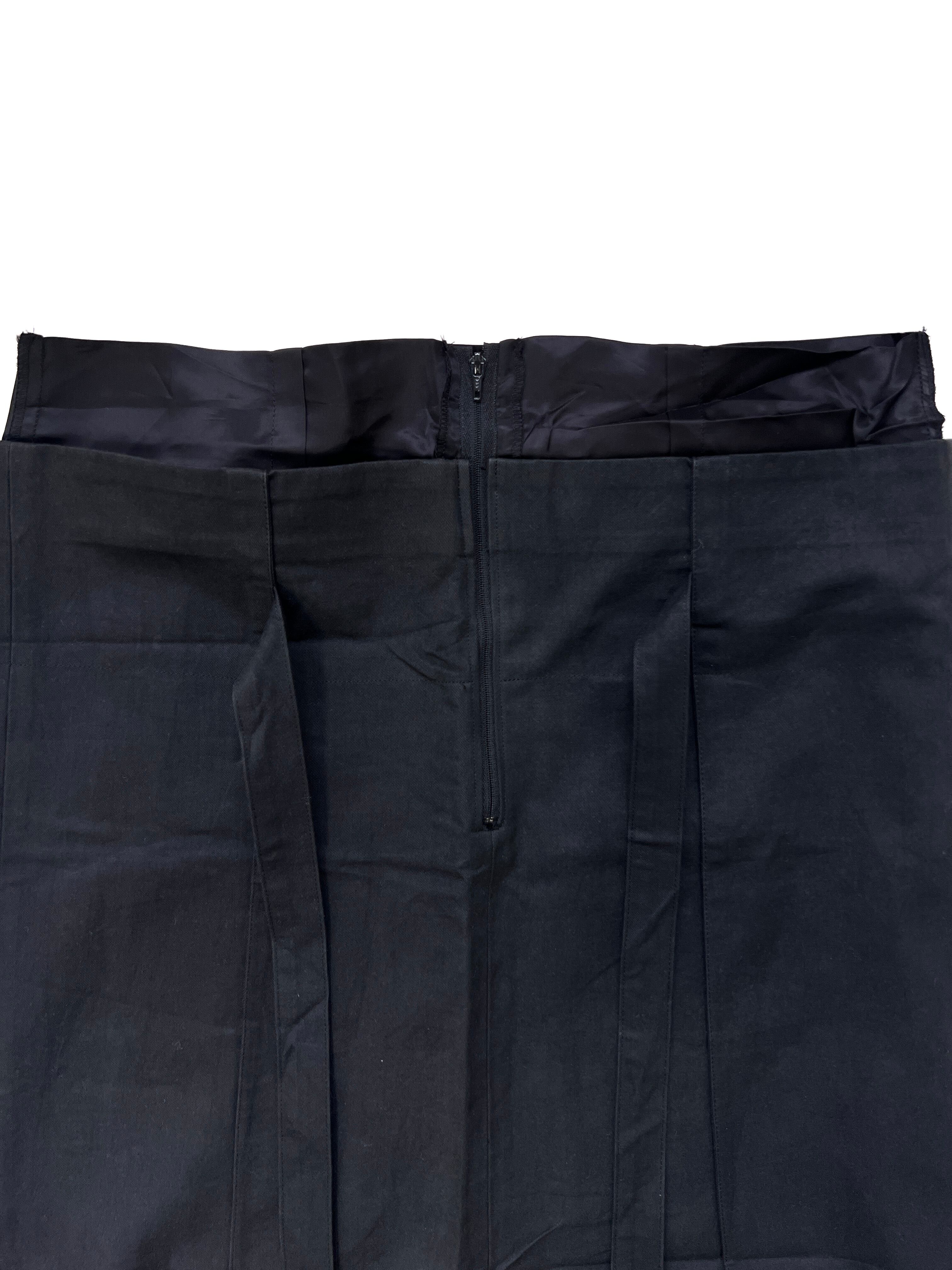 ウエスト部分に段差をつけたレイヤード仕立てにより、シンプルな黒の中に奥行きのある質感。裾に施された深めのスリット。