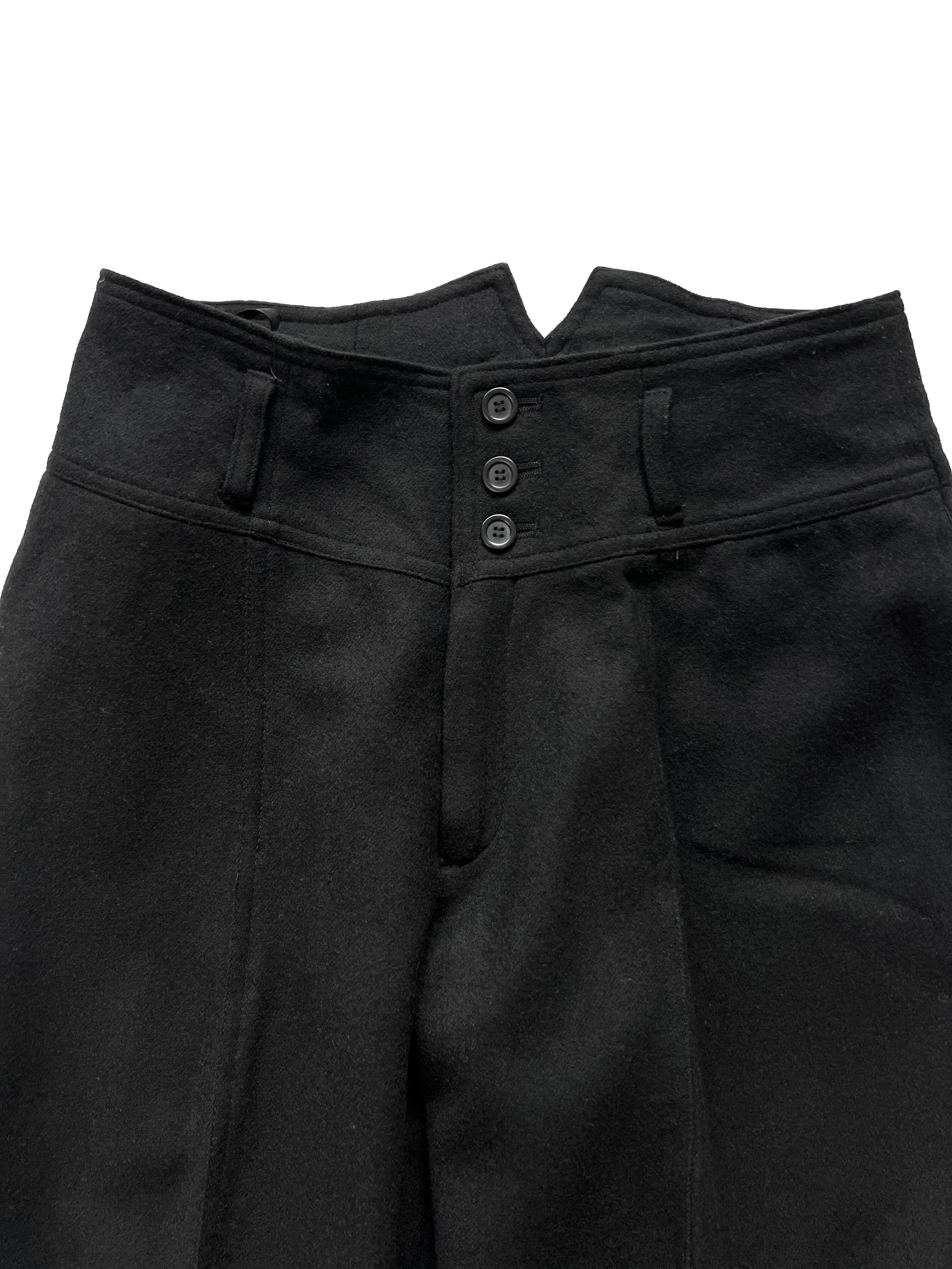 ライトなメルトンウール素材の立体的な構築美。ハイウエストの3つボタン仕様と、背面をクロスさせたV字のウエストラインが、コルセットのようなタイトで美しい腰回りを演出します。