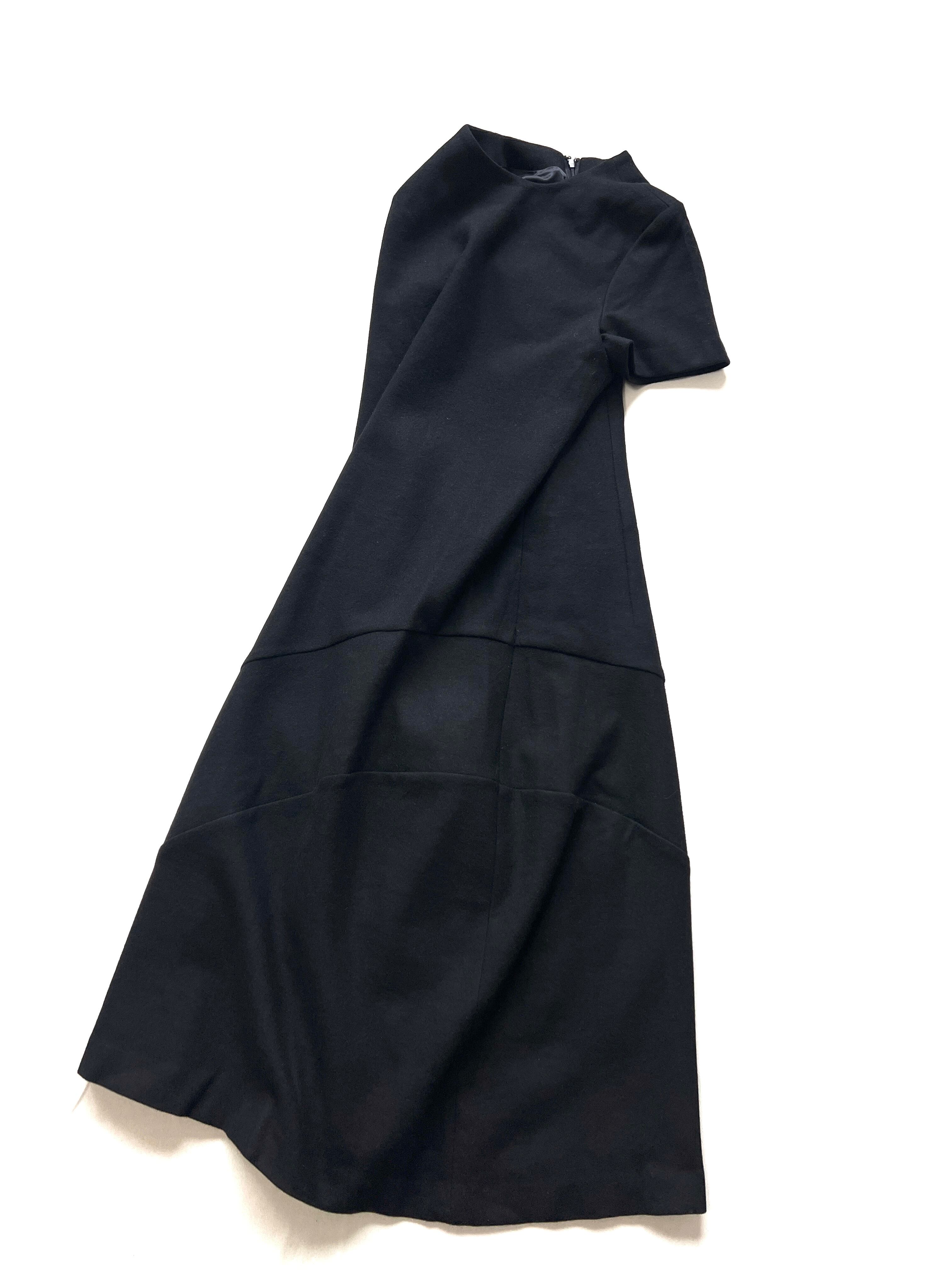 ヨウジヤマモトの流れをくむアルファスピン。重厚なメルトン素材を贅沢に使用したアシンメトリー・マキシドレスです。
