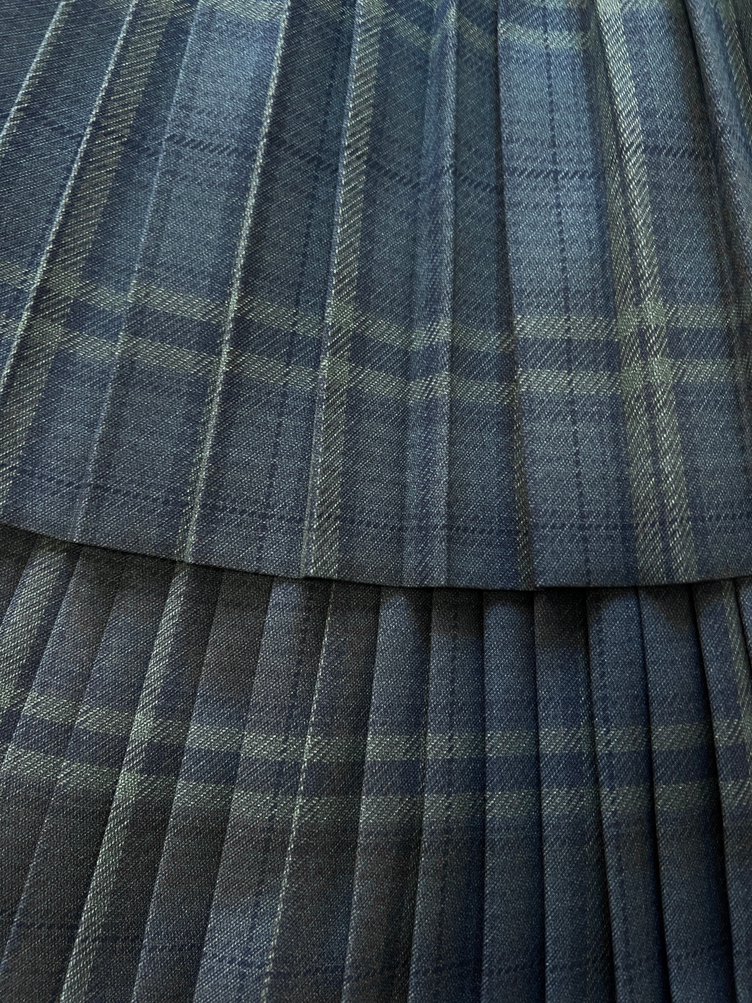 右サイドには、歩くたびに波打つようなボリュームを放つ、2段構成のドラマチックなタータン・ティアード。対照的に左サイドには、無機質でクリーンな表情のエプロンパーツを配しました。