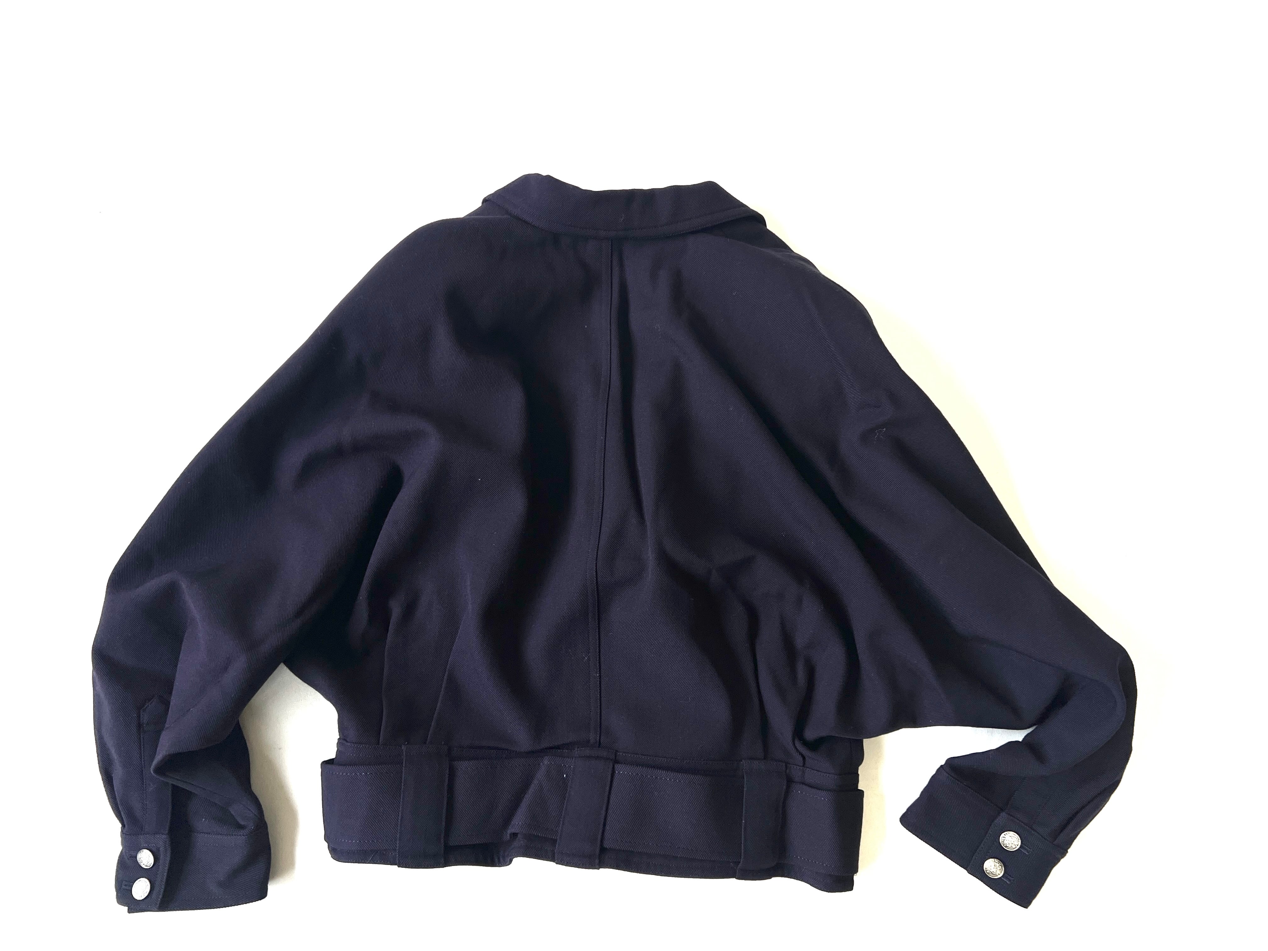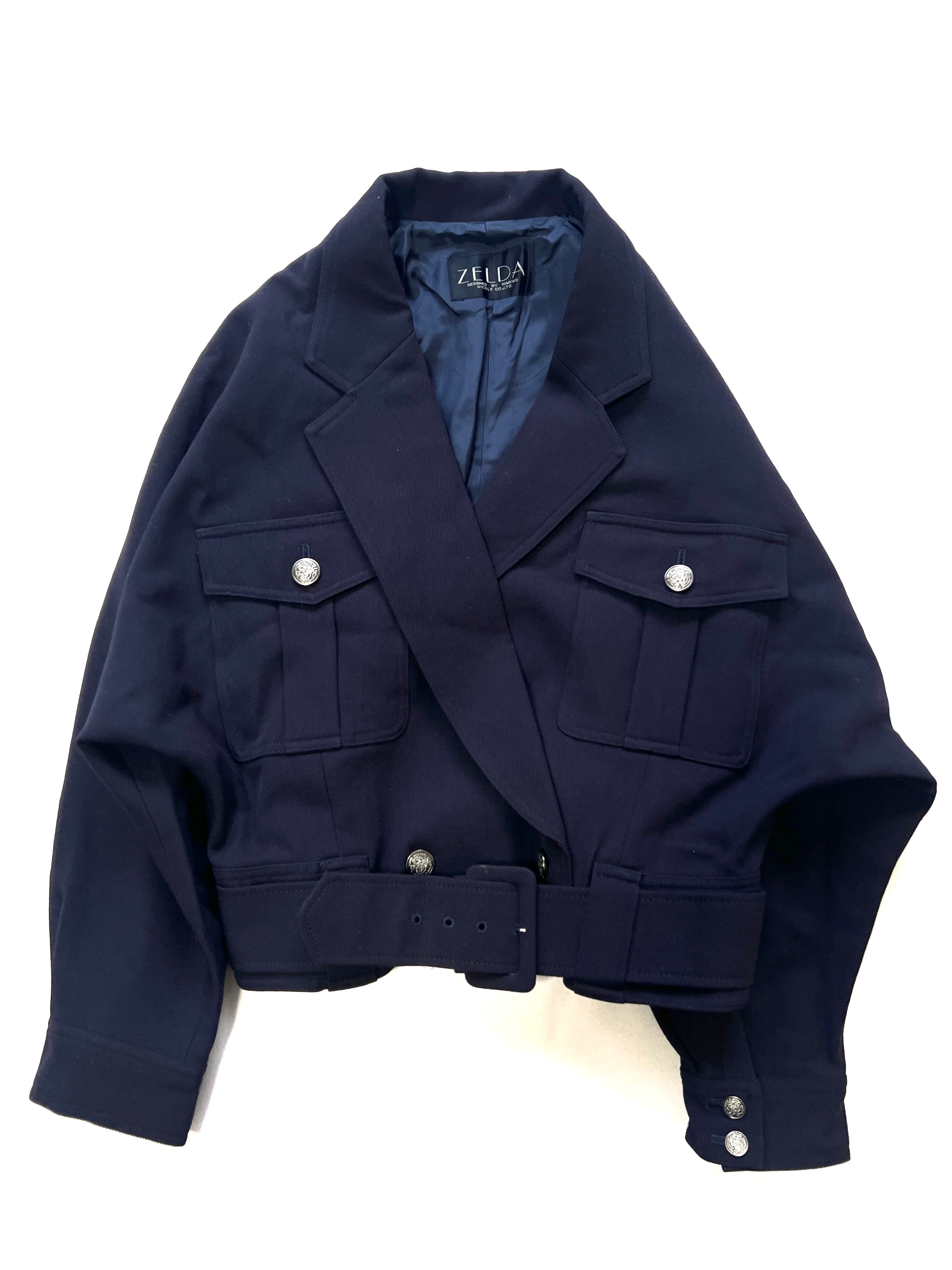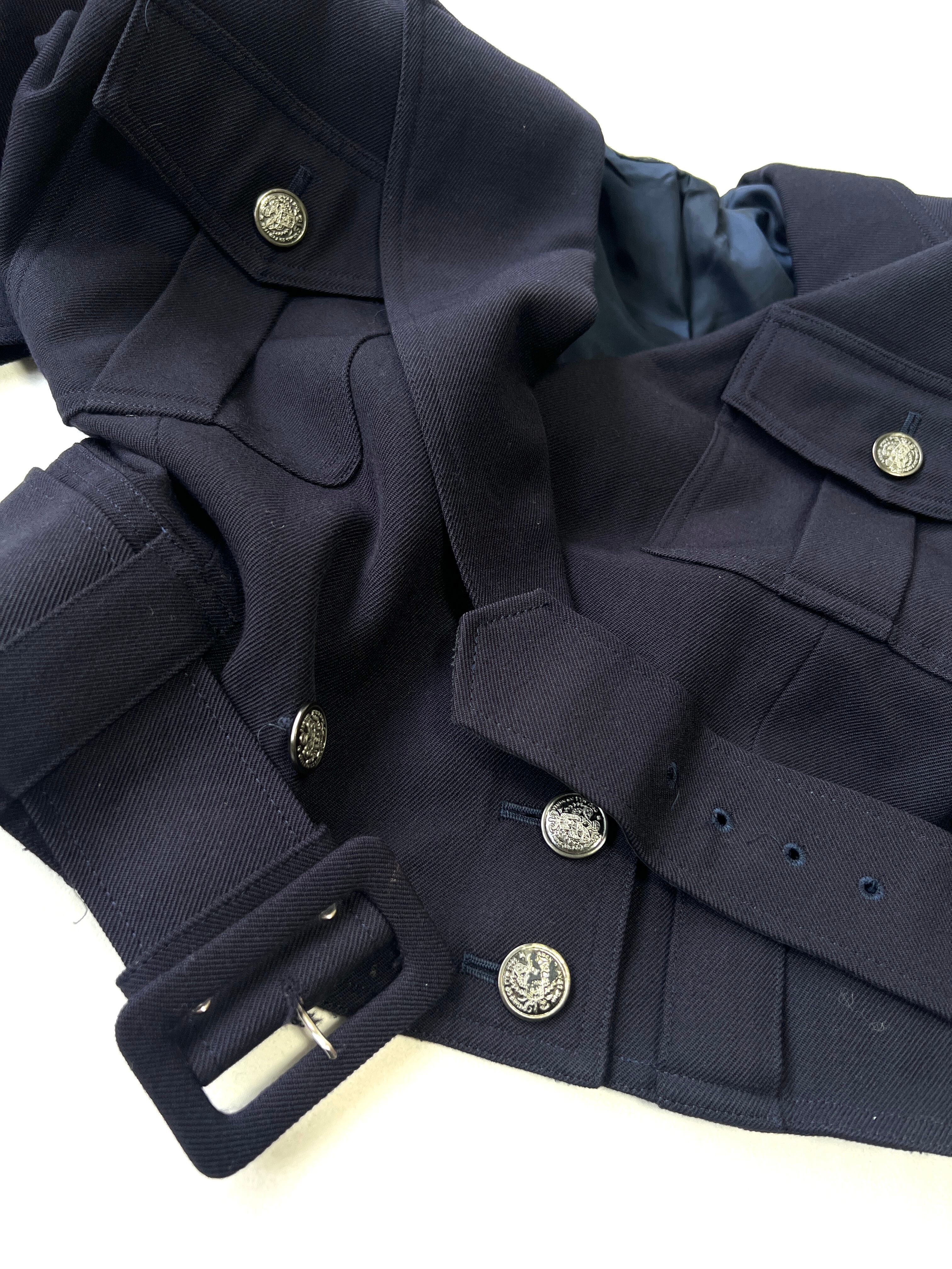 象徴的なワイドベルトは、ウエスト調節でジャケットの裾をブラウジングさせることで、ドラマチックなシルエットを生み出します。