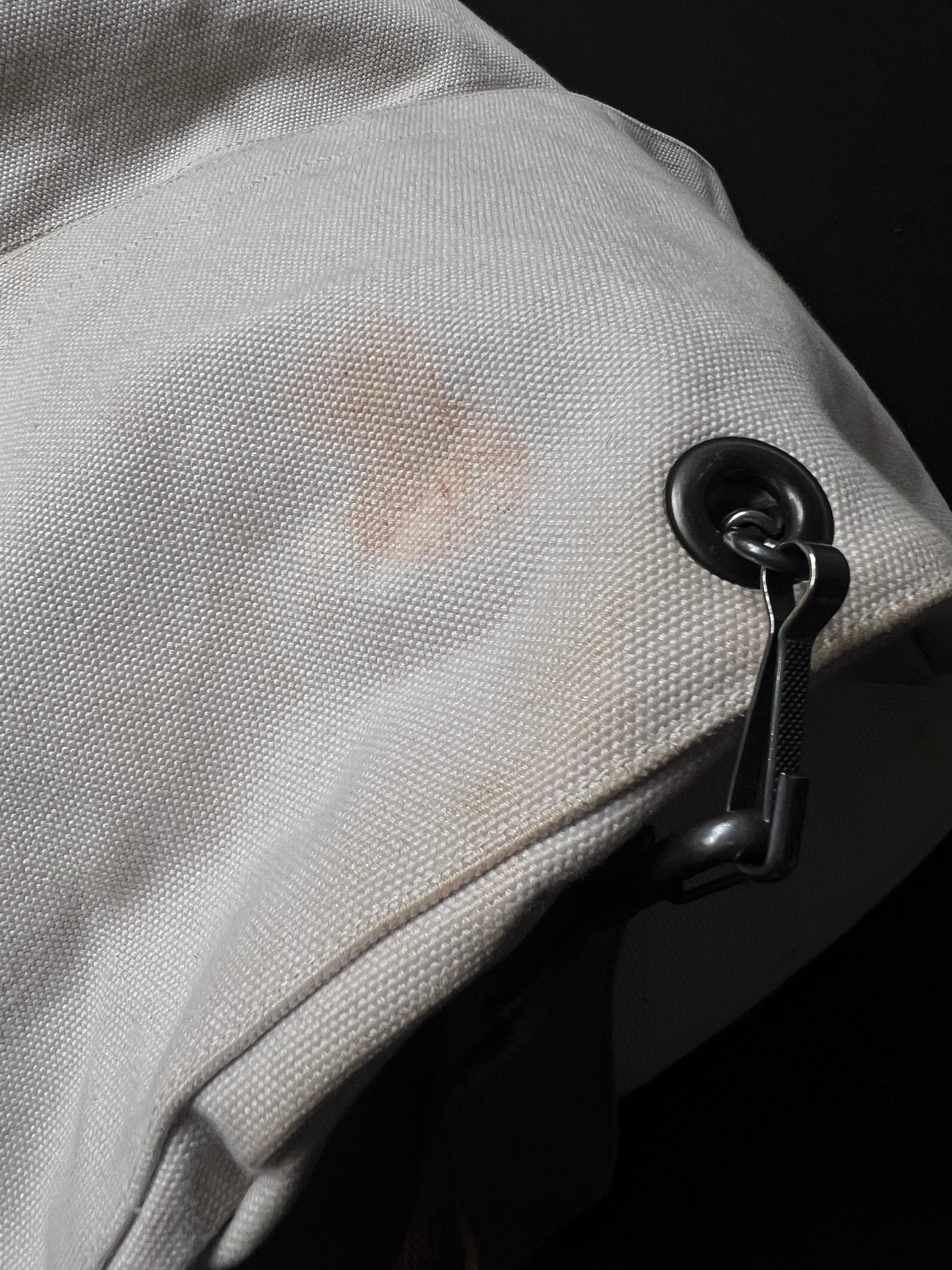 ショルダーの付け根に僅かなホツレがあります。また帆布特有の使用感や汚れがあります。