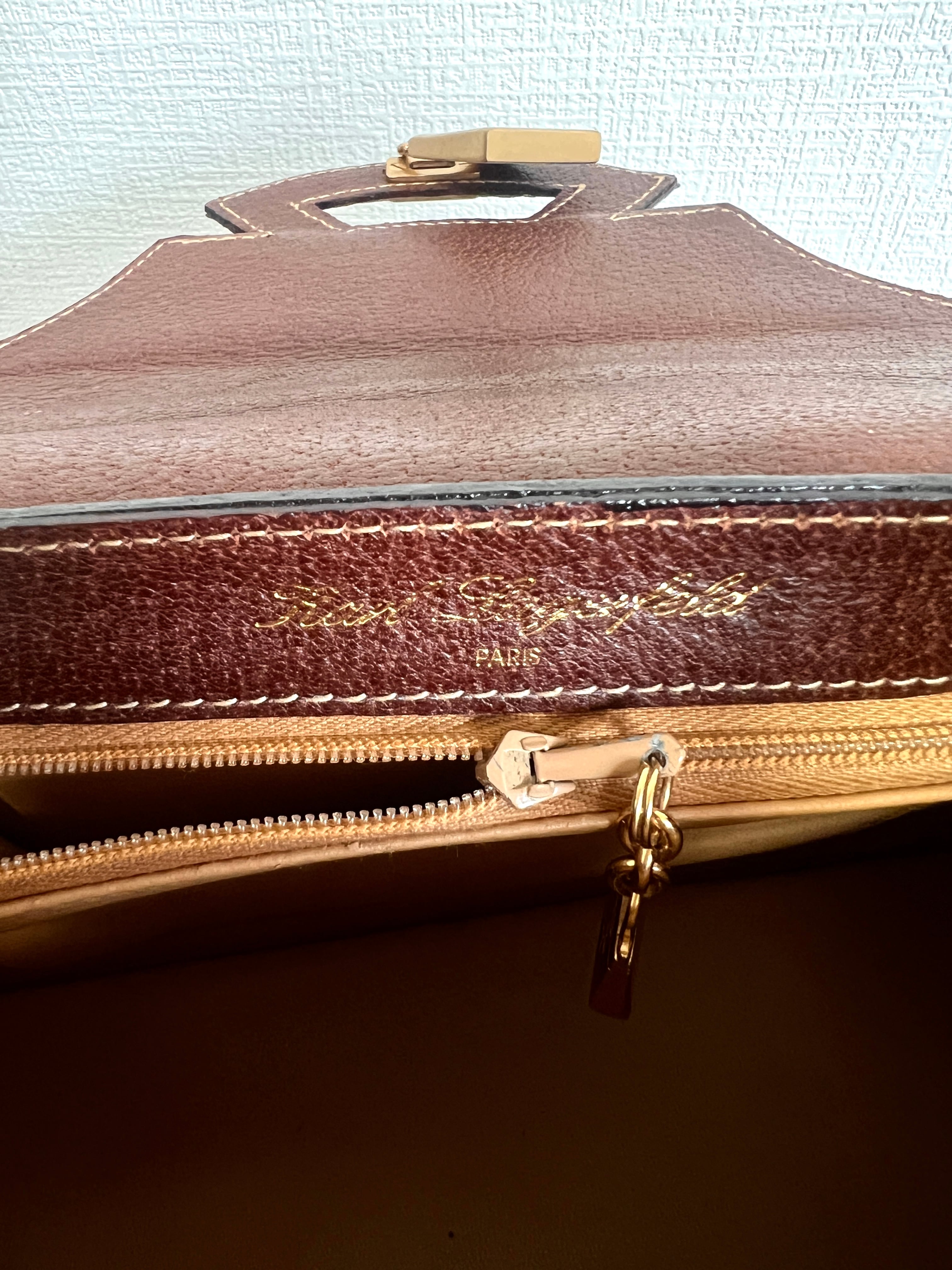 滑らかな質感のブラウンレザーと、構築的で気品あるシルエットが融合したデザイン。フロントの扇モチーフは単なる装飾ではなく、フラップポケットの留め具としての役割も果たしており、当時のラガーフェルドらしい遊び心と美学が詰まっています。