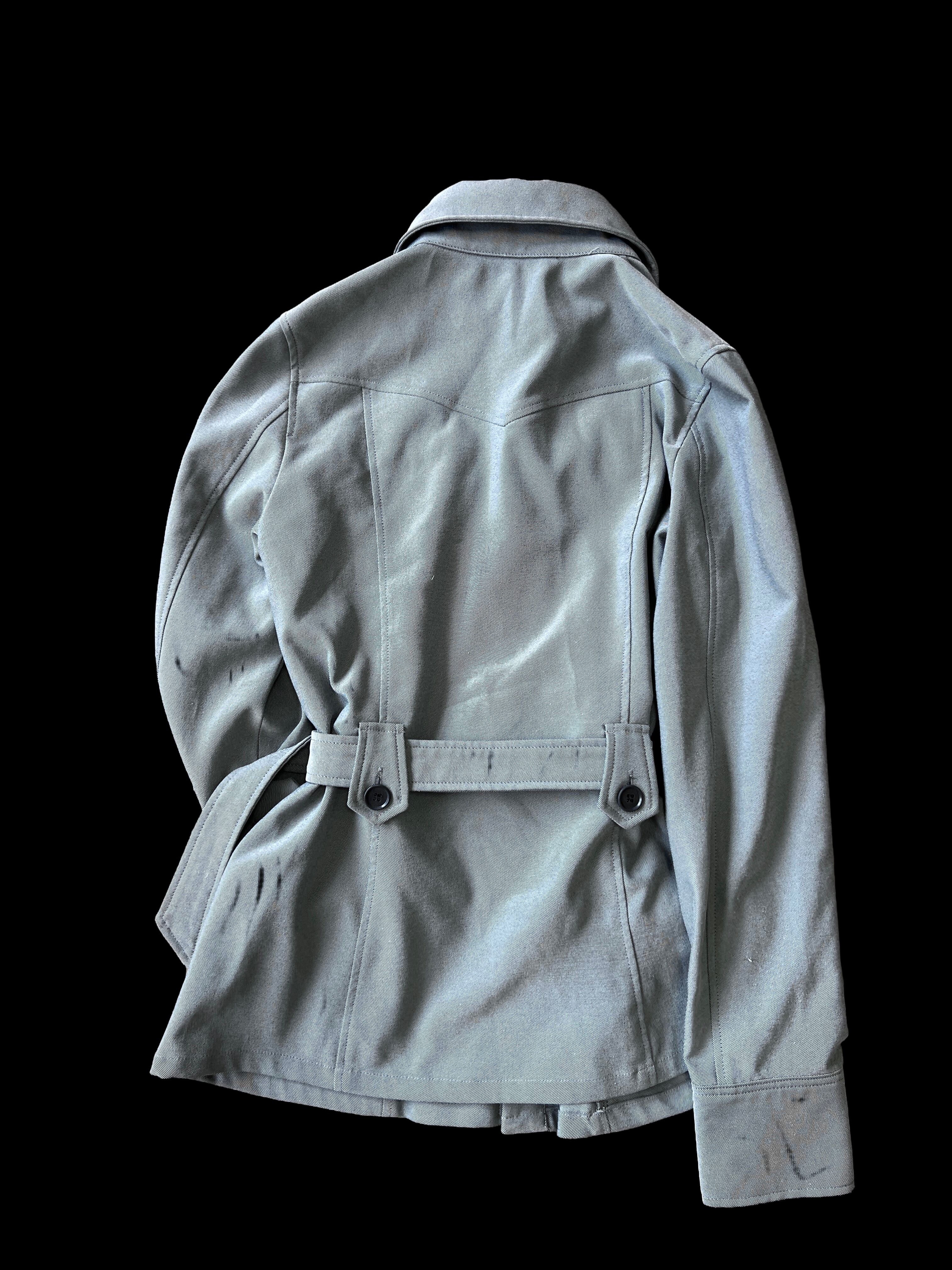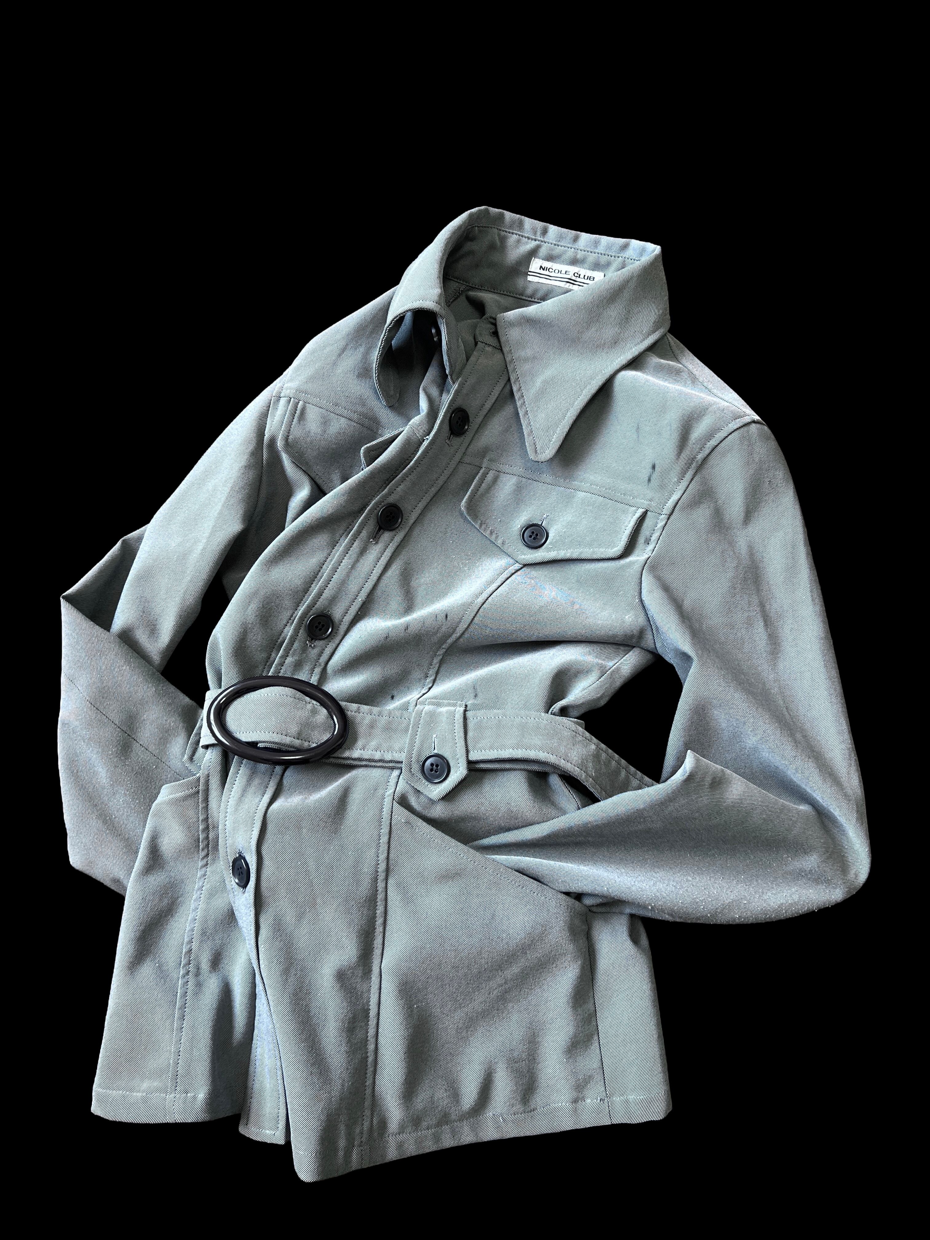 70年代のクラシックなサファリルックを彷彿とさせる大きな襟やウエストマーク。そこに、90年代らしい光沢感のあるストレッチ素材を乗せることで、ヴィンテージの風格と現代的な着心地を両立させています。