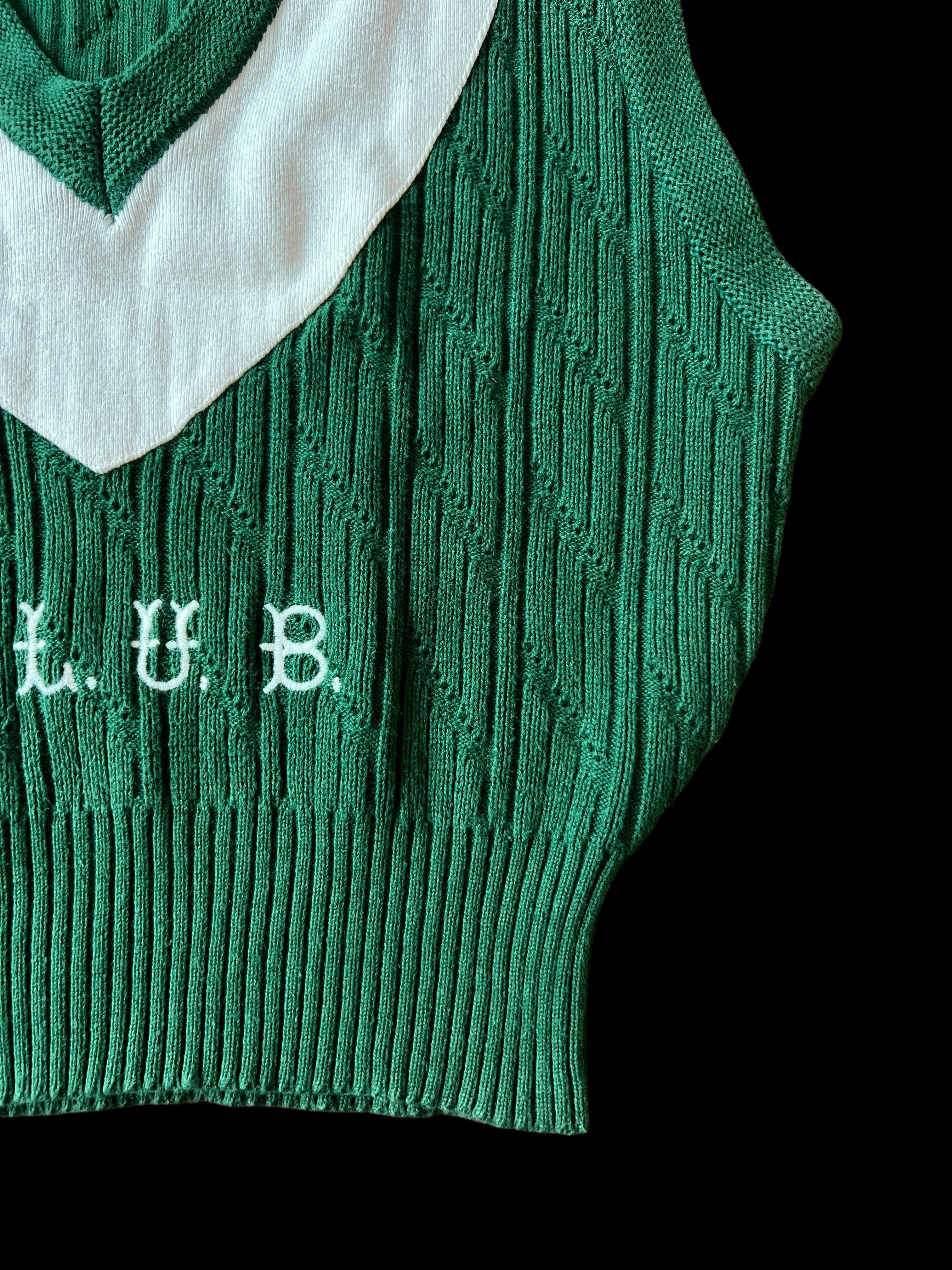 発色の良い鮮やかなグリーンをベースに、首元の白いV字配色が効いた、プレッピーな一着。立体的なケーブル編みが、さらにクラシックな雰囲気を高めています。