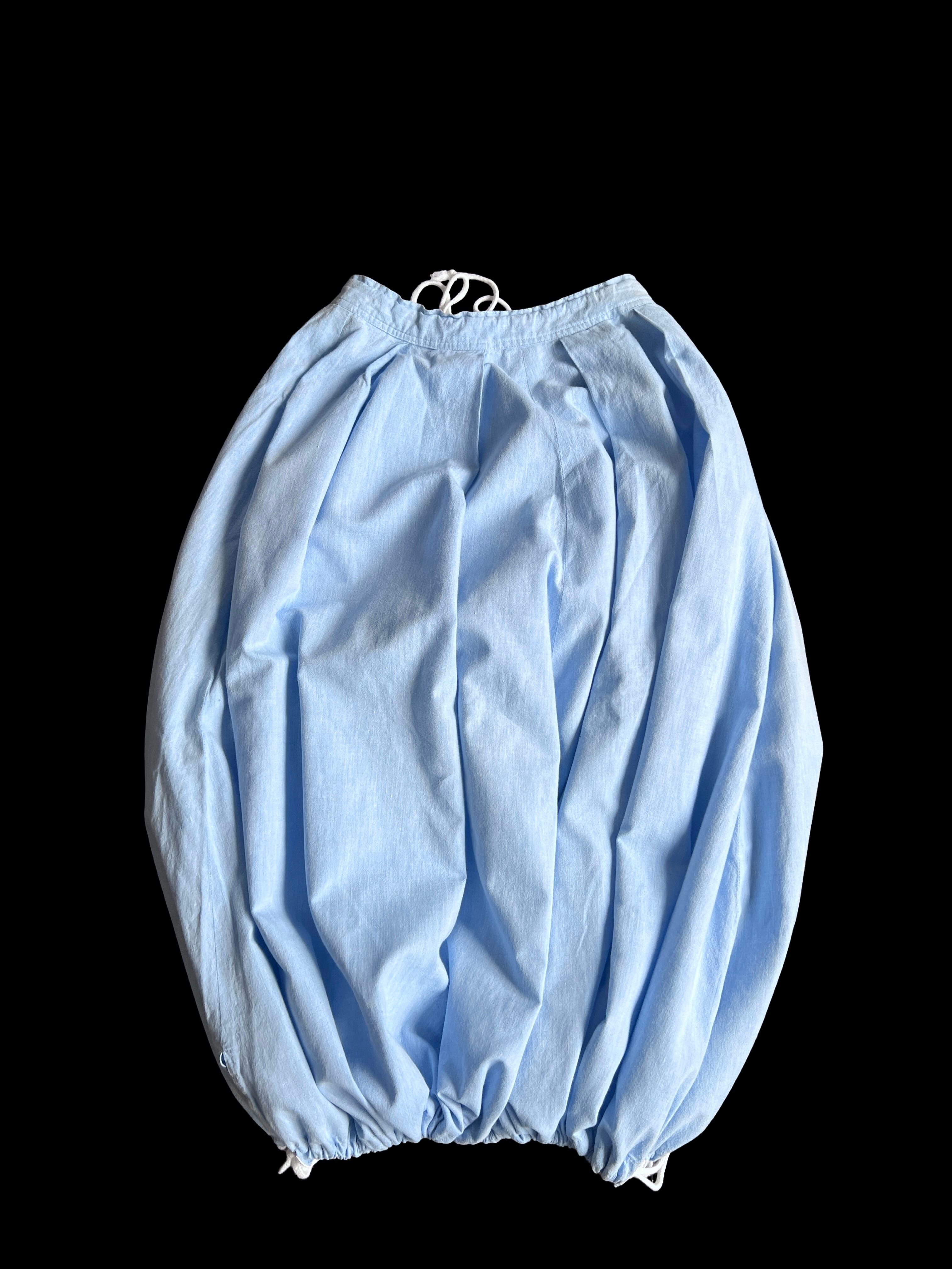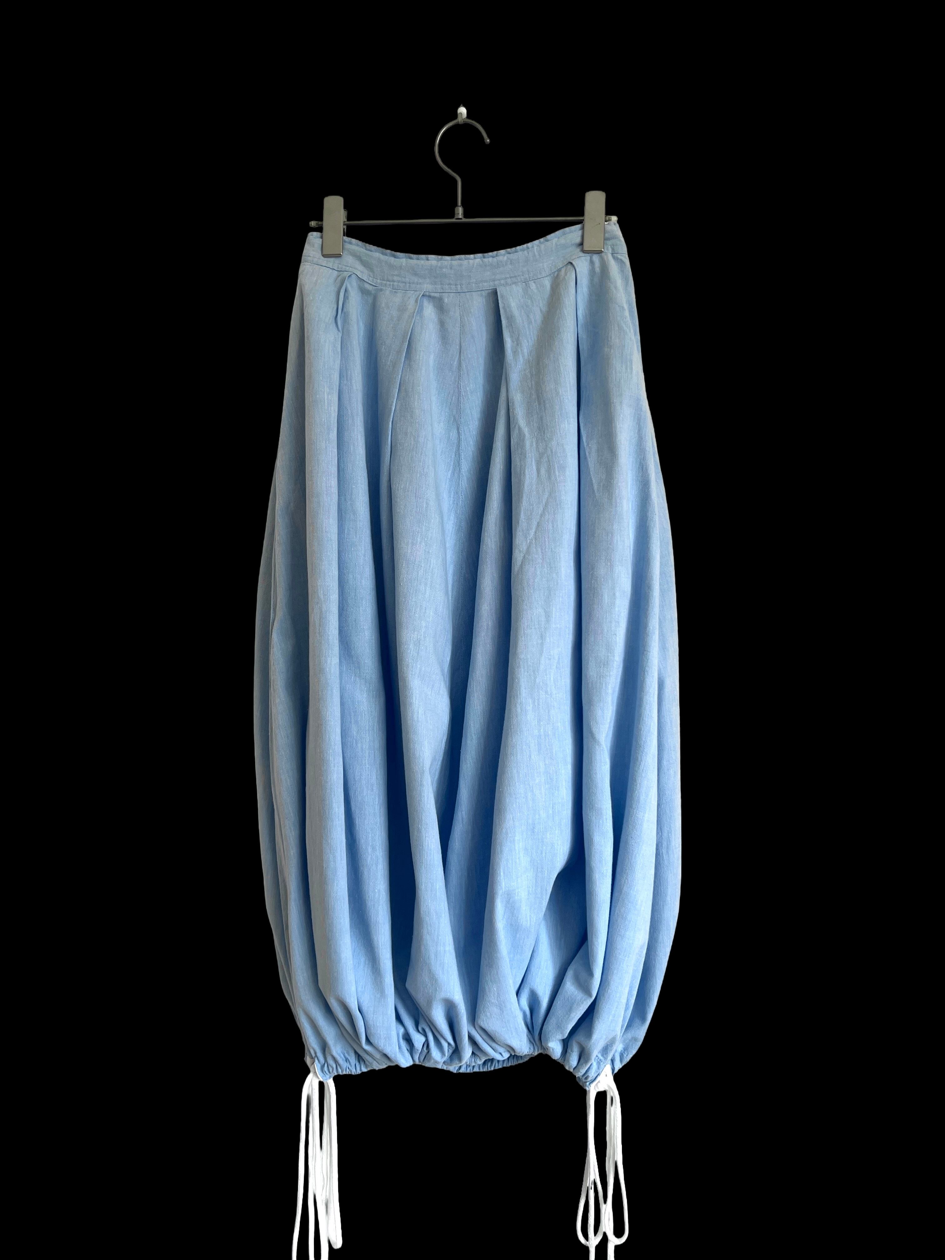 裾の両サイドにドローストリングが施されています。紐を絞ることで丸みのあるバルーンシルエット、紐を緩めることでワイドなフレアシルエットの2通りを楽しめます。