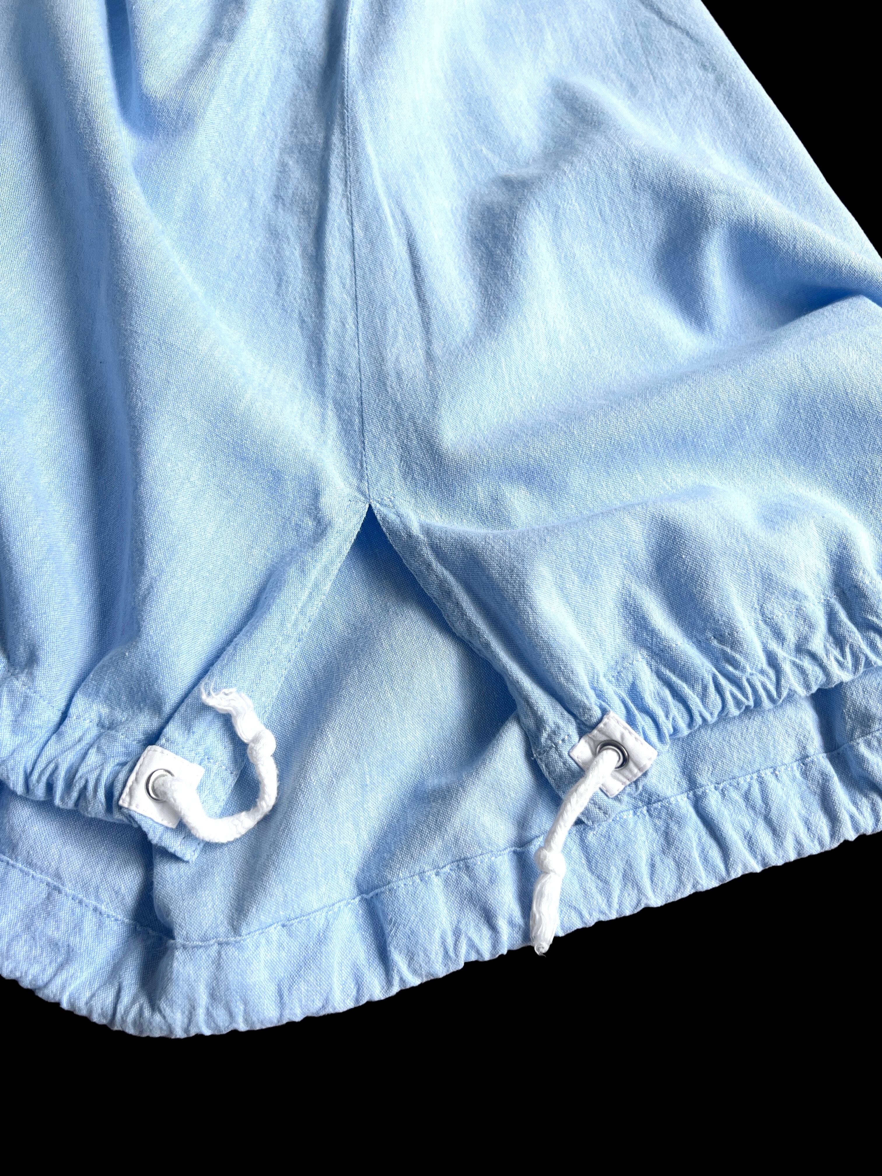 ウエスト・裾両サイドドローストリング、フロントボタン、サイドポケット