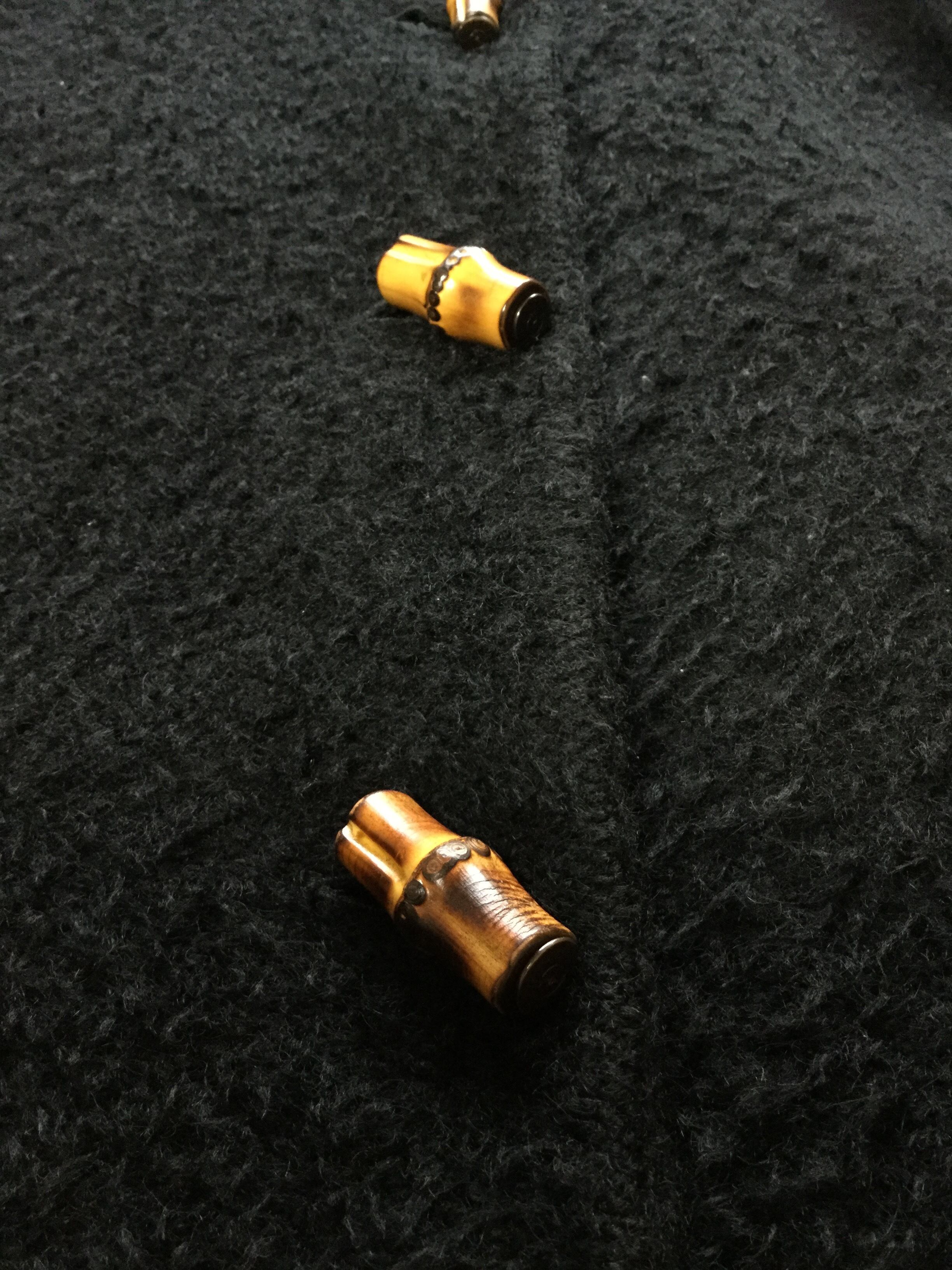 上質なモヘアベースのブラックコートにクラシカルなバンブーボタンを配した