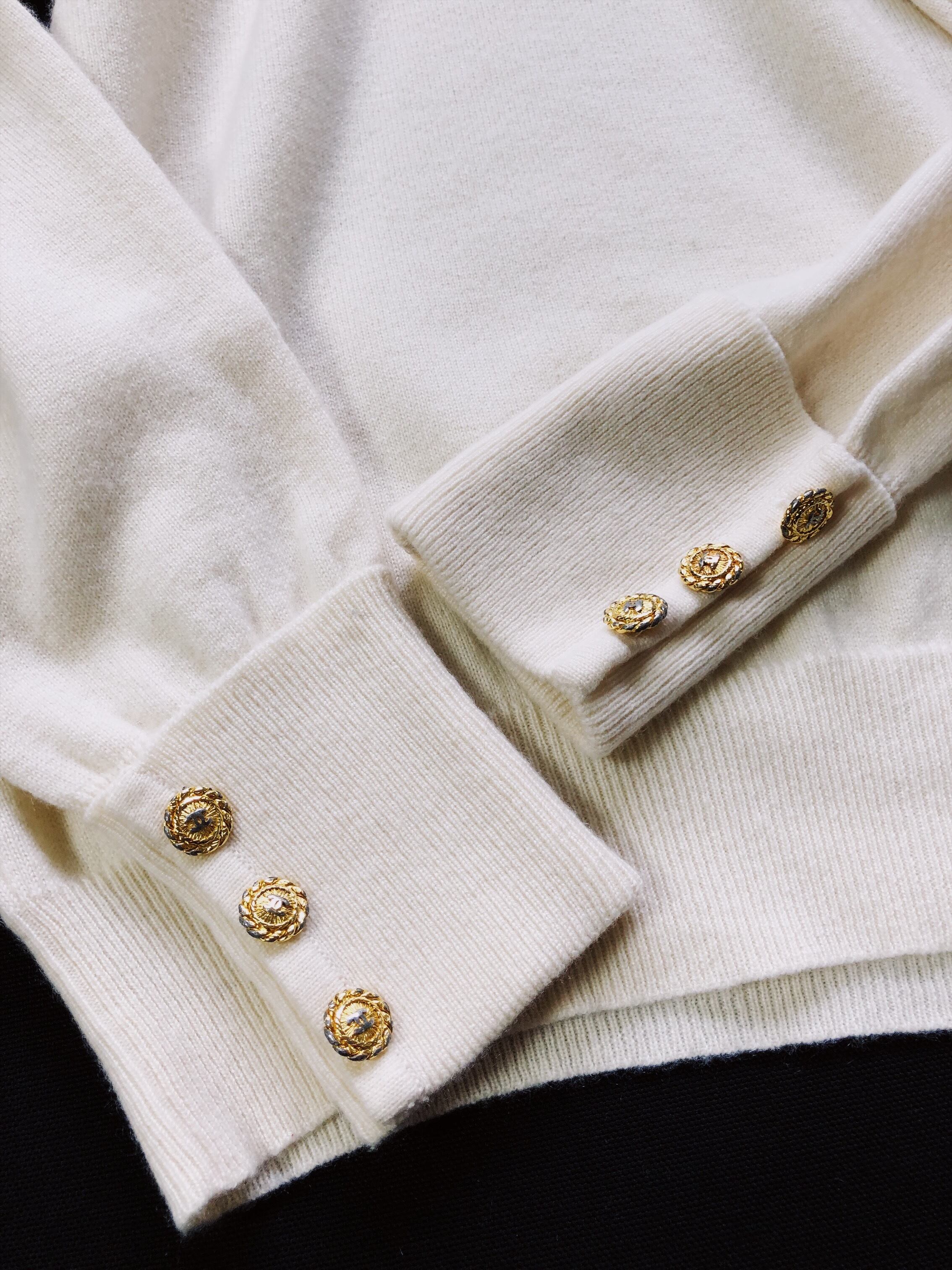 袖口はロールアップされたレイヤードデザインにCOCOボタンを左右に3つずつ、