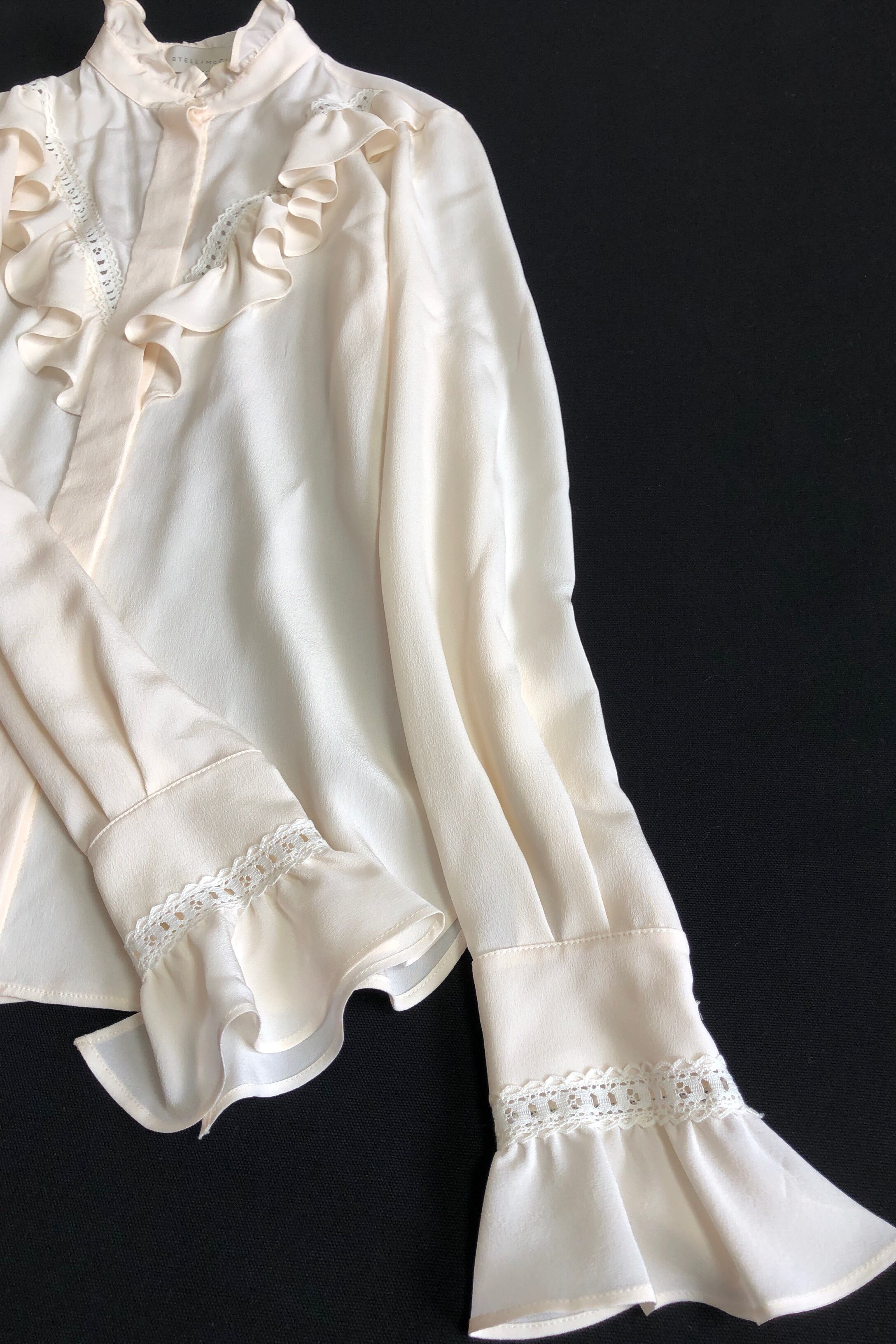 ◆スタンドカラーの襟元に配したソフトなフリル襟、ヴィクトリアン調の大胆なラッフル装飾にレースのトリミングを組み合わせたフロントのVライン、袖口にはレースをあしらいフレアした大振りのラッフルカフスが一際目を惹くデザインです。