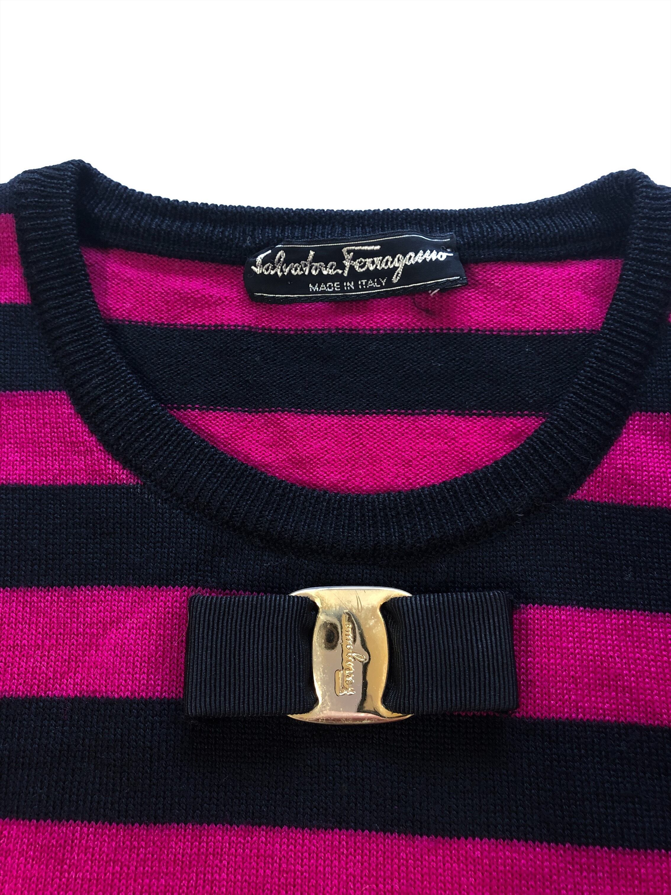 ◆発色の良いピンクボーダーのハイゲージニット、胸元にボウタイのような varaリボンをあしらった可愛いデザインです!!