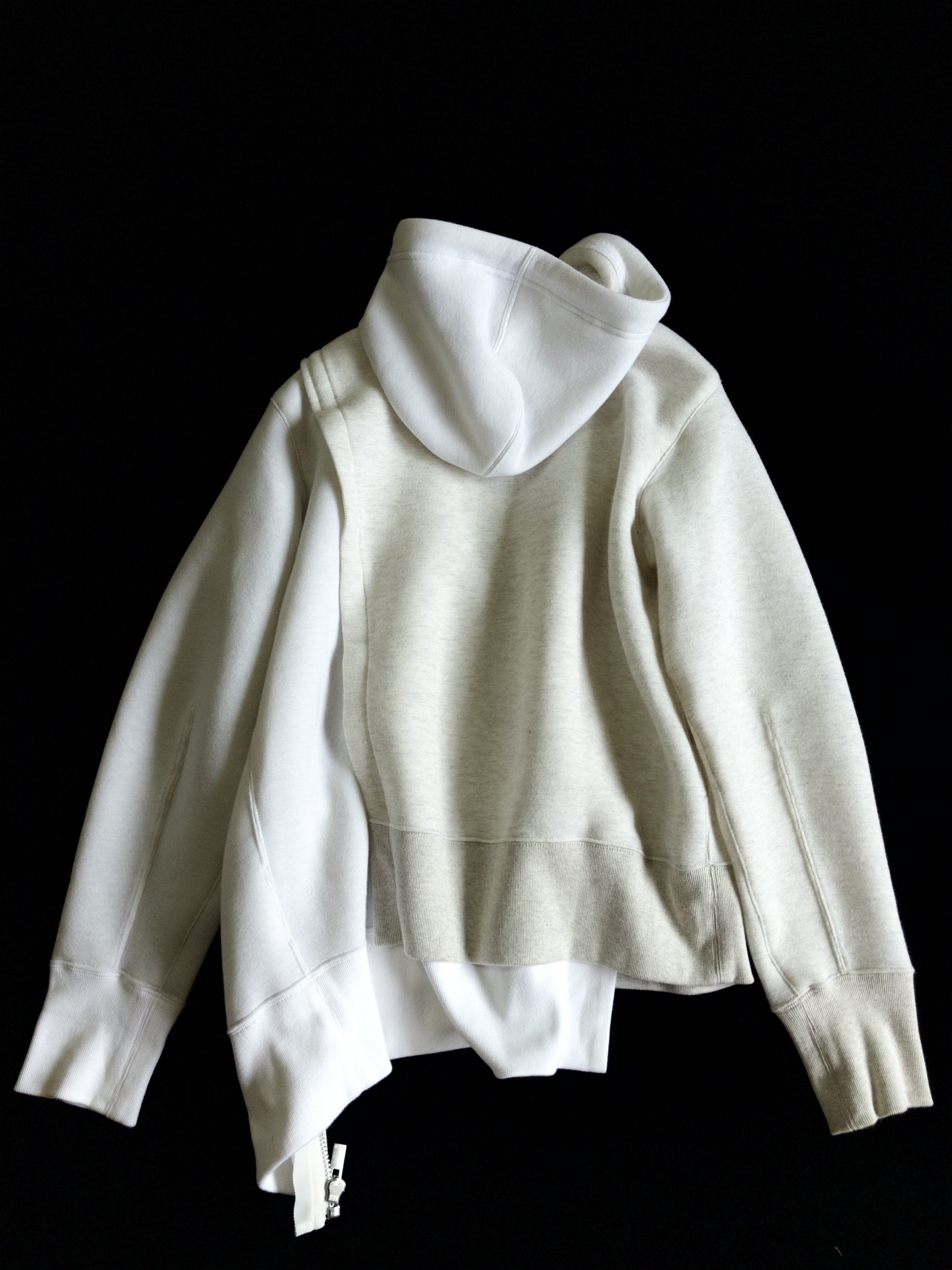 フーディスウェットとクルーネックスウェットのトリッキーな移植によるアシンメトリーなデザイン