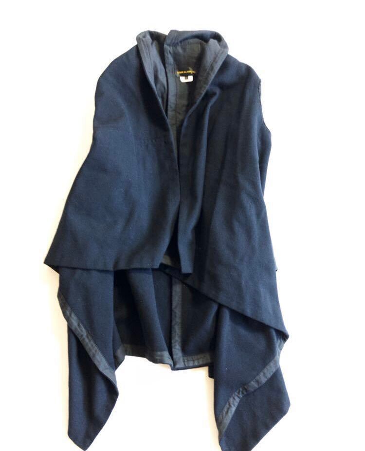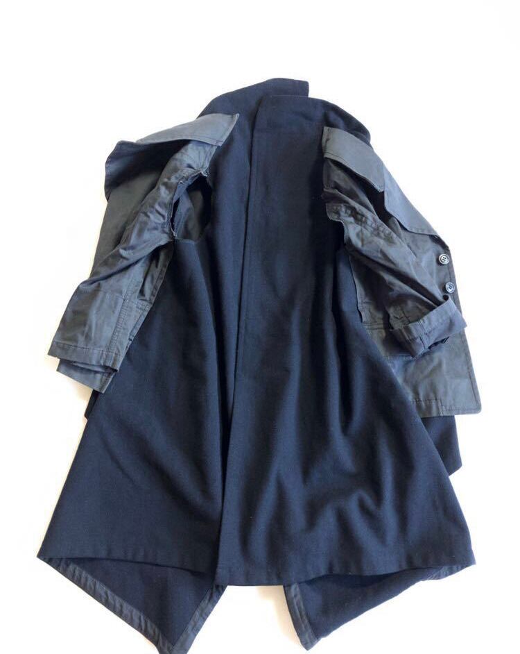 コットンジャケットを解体し厚手のウールケープとドッキングさせたギャルソン得意の変形デザインです。