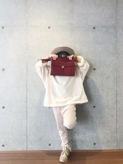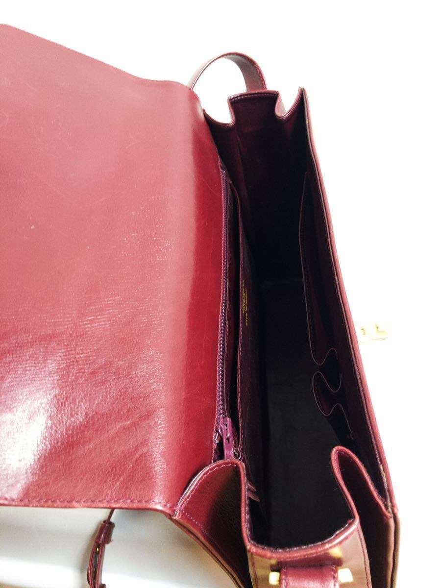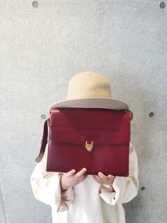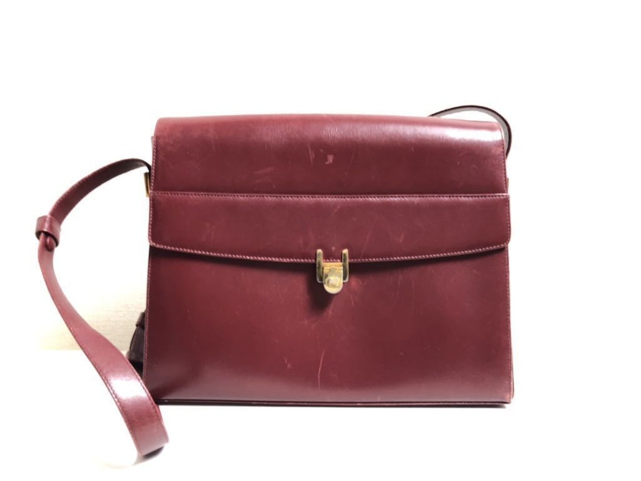ボルドーカラーに角のあるフォルムやターンロック金具がクラシカルなデザインです。
