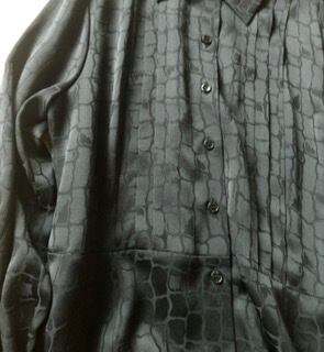 トップは前後にプリーツを利かせたドレスシャツ風のデザイン、エレガントなマキシ丈はボタンを開けて羽織として着用しても洒落かと思います!!