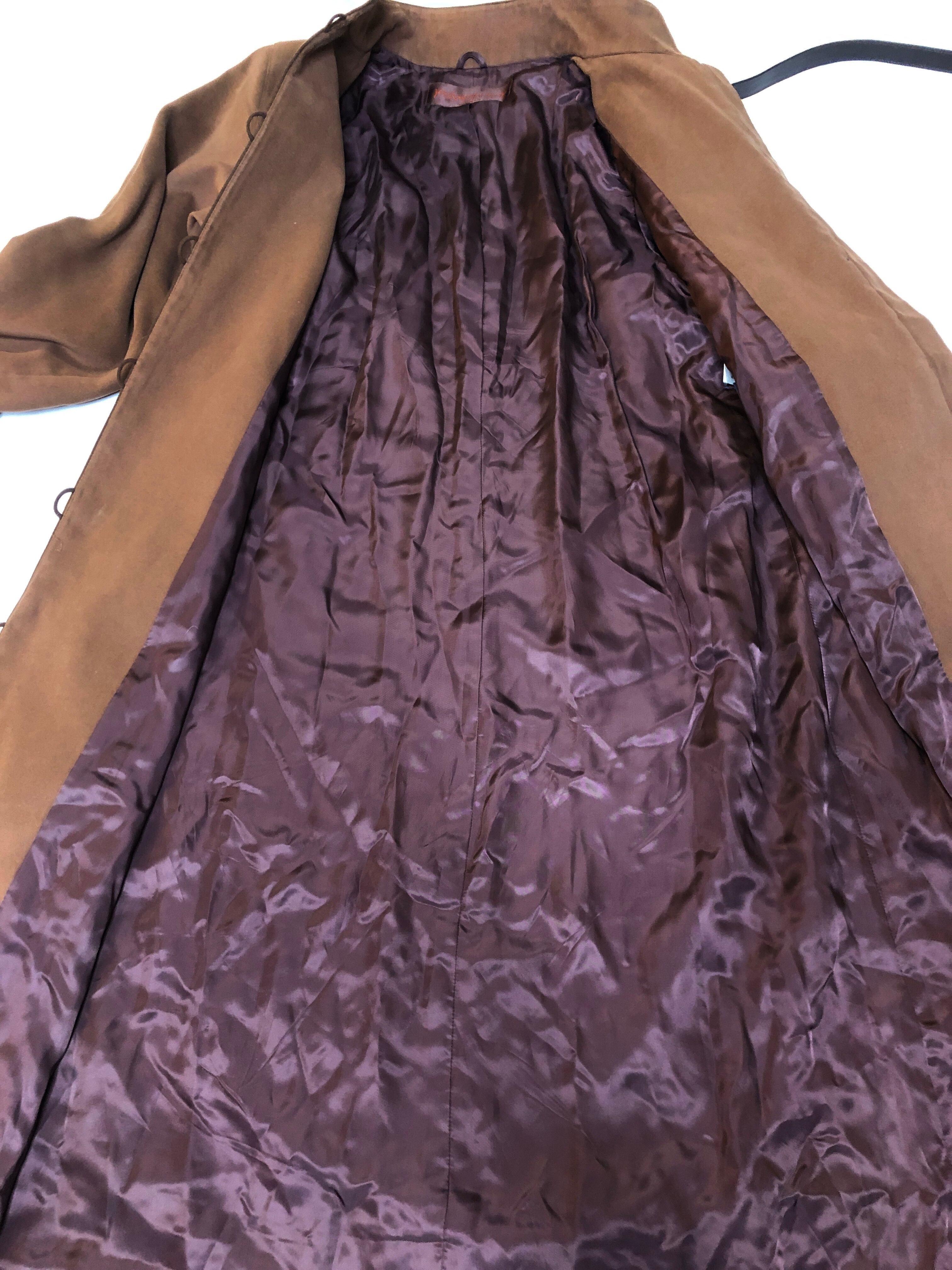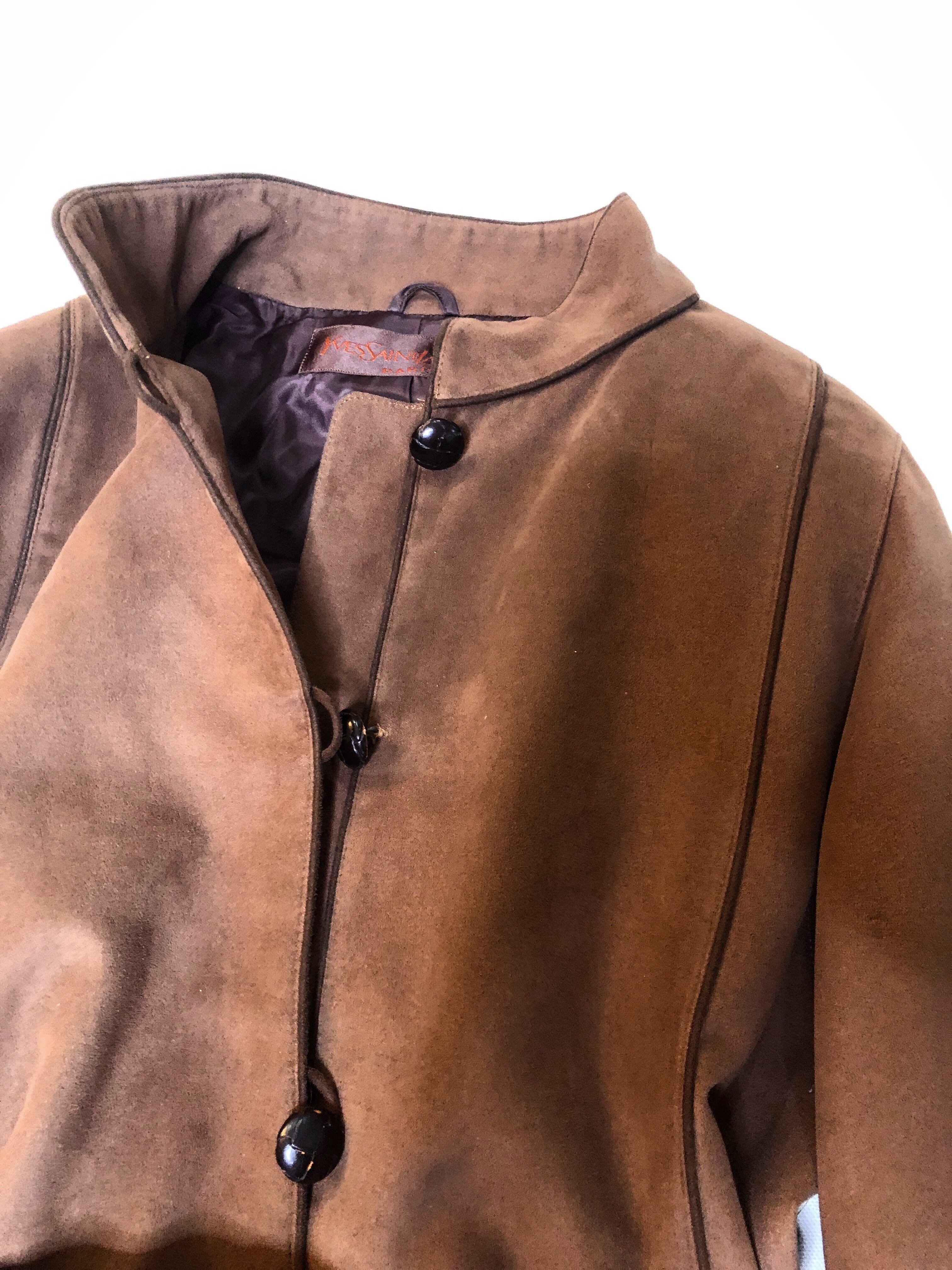 程よいブラウンのフェイクスウェードにトリミングを施し、胡桃ボタンを配したレトロなデザインです。