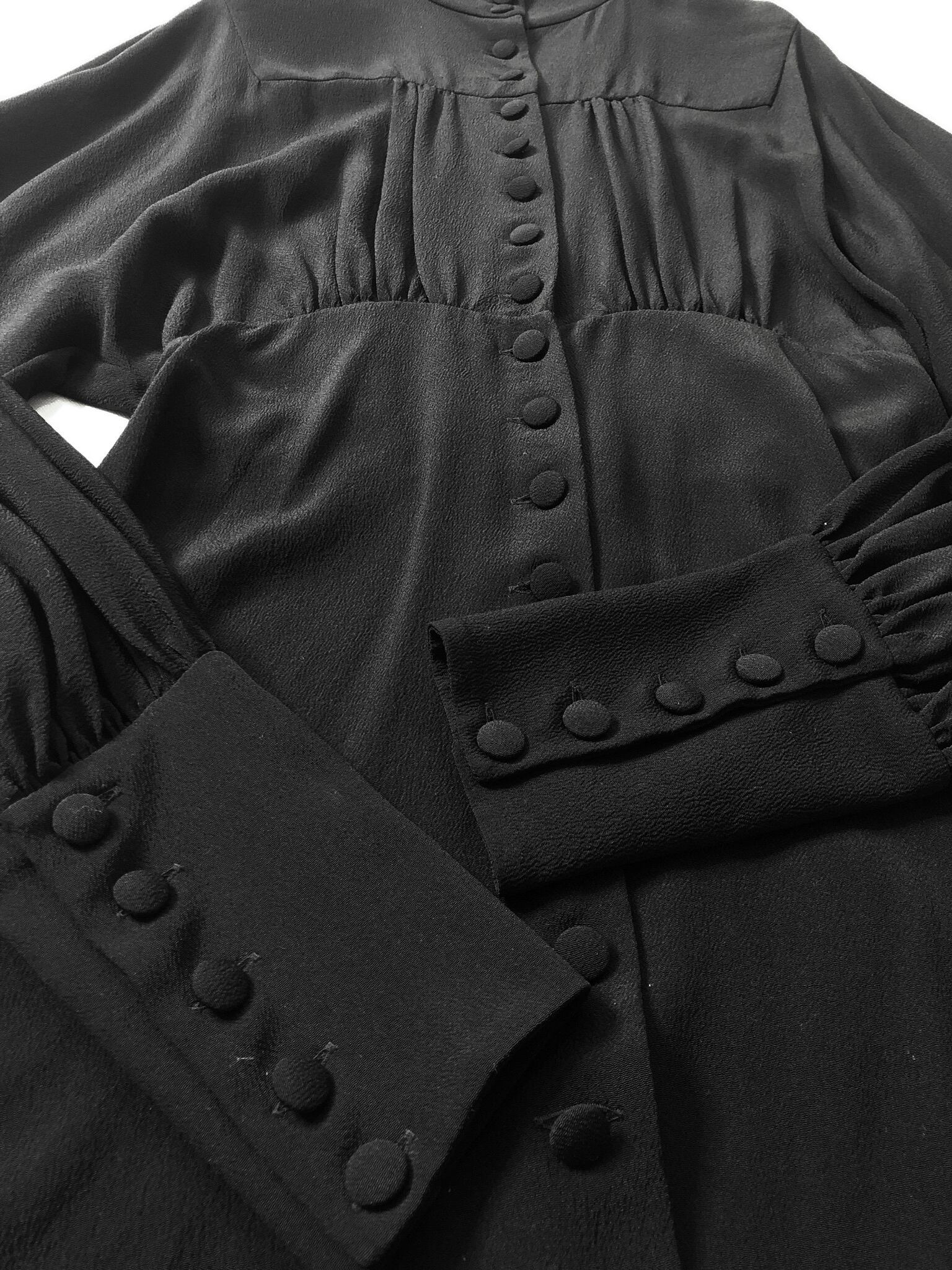 ラウンドハイカラーに前後ヨークやギャザー切替、ボリュームスリーブからの袖口はロングカフス、