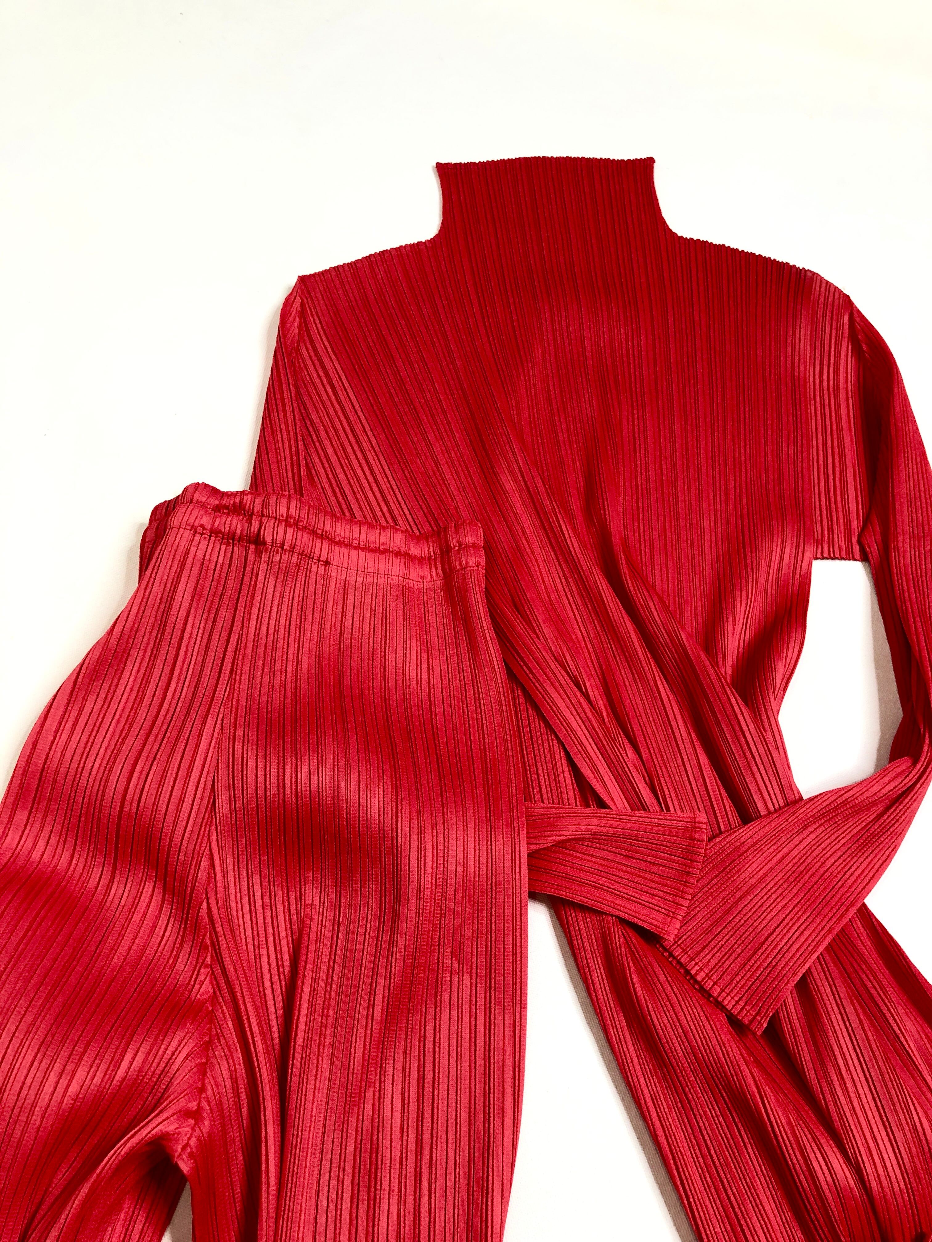 伸縮性のあるプリーツに赤が映えるトップス&パンツのセットです。