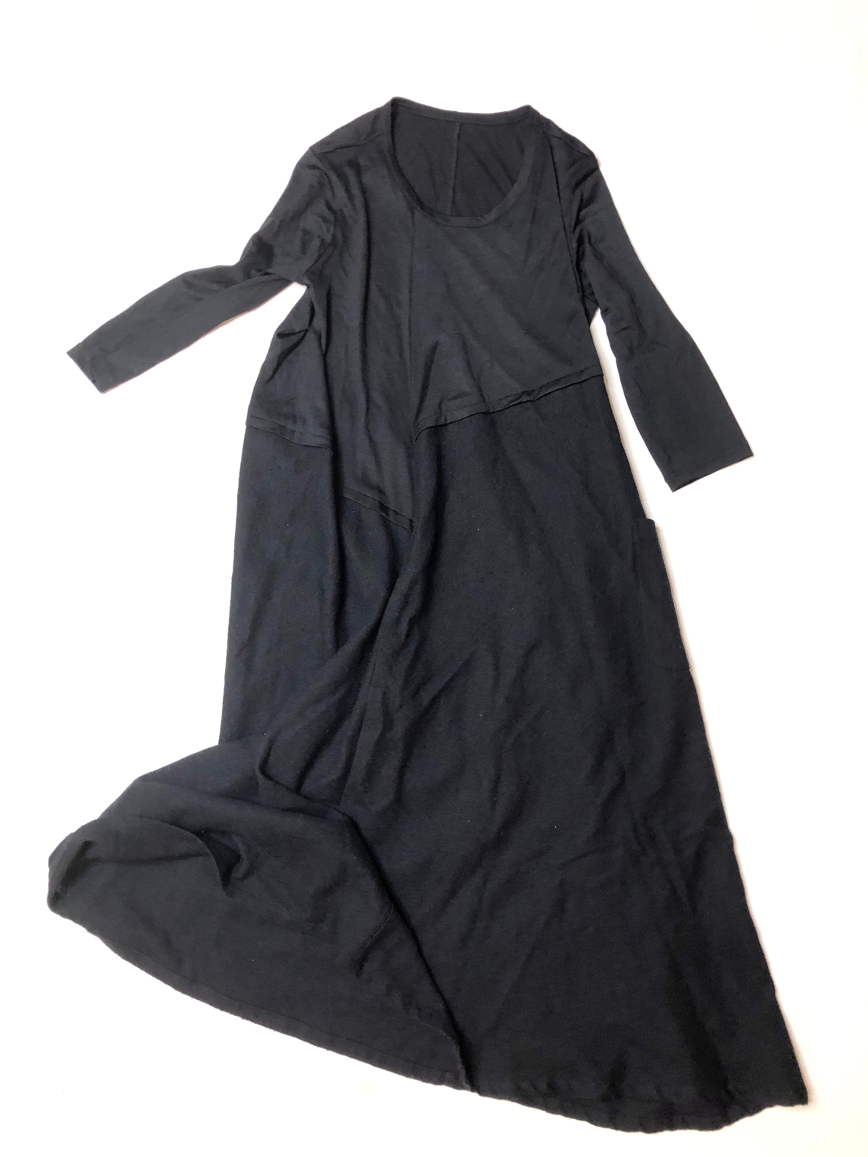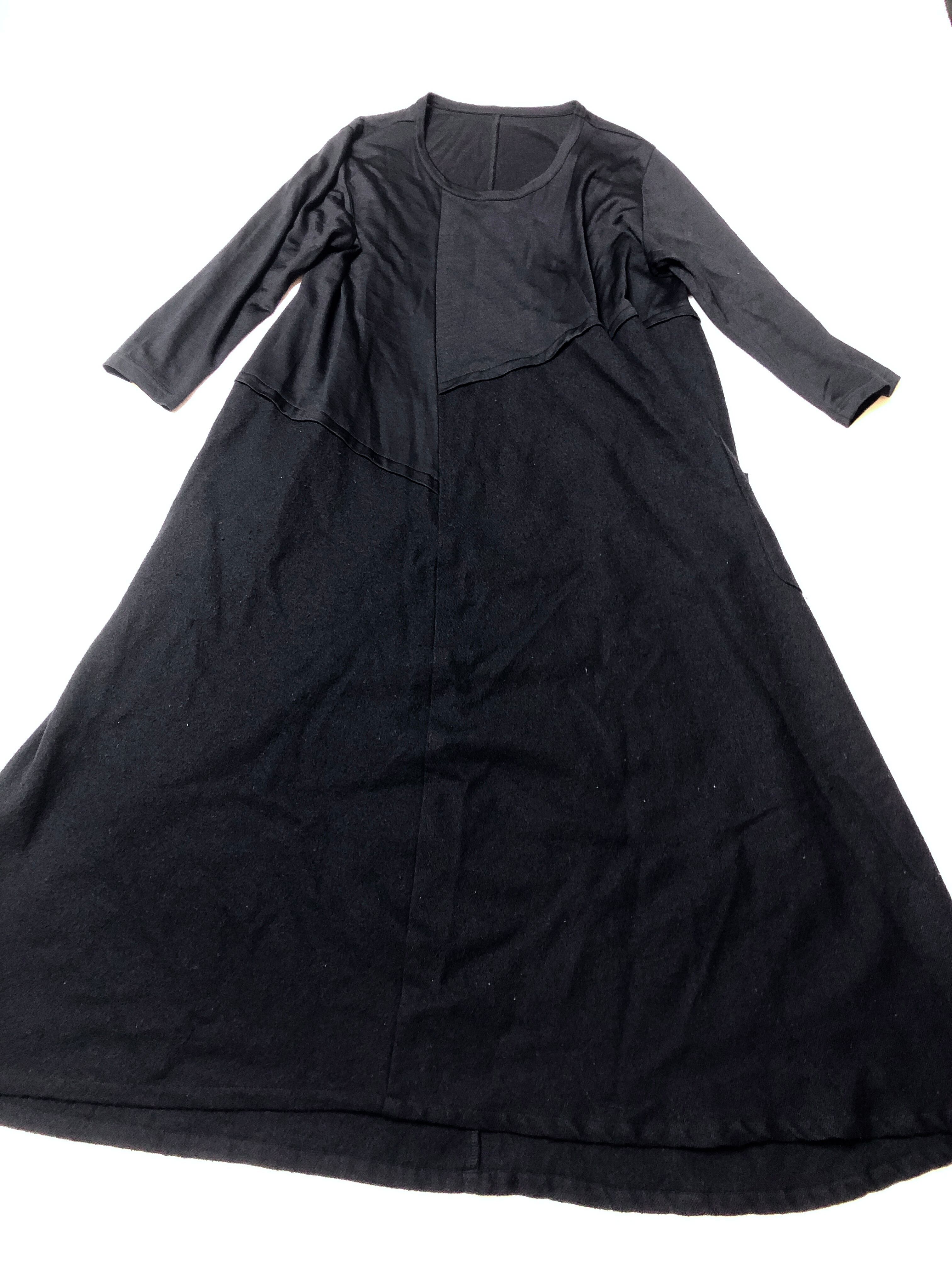 たっぷりとしたフォルムのAラインシルエットに七分袖、デザイン性の強いアシンメトリーなドッキングワンピースです。