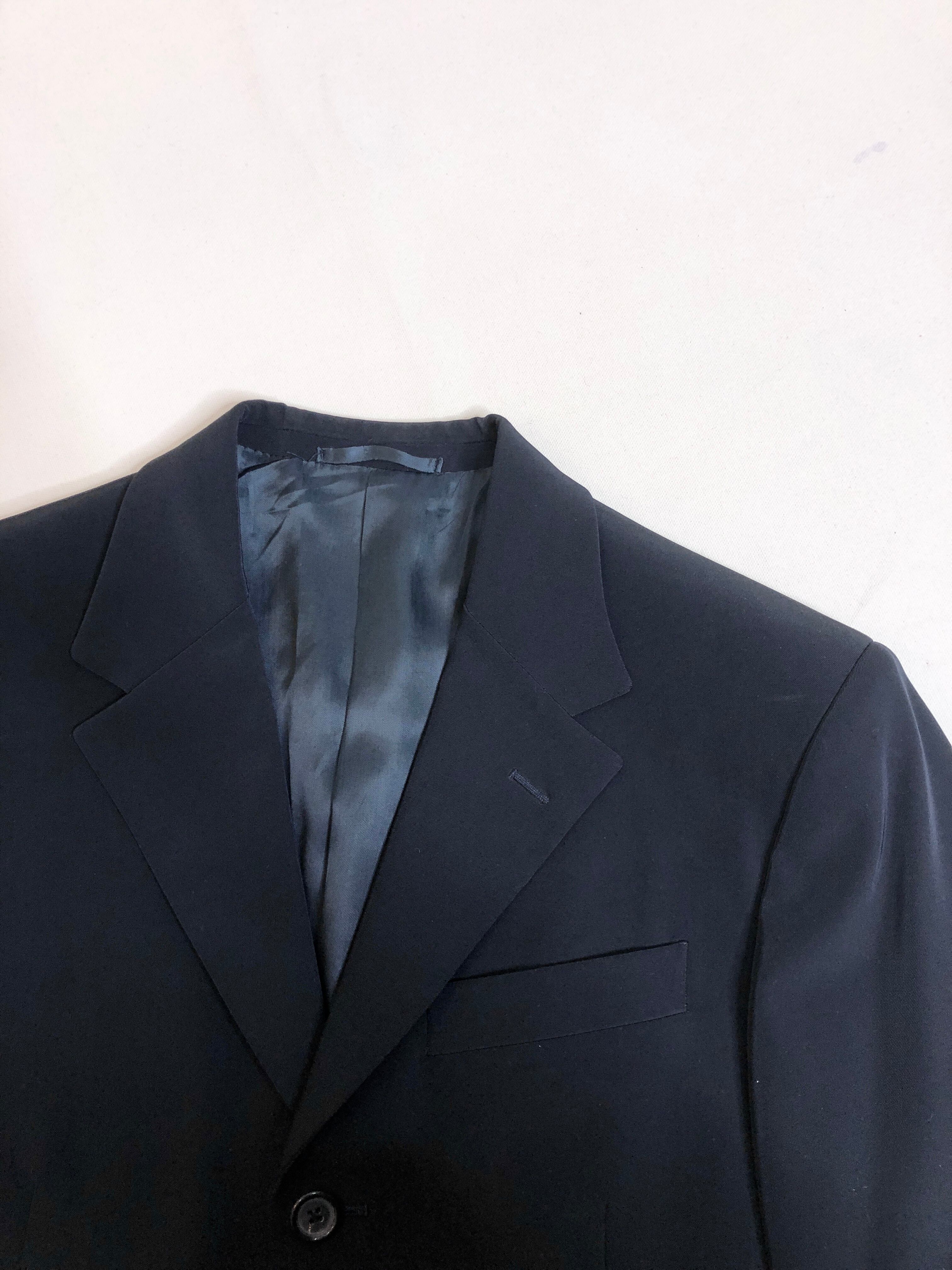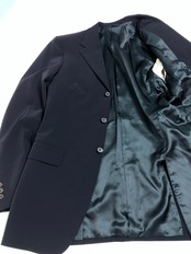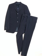 3つボタン、サイドベンツのジャケットとノープリーツのテーパドスラックスのセットアップ