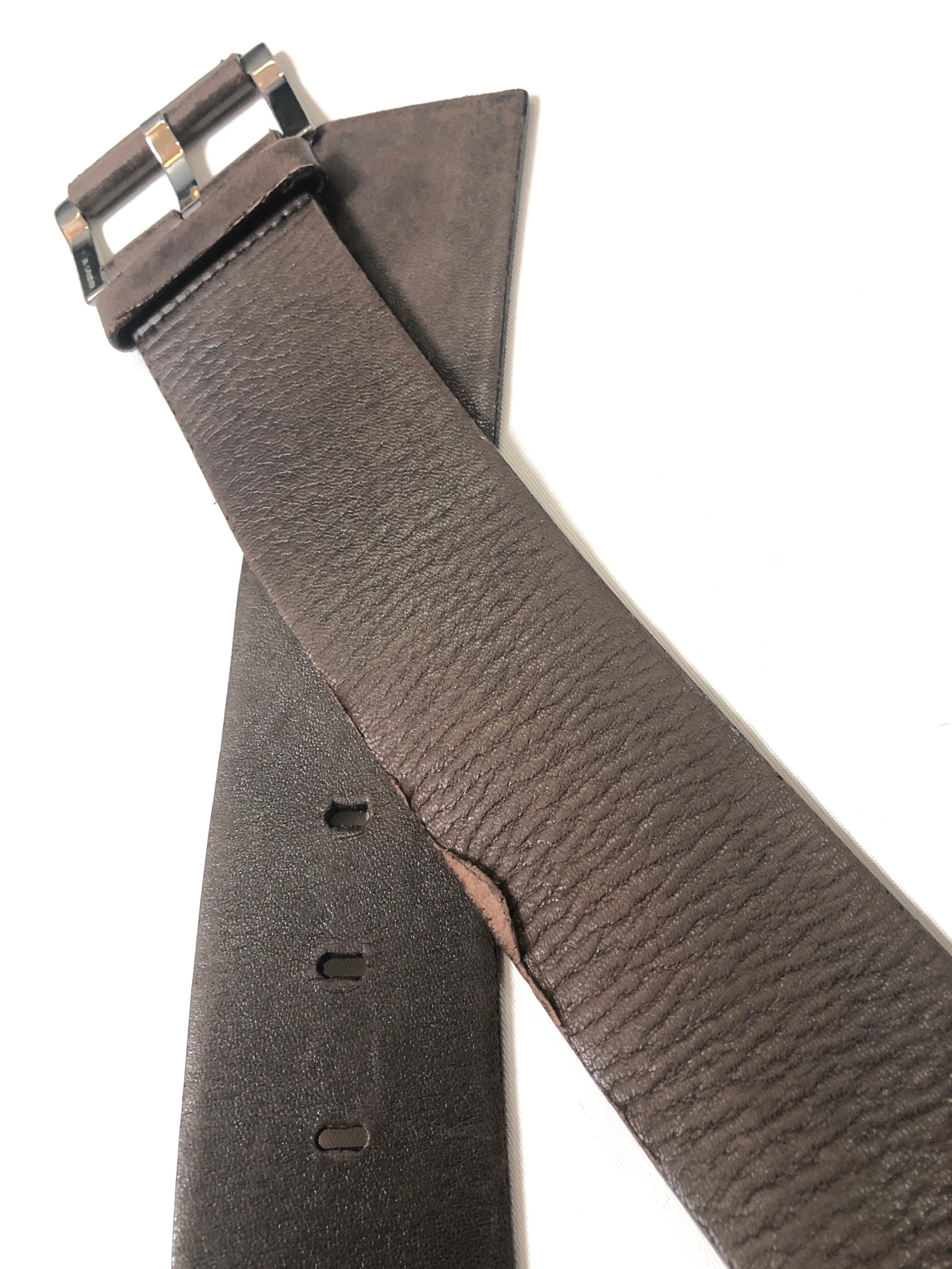 ダークブラウンのシックな色合い、太めのレザーベルトをウエストにあしらったミニマルでエレガントな逸品です。
