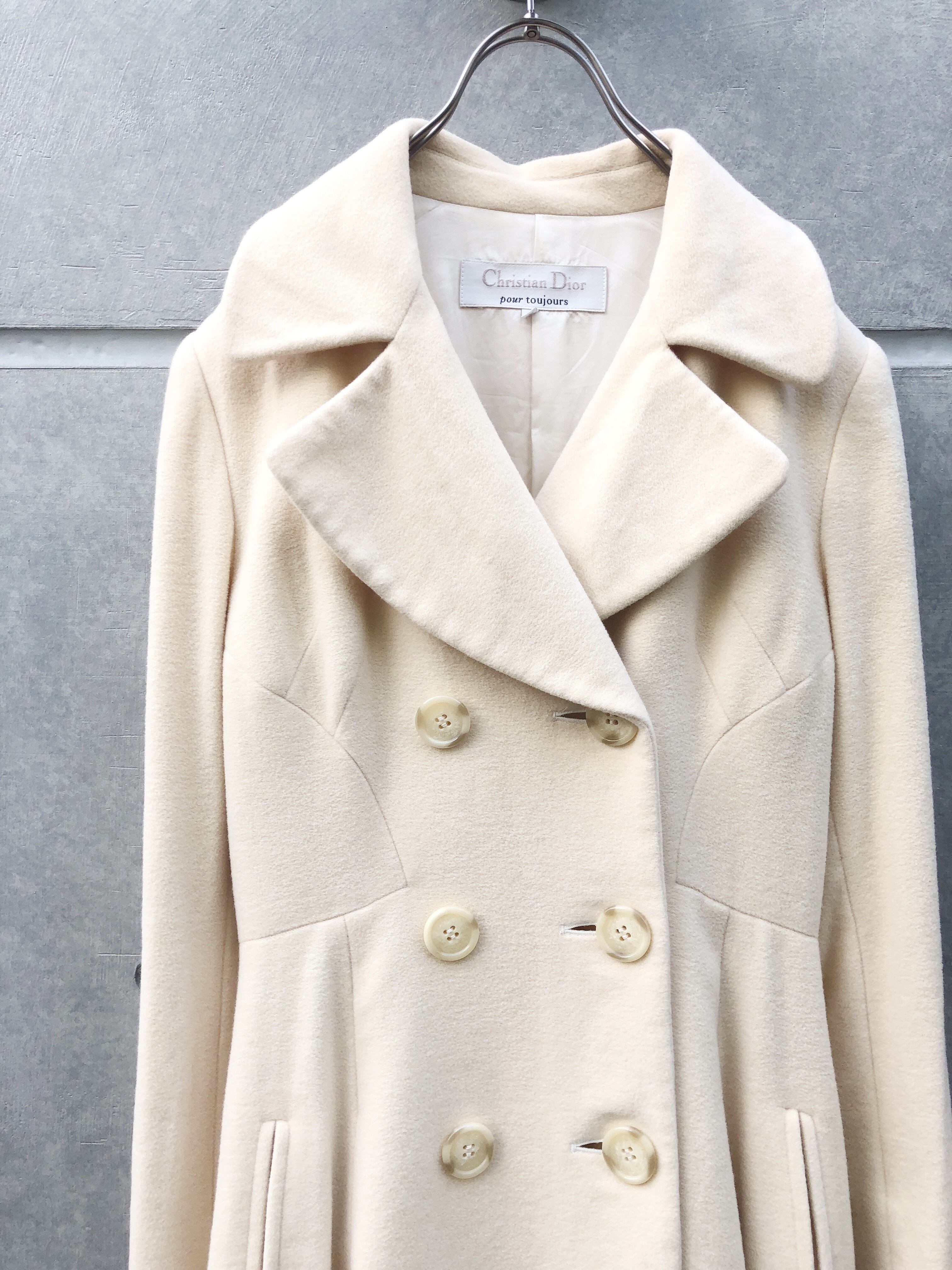 柔らかなオフホワイトカラーに上質なピュアウールを使用したダブルブレストチェスターコート