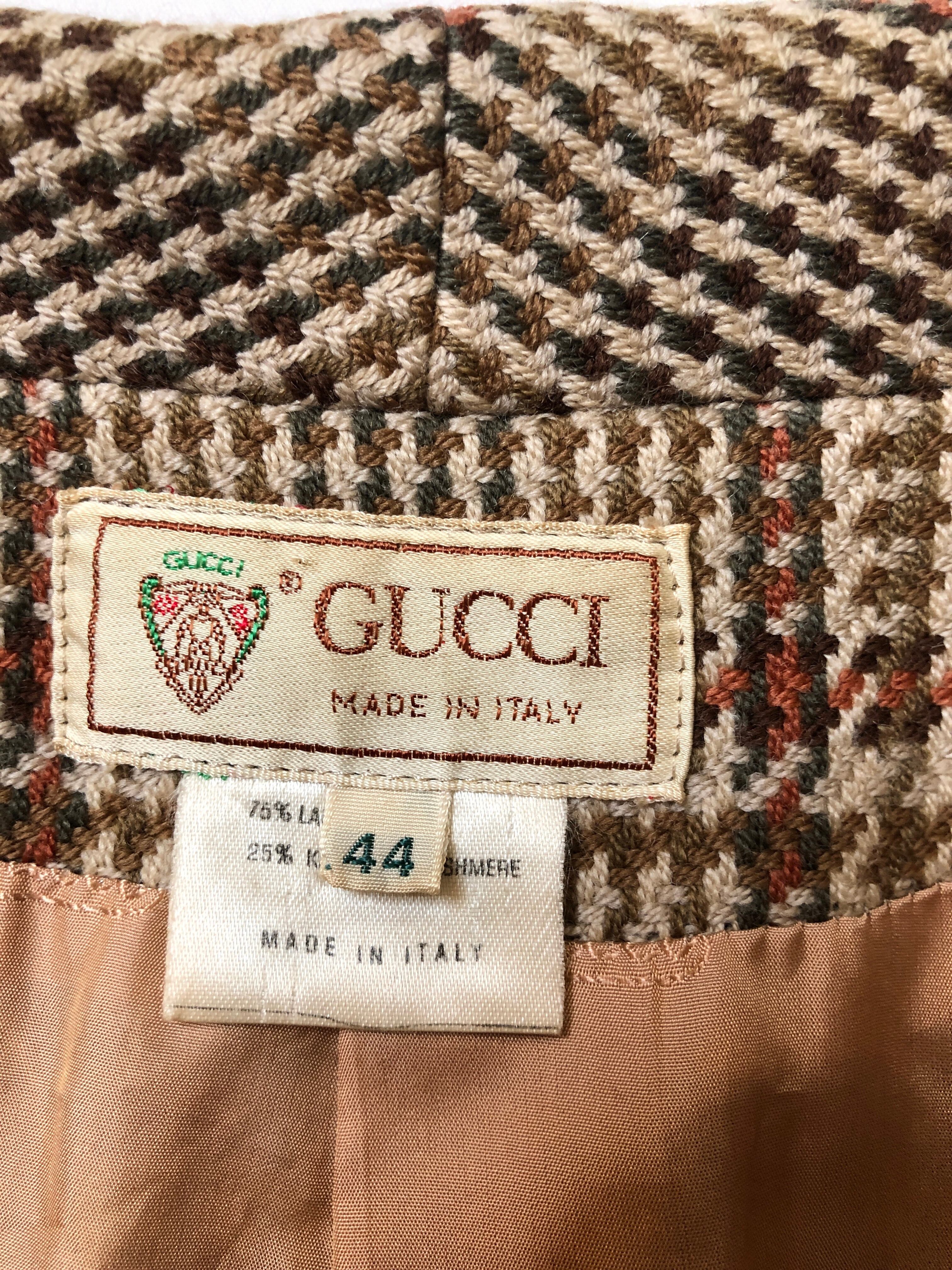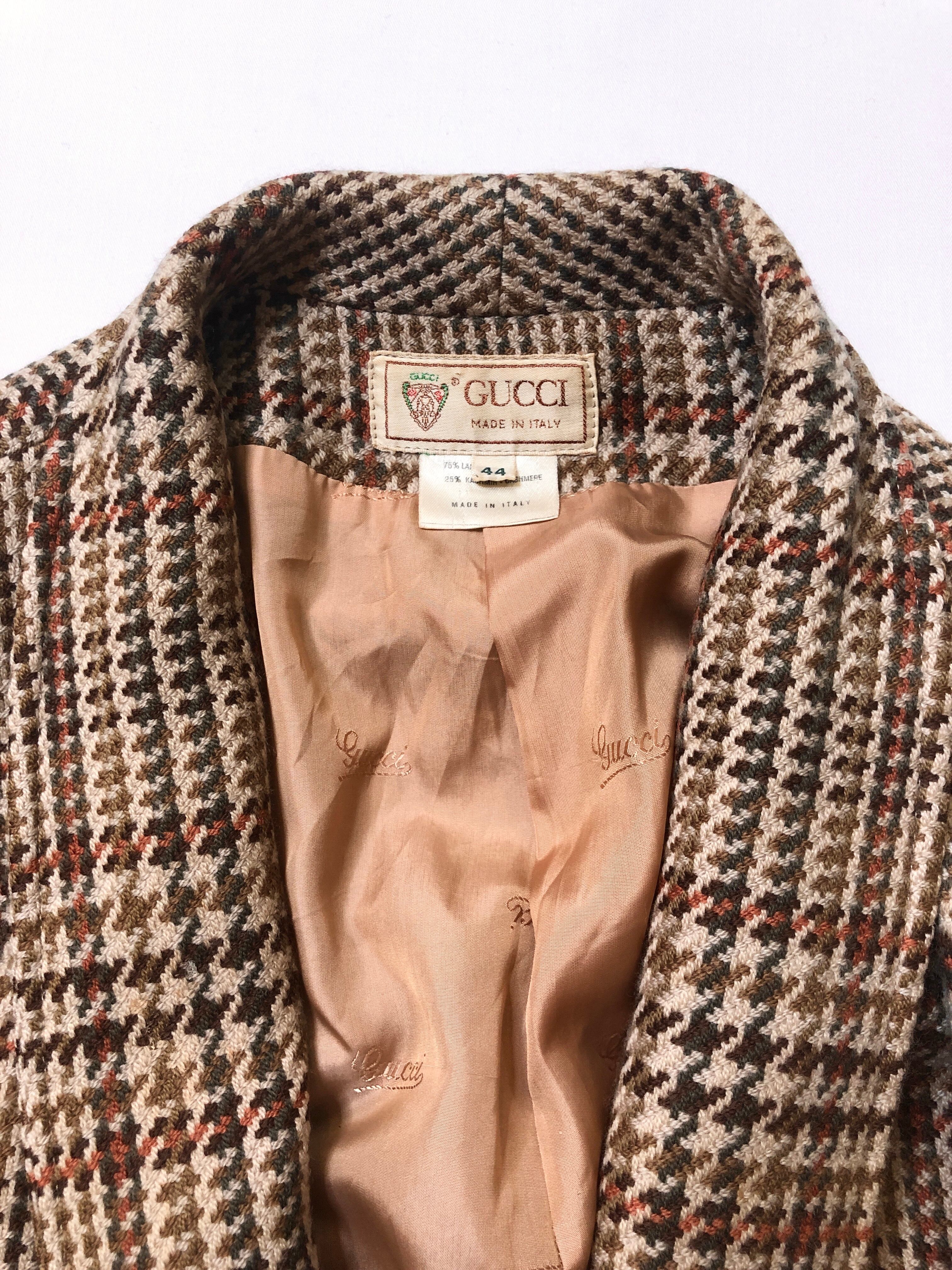 裏地のgucciロゴ柄、ベージュやブラウン系の色彩がレトロで大変雰囲気の良い1着です。