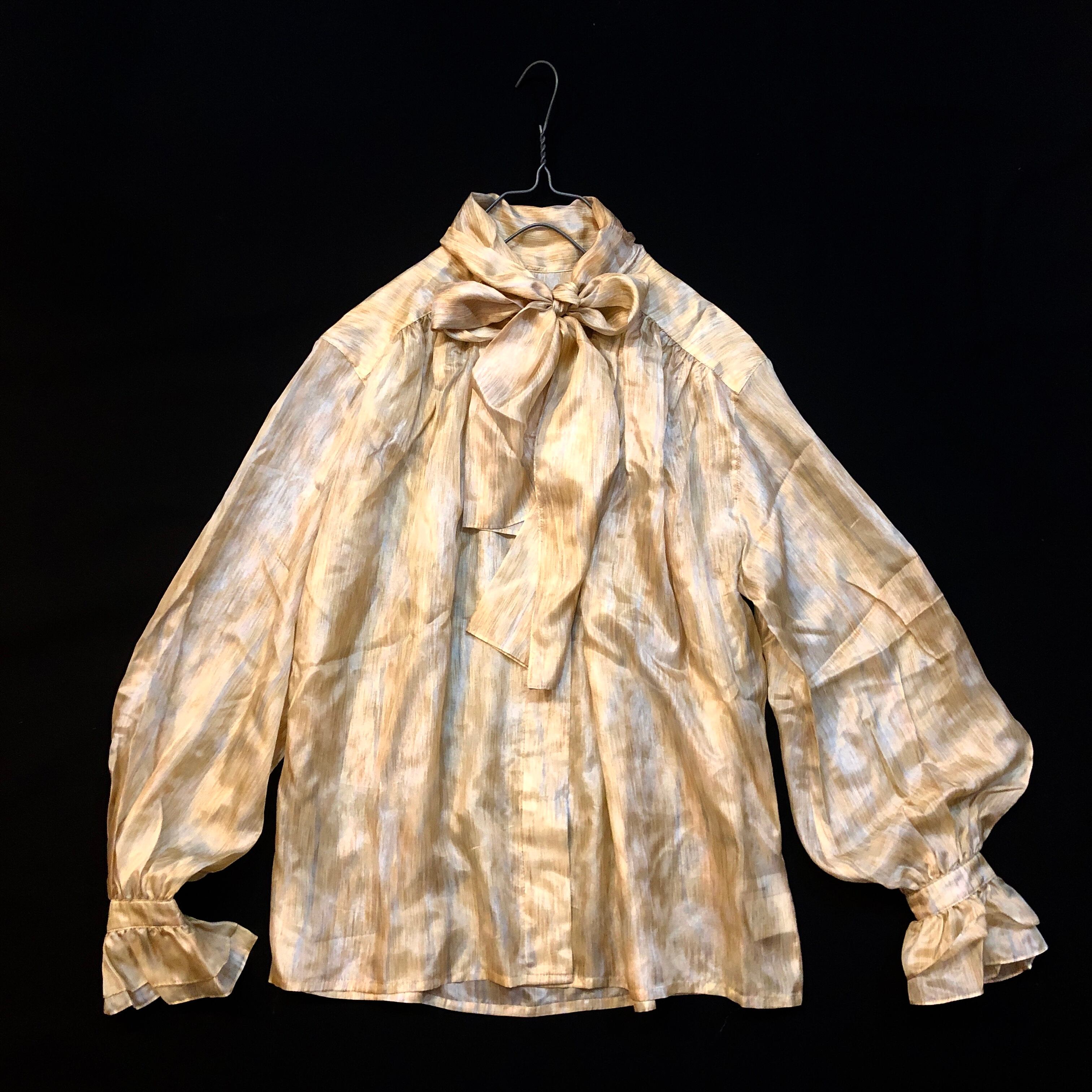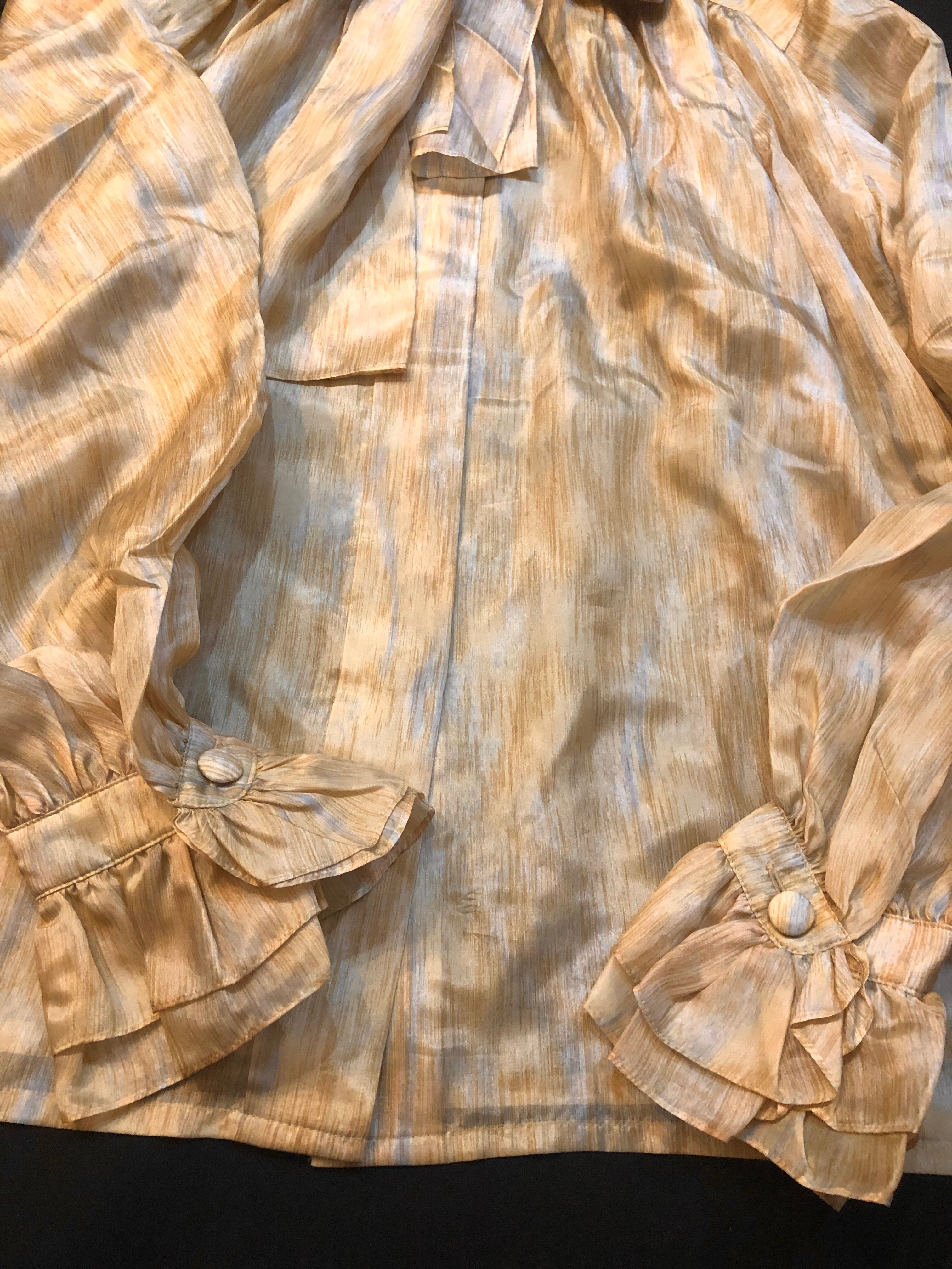 木目調のシャンパンカラーにボリュームスリーブ、フレアカフス、アスコットタイのような大振りのボウタイは結び方やアウターなどの合わせ次第でアレンジ自在なアイテムです。