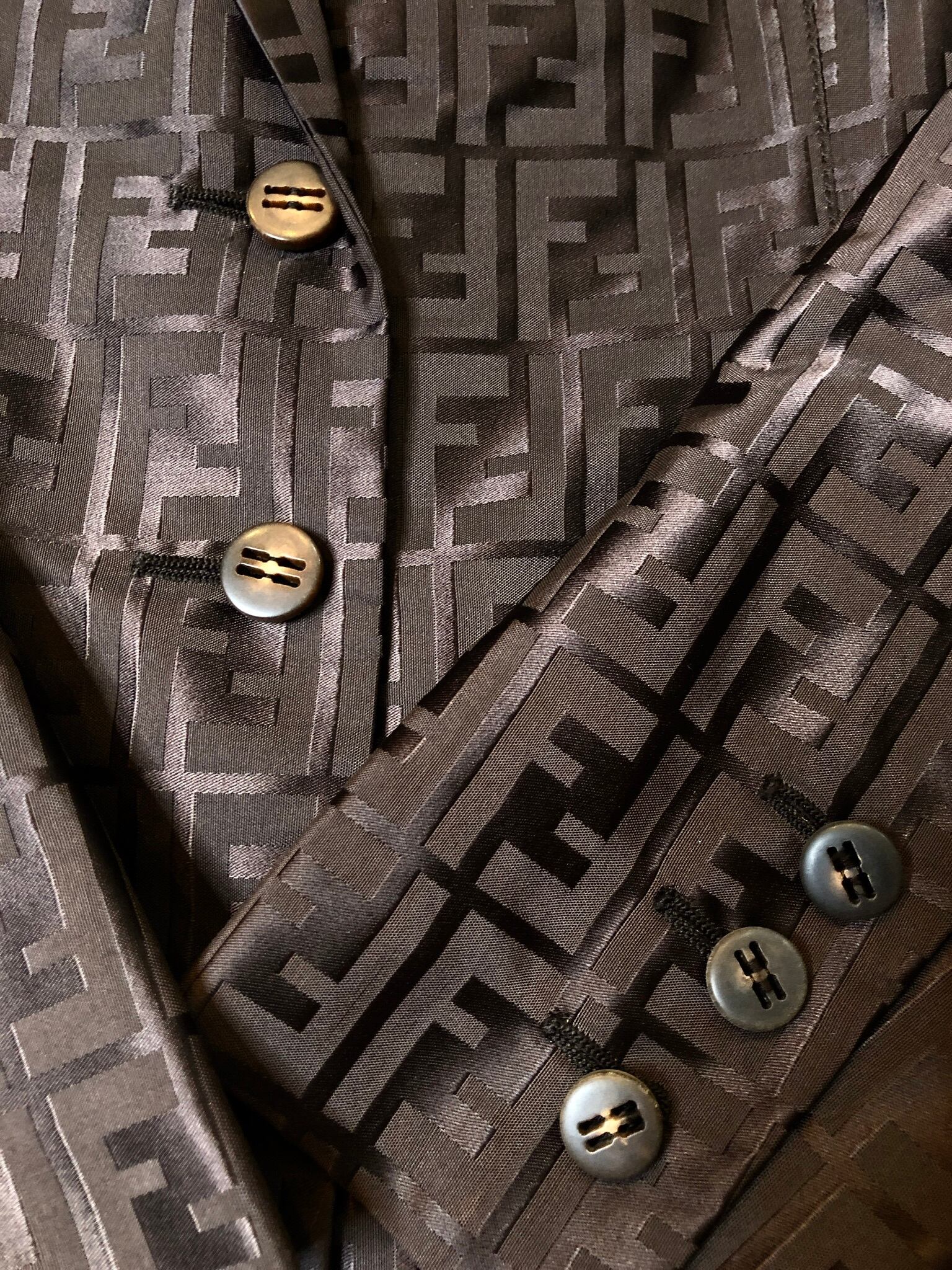 同系色のボタンを配したハイウエストの美しいシルエット、アイコンのズッカ柄がフェンディらしいエレガントな逸品です。