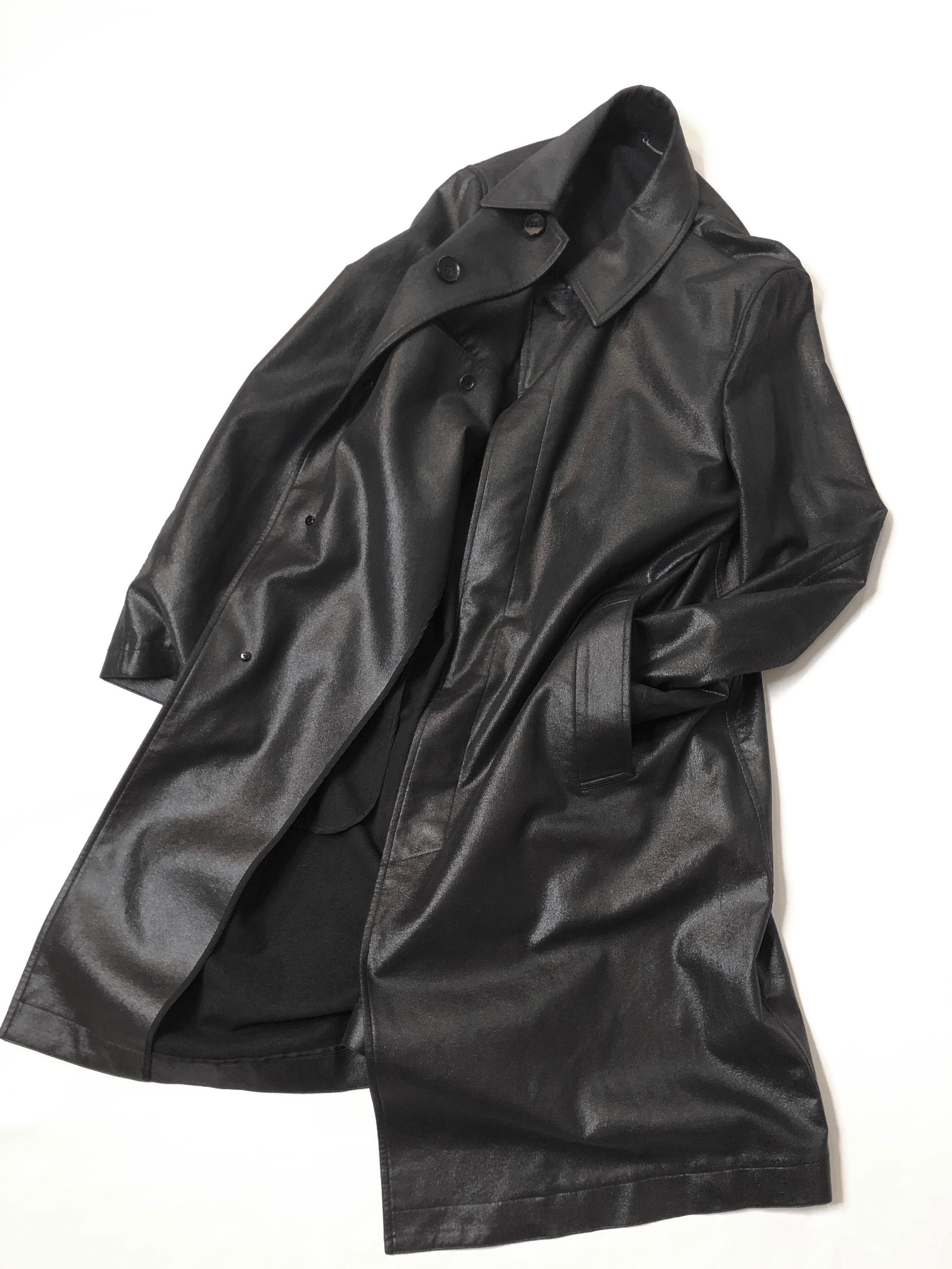 しなやかな素材感でストンと落ちるロングシルエット、 光沢のある素材感でエッジィな魅力も備わったオーバーサイズのバルカラーコートです。