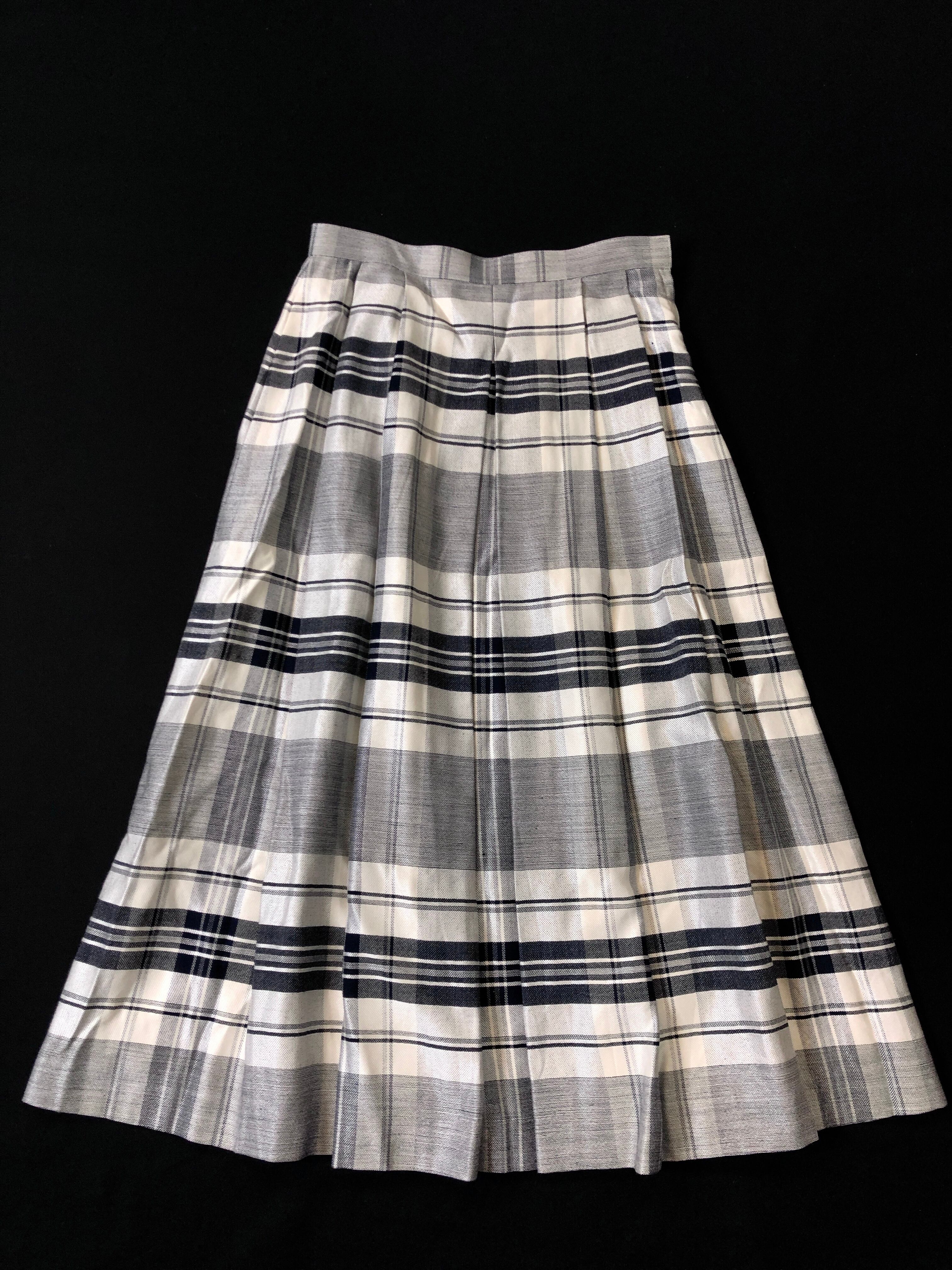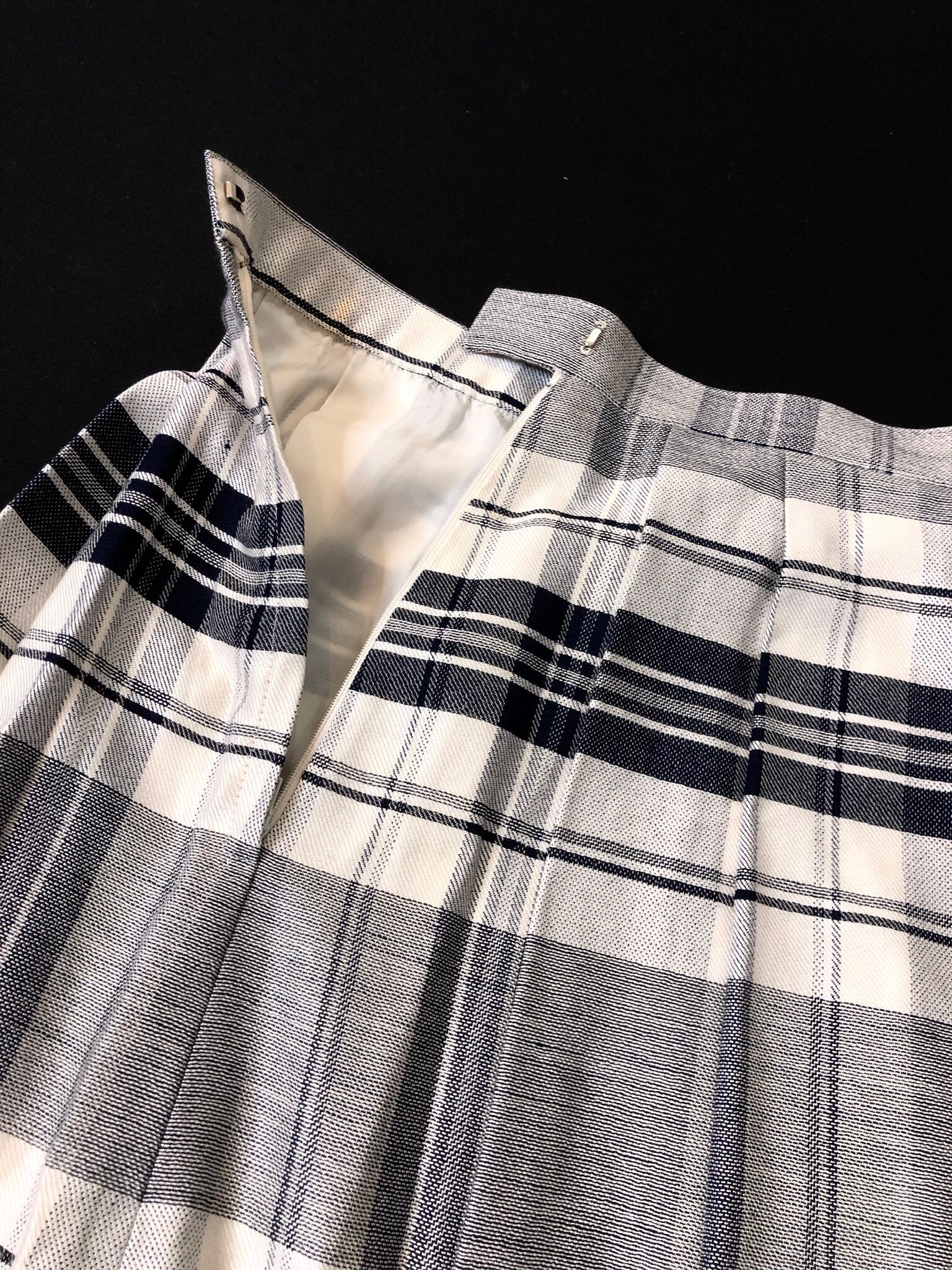 ホワイト&ネイビーのマドラスチェックが爽やかなプリーツ仕立てのフレアロングスカートです。