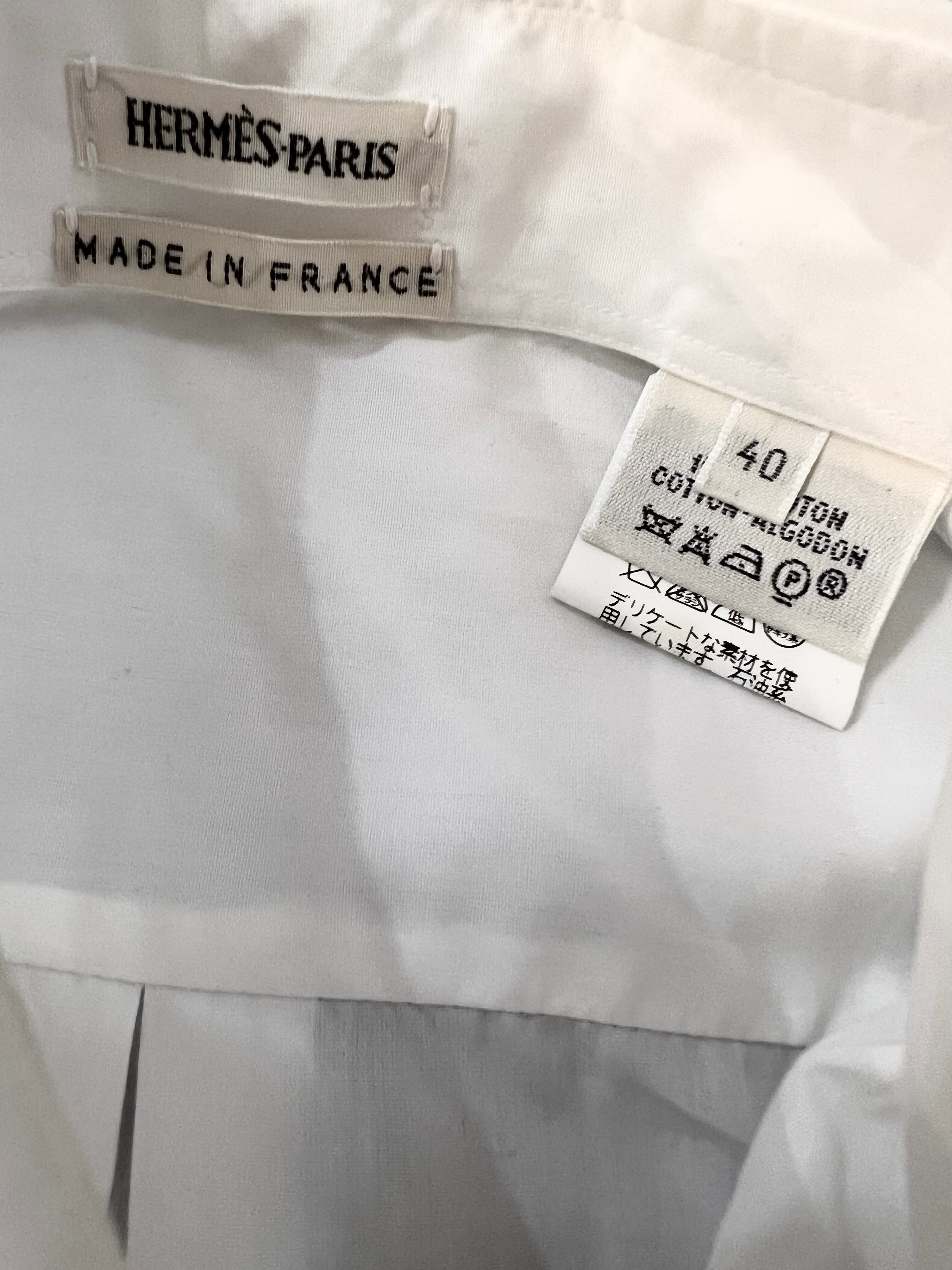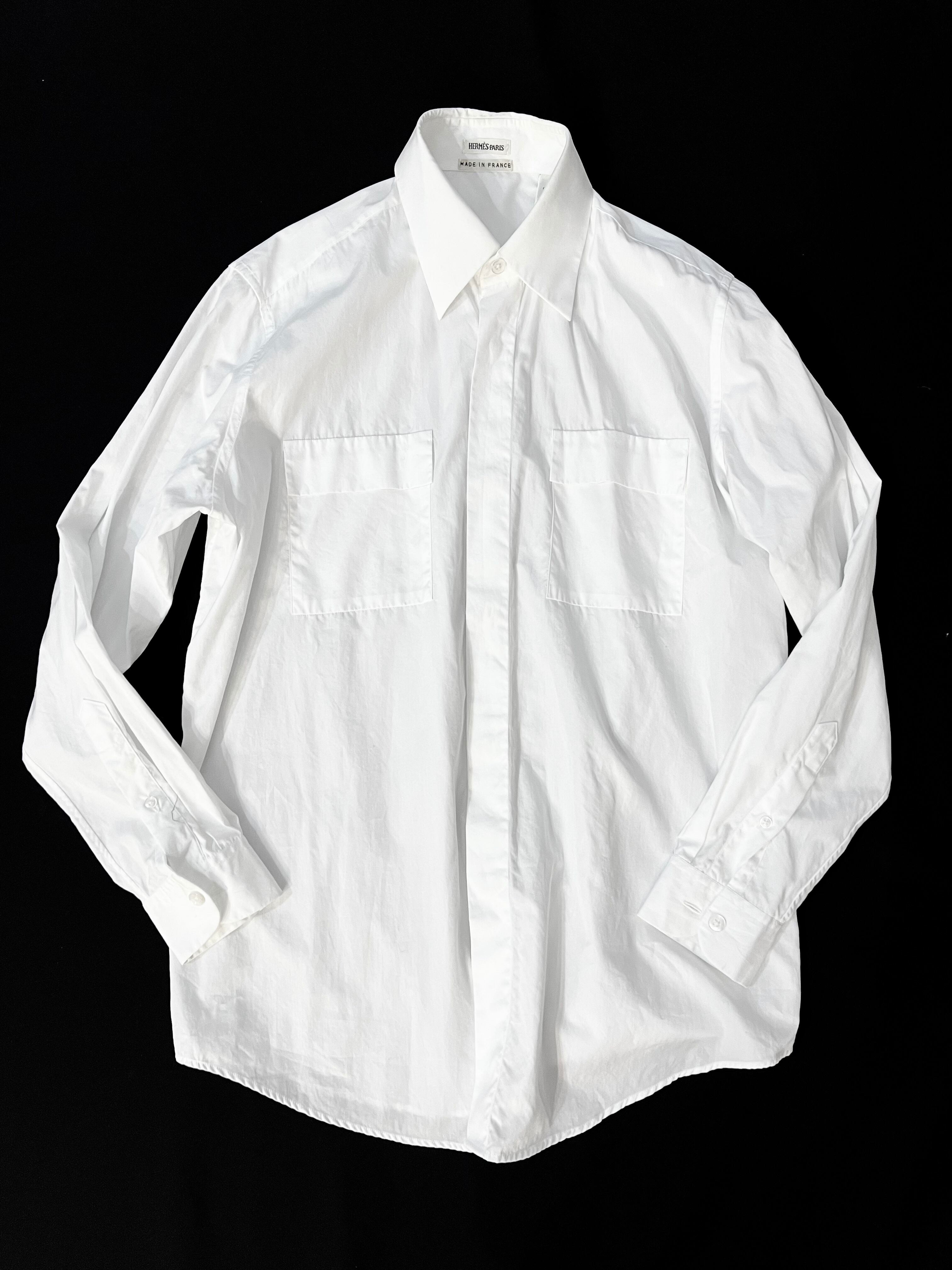 フロントのダブルフラップポケットが特徴的なホワイトシャツ。