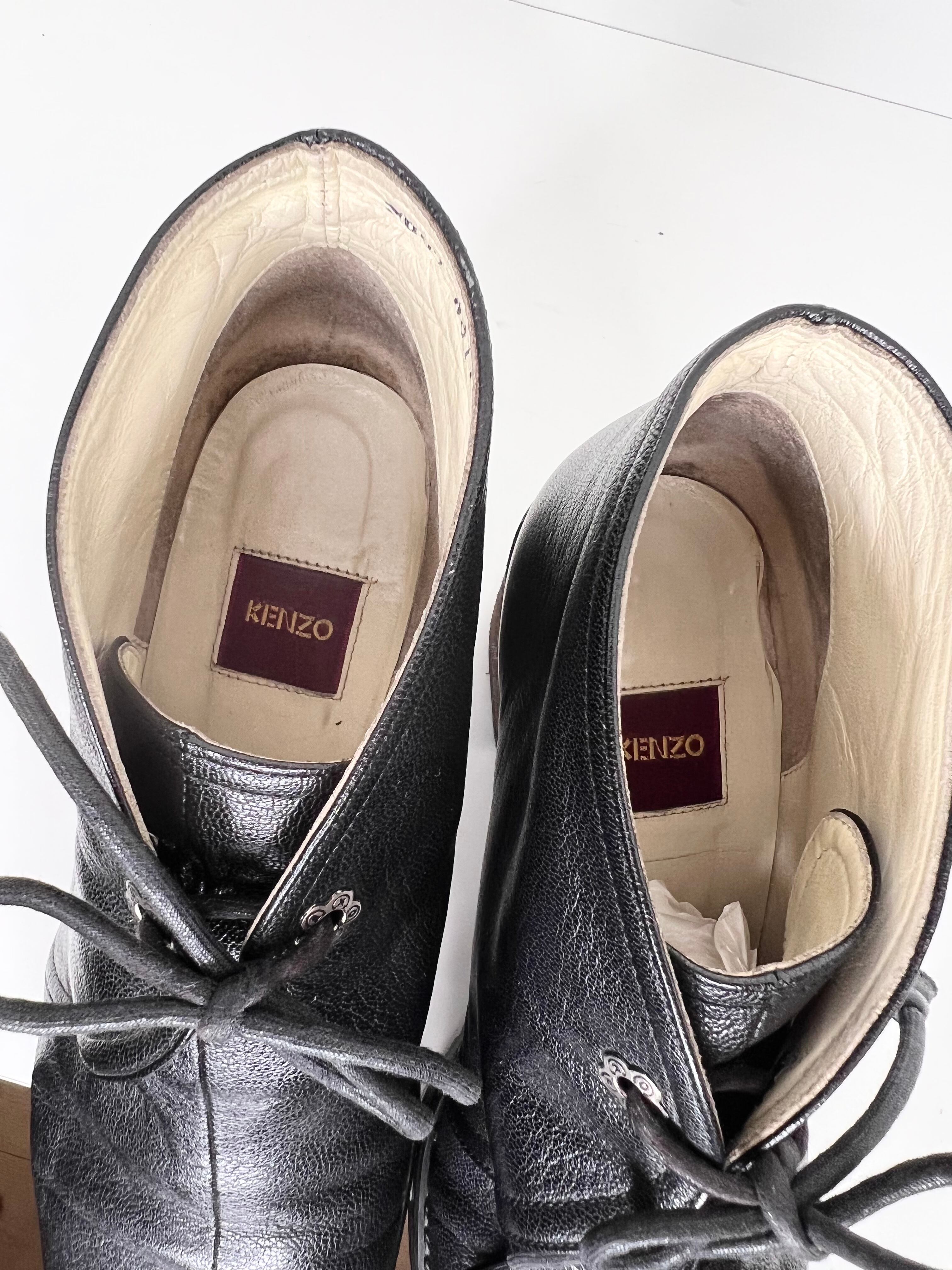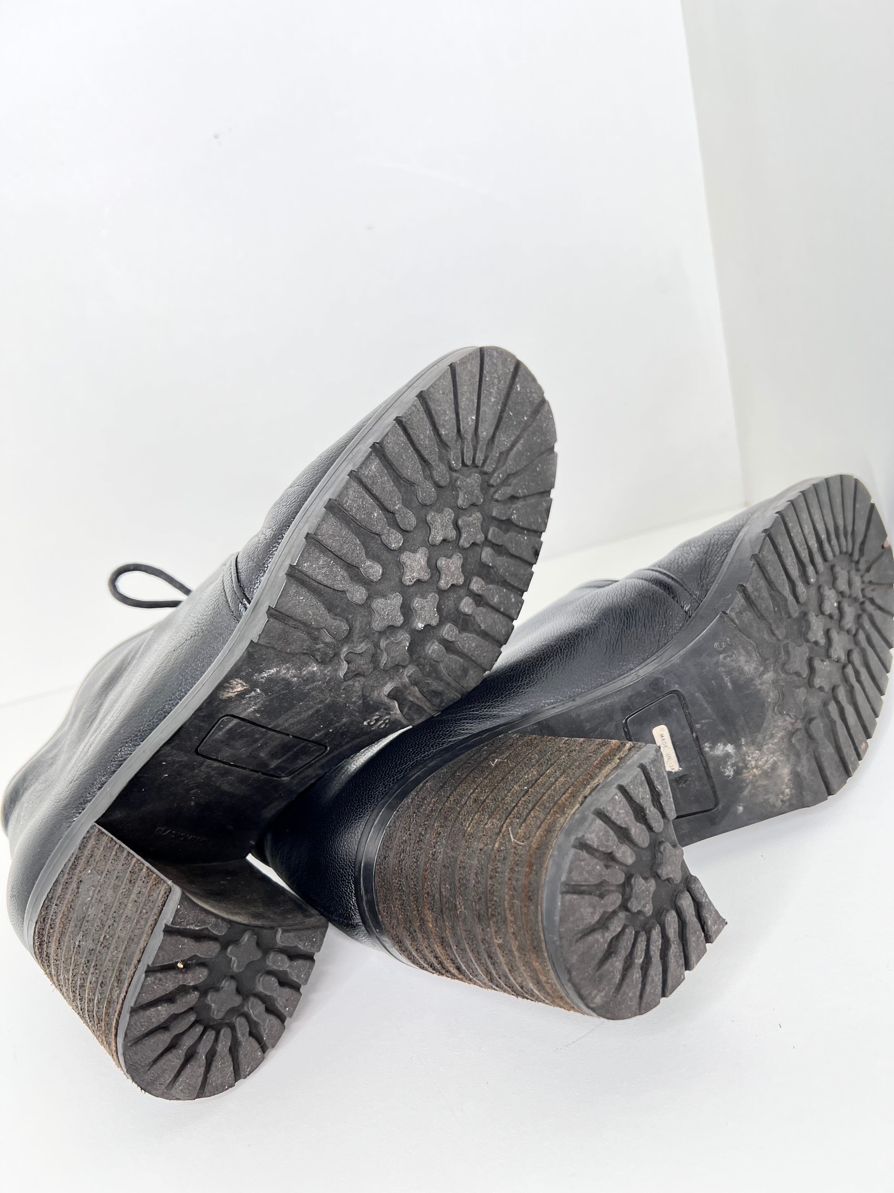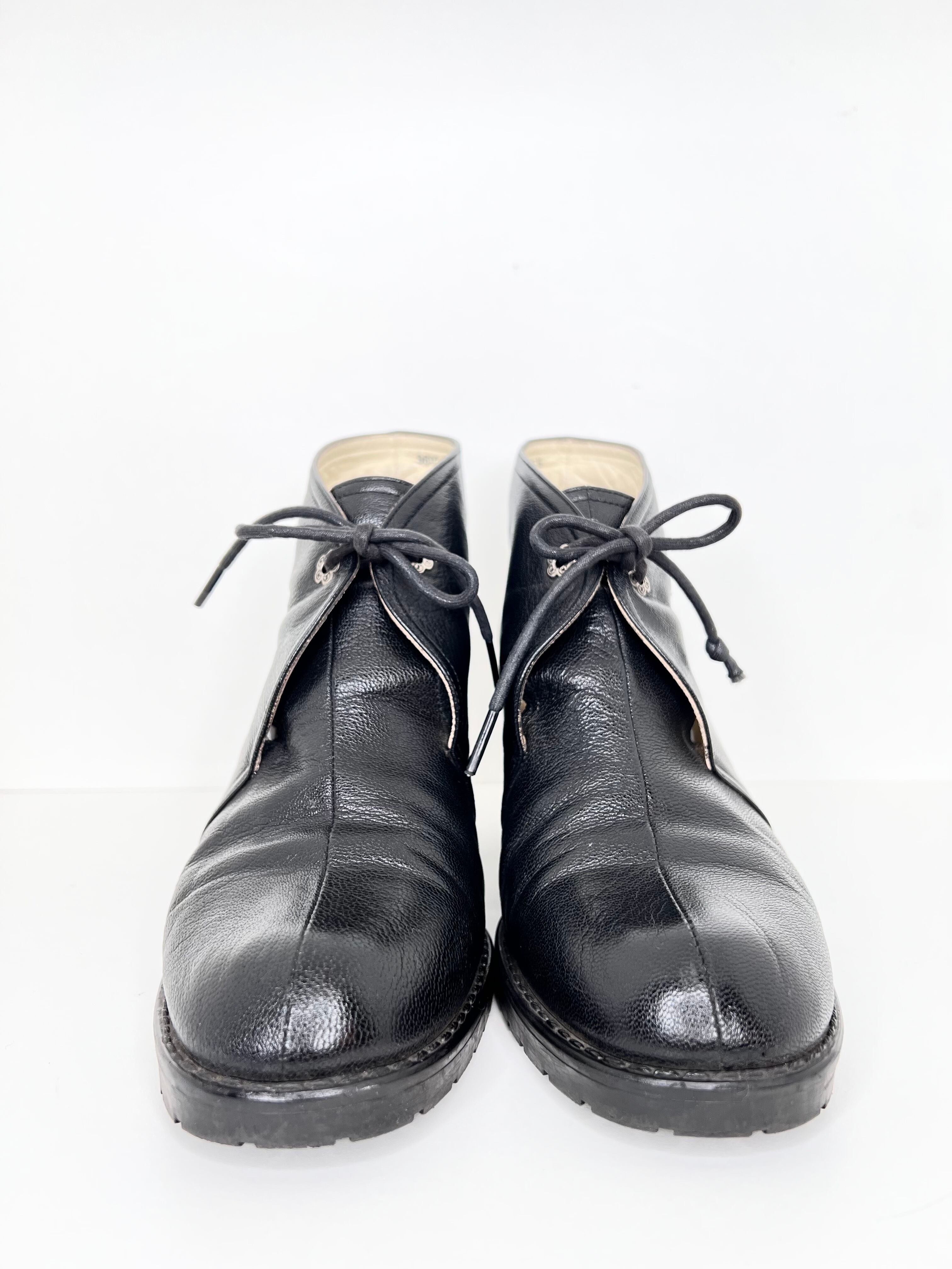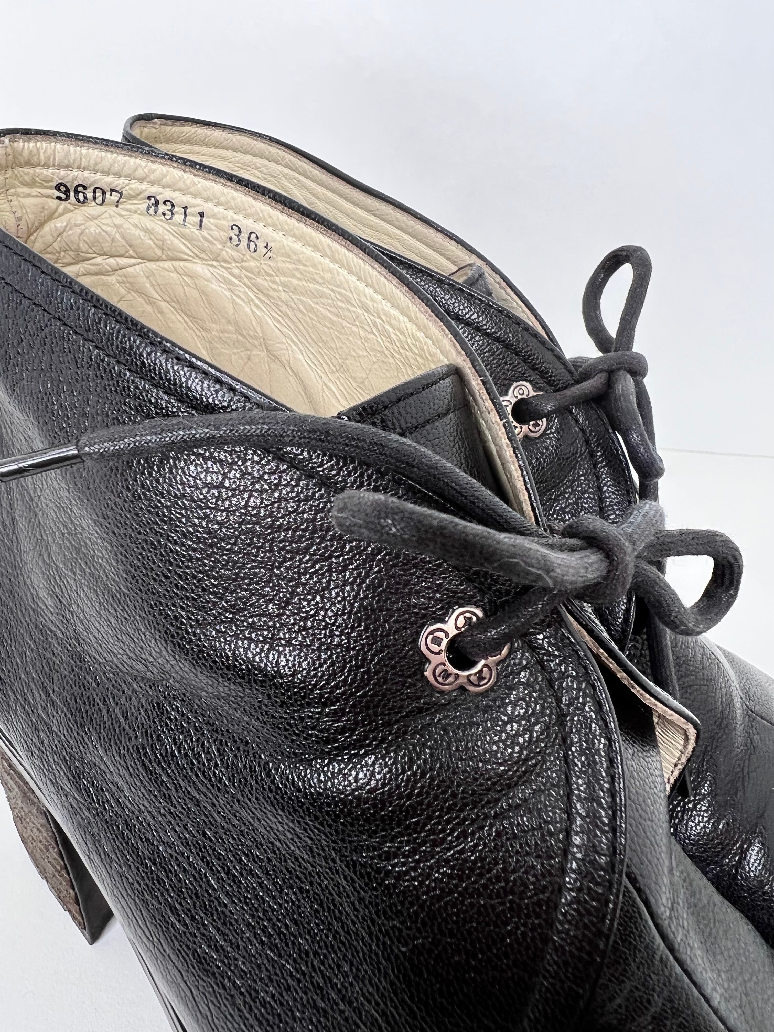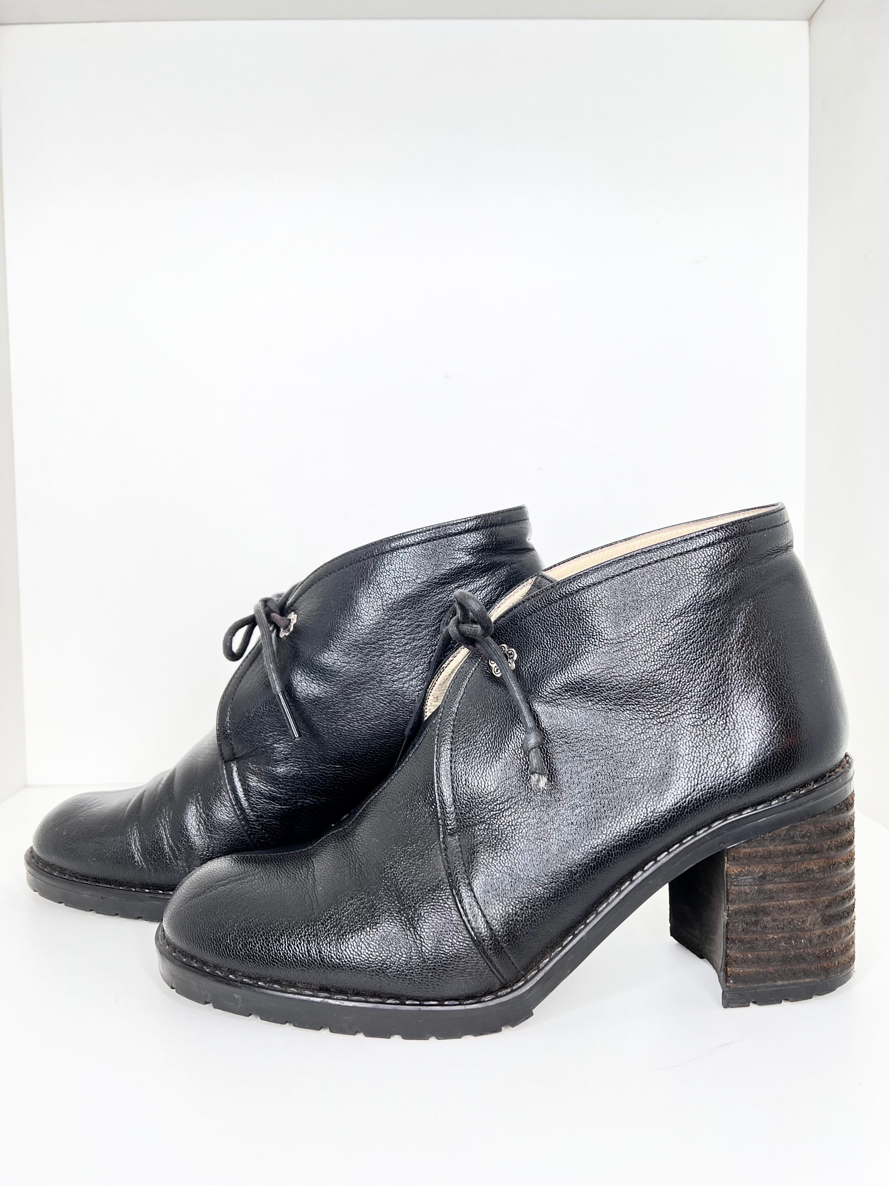 ラウンドトゥにシューレースの少ないシンプルなデザイン、安定感のあるチャンキーヒール