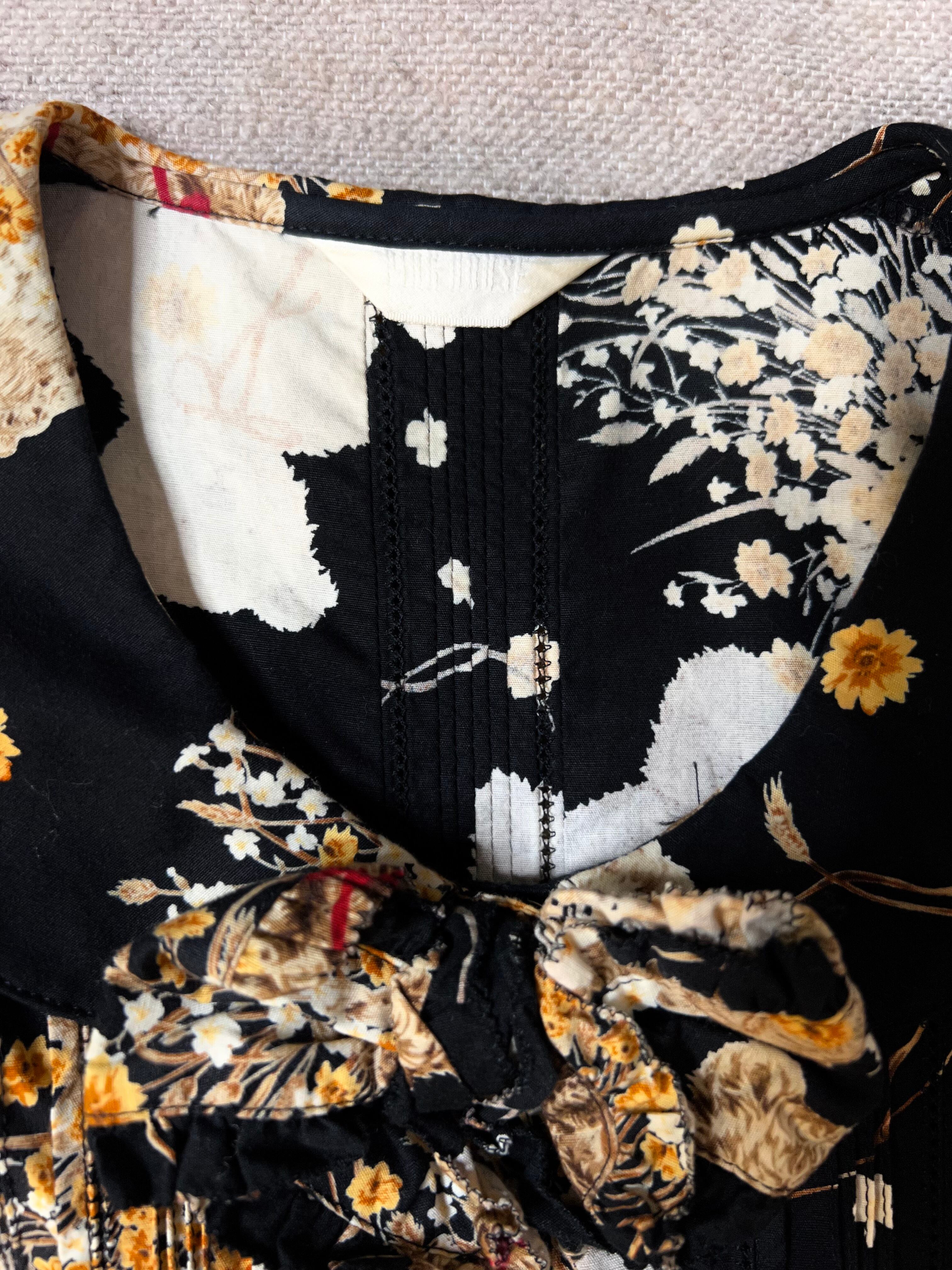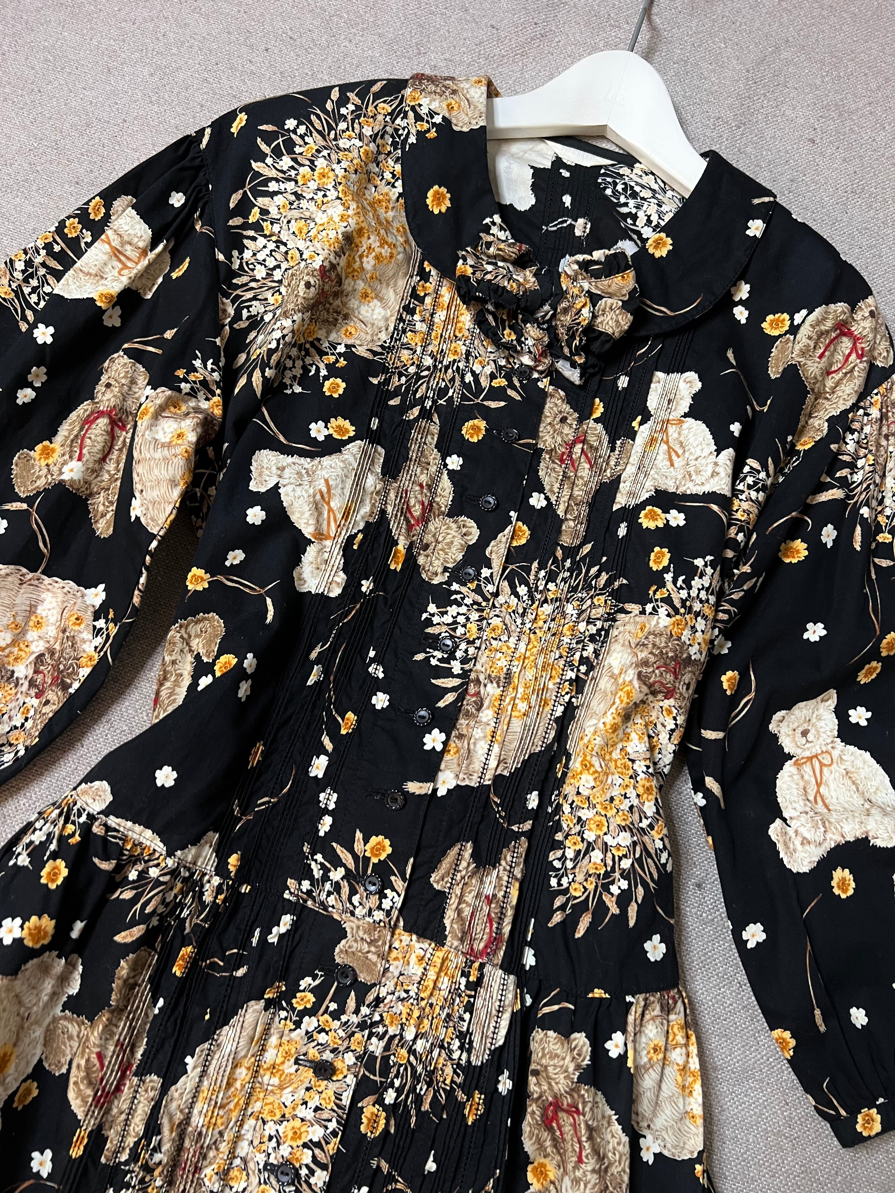 フロントボタン開閉式のシャツタイプ、ウエストはバックリボン式、7部丈のボリュームスリーブと細部にこだわったヴィンテージの逸品です。