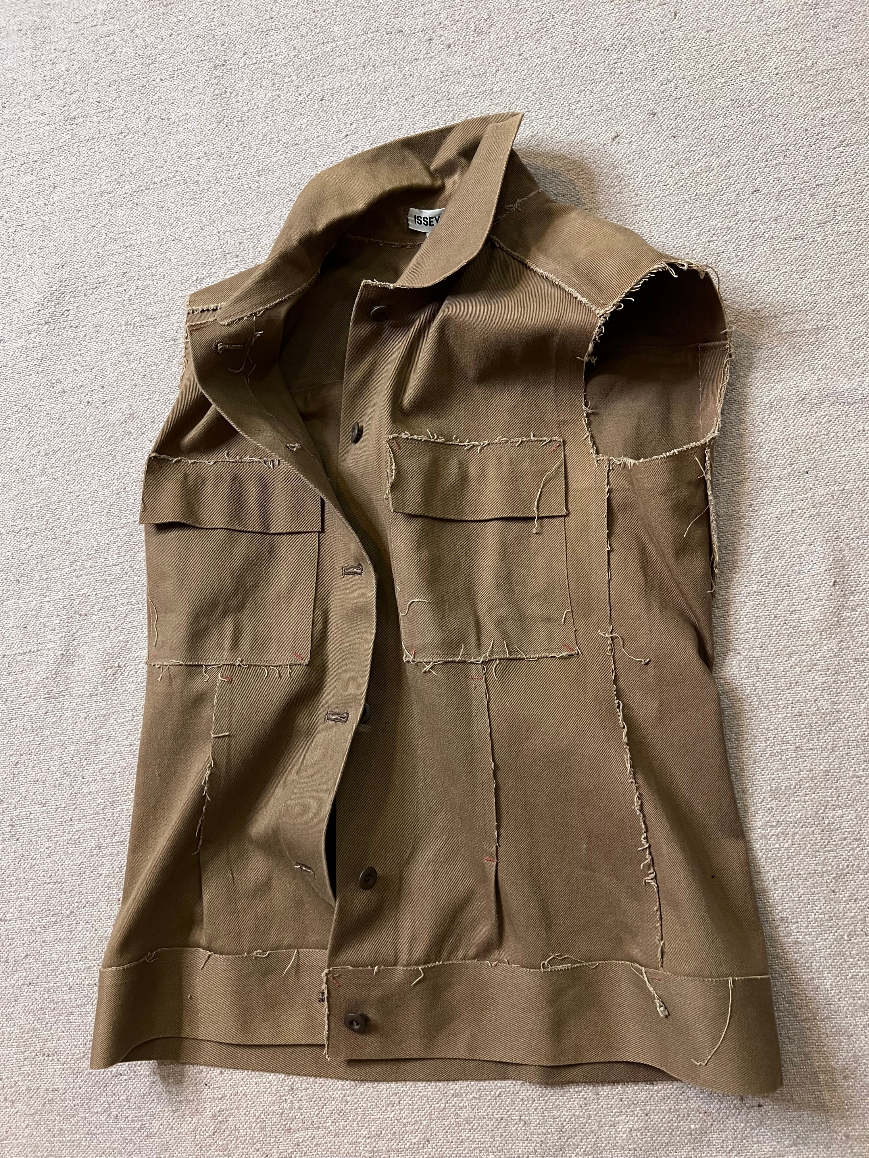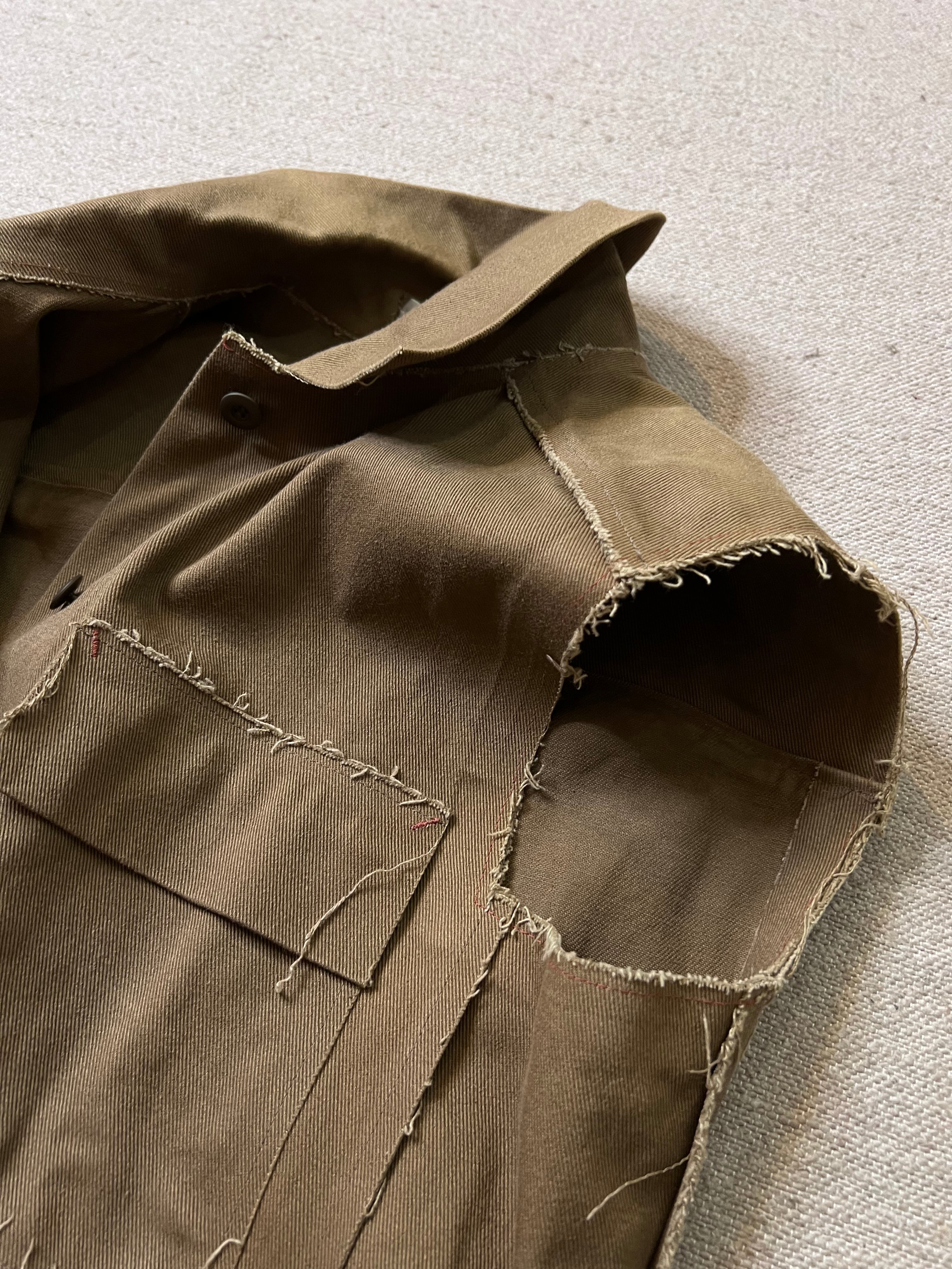 切りっぱなしのパーツで構築されたミリタリーのスリーブレスワークシャツ