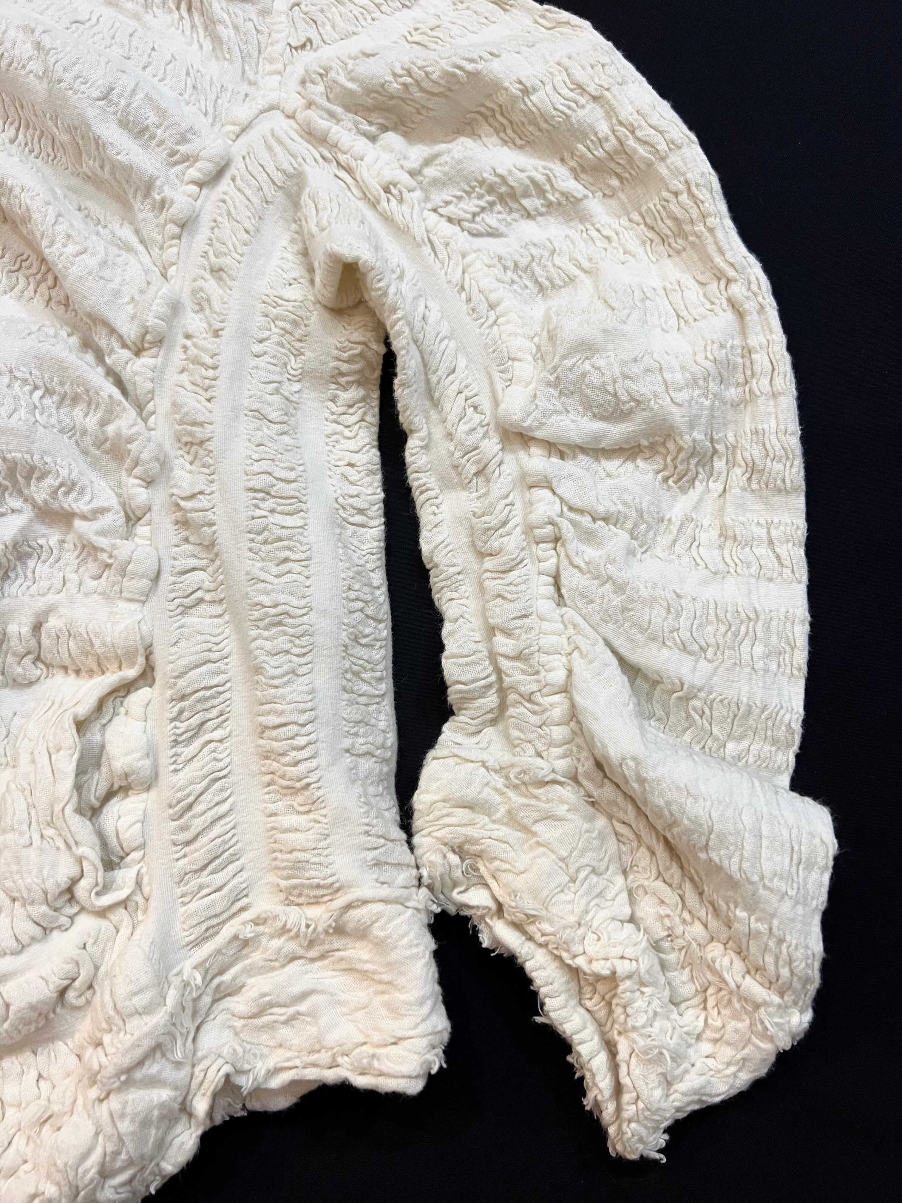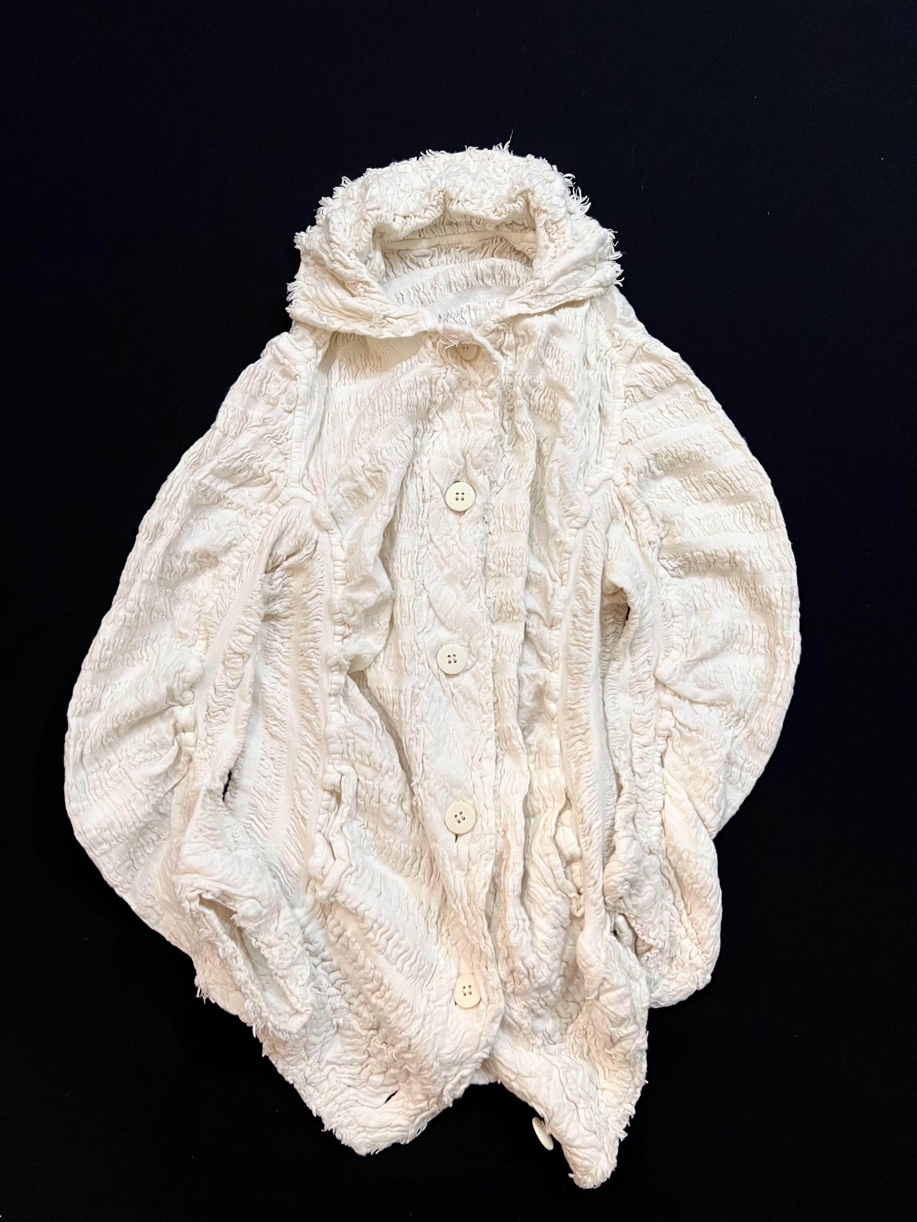 コットンガーゼ素材にギャザーを加えたシワ加工ジジャケットです。立体裁断による変形デザインはアート作品のような仕上がりです。