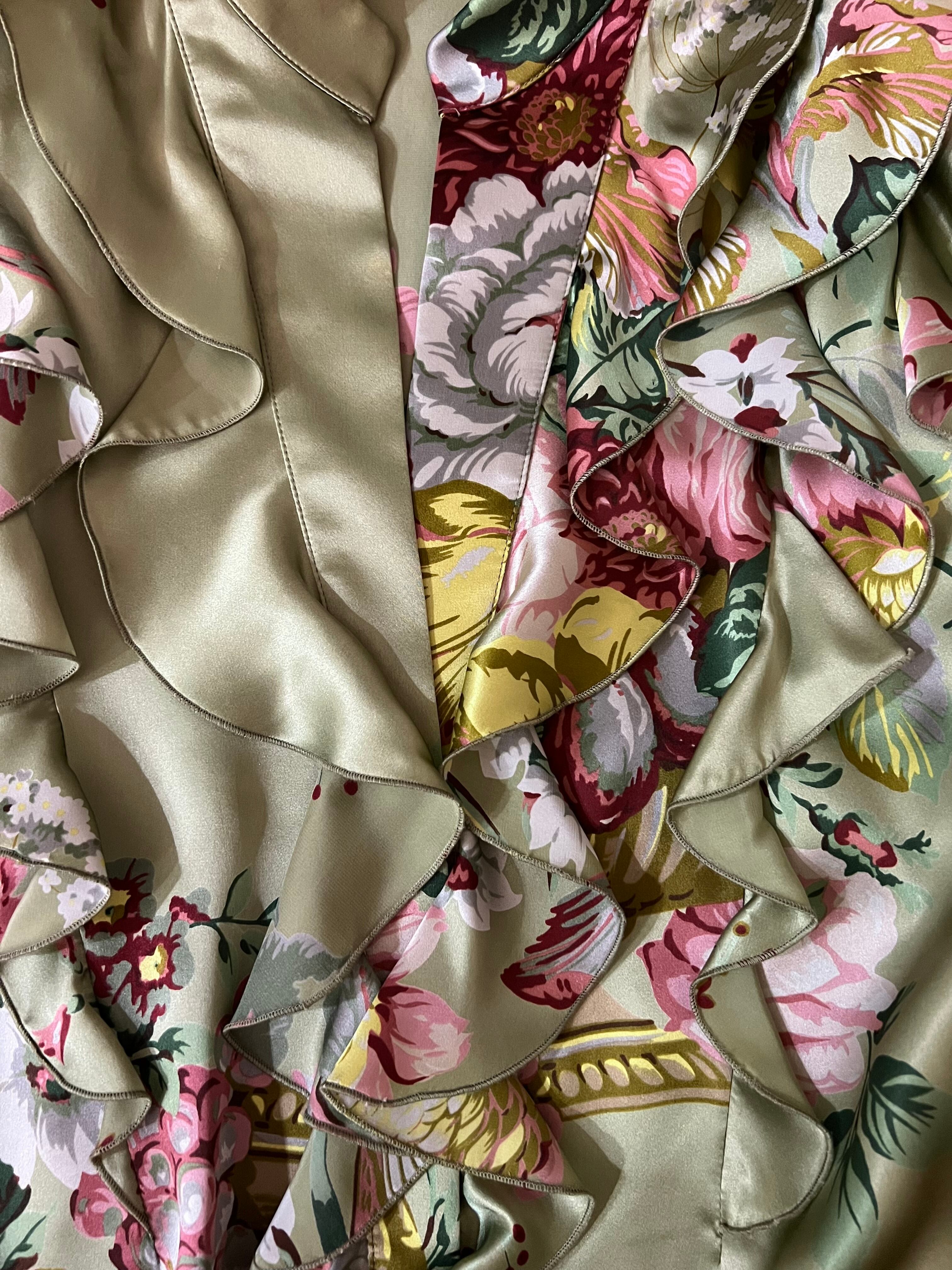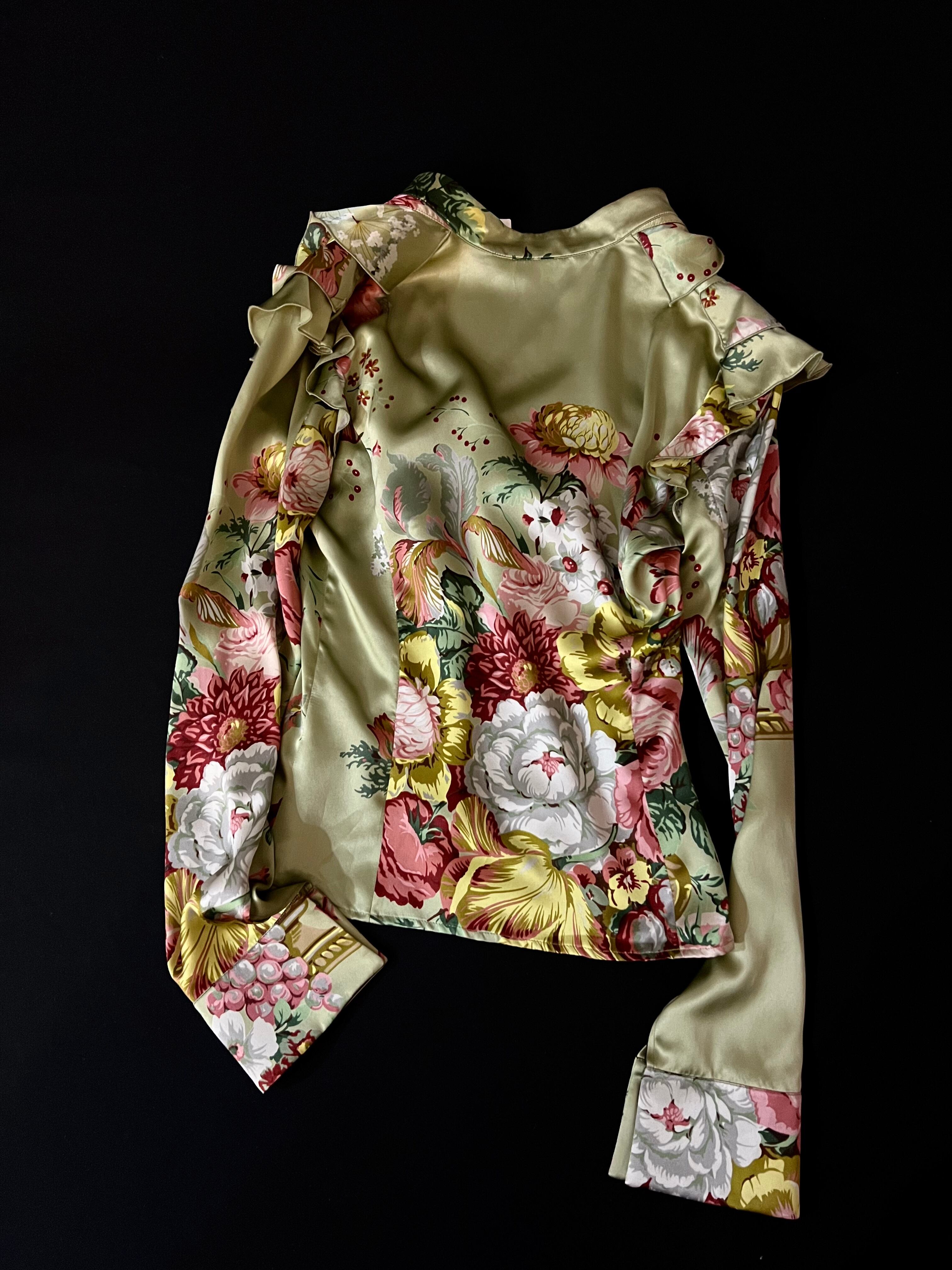 上品かつ甘過ぎないスタンドカラーのVネック比翼仕立て、爽やかで落ち着きのあるピスタチオカラーの1着です。