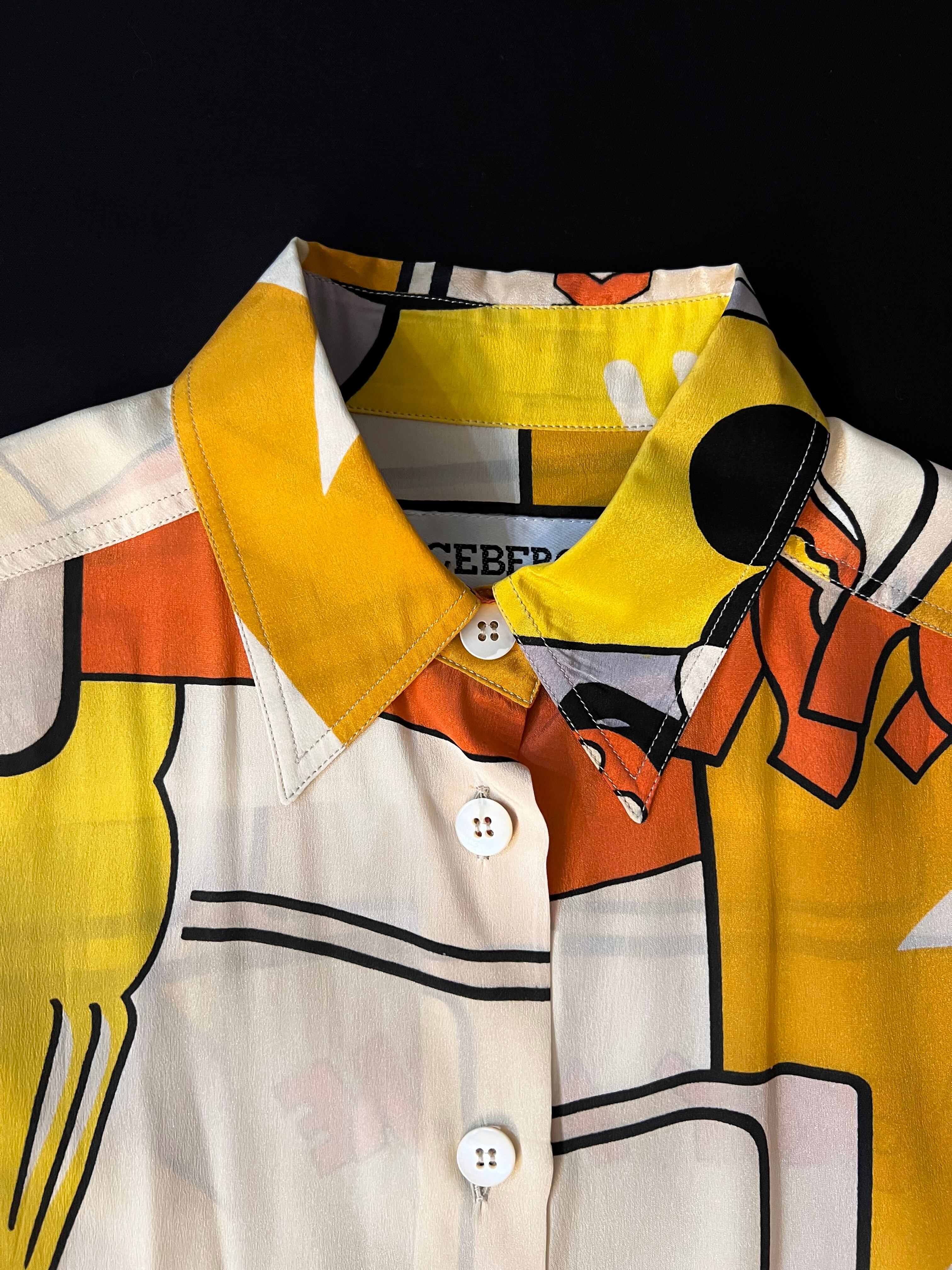 レトロミッキーの総柄が可愛いアートなシャツです。オーバーサイズシルエット、100%シルクの上質でとてもコンディションの良い逸品です。