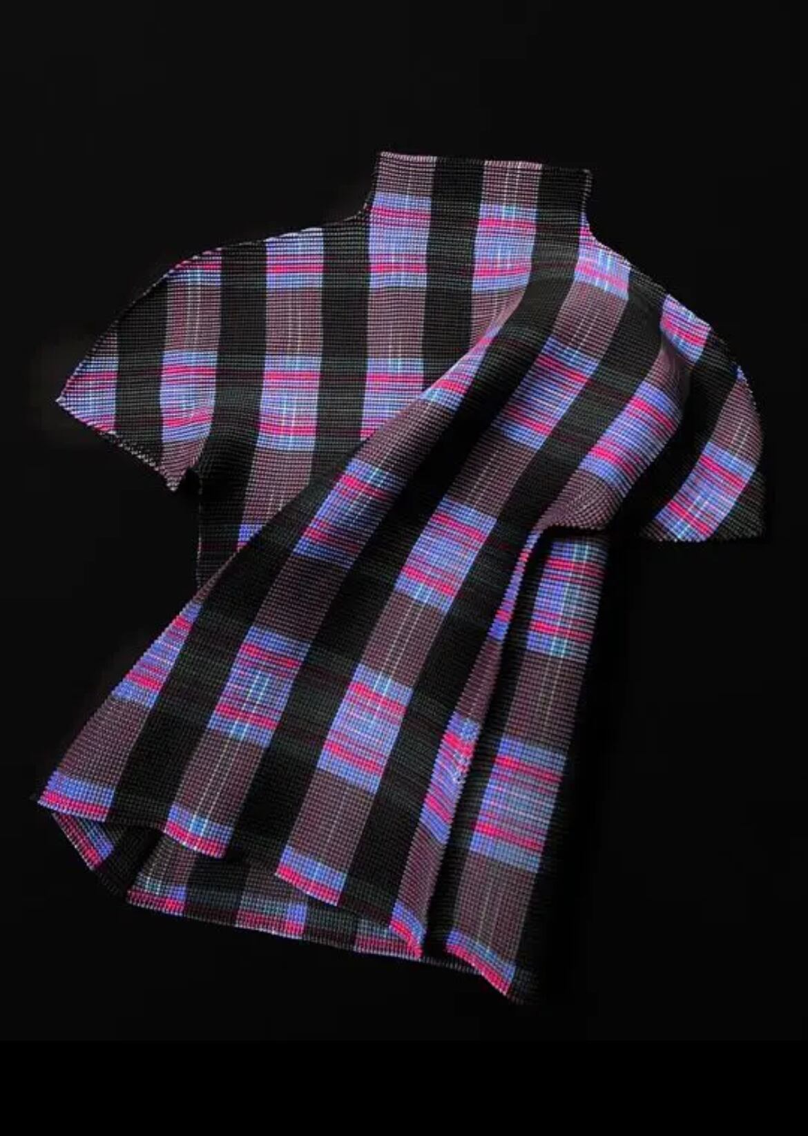 鮮やかなマドラスチェックに細かなプリーツを効かせたトップス