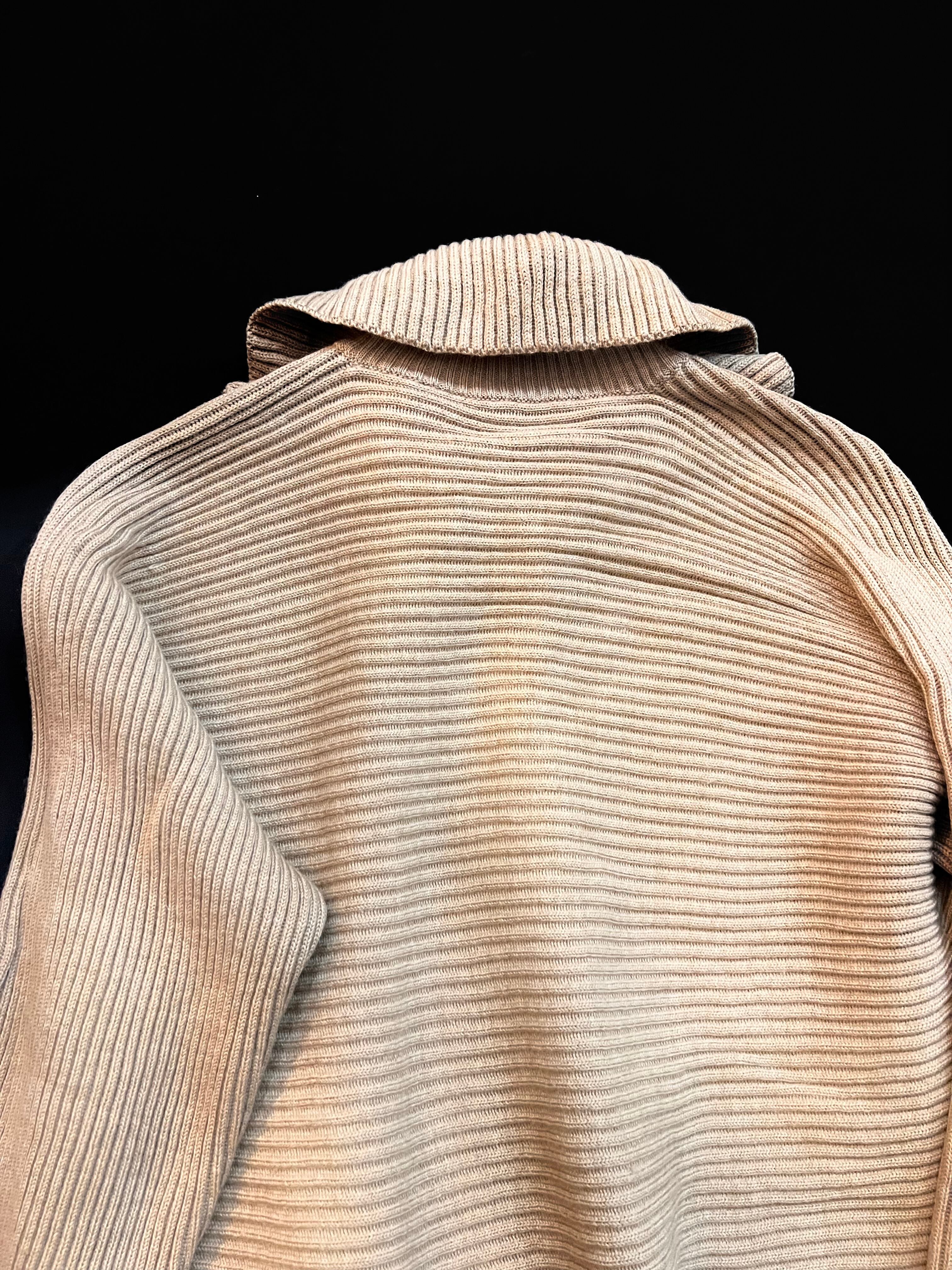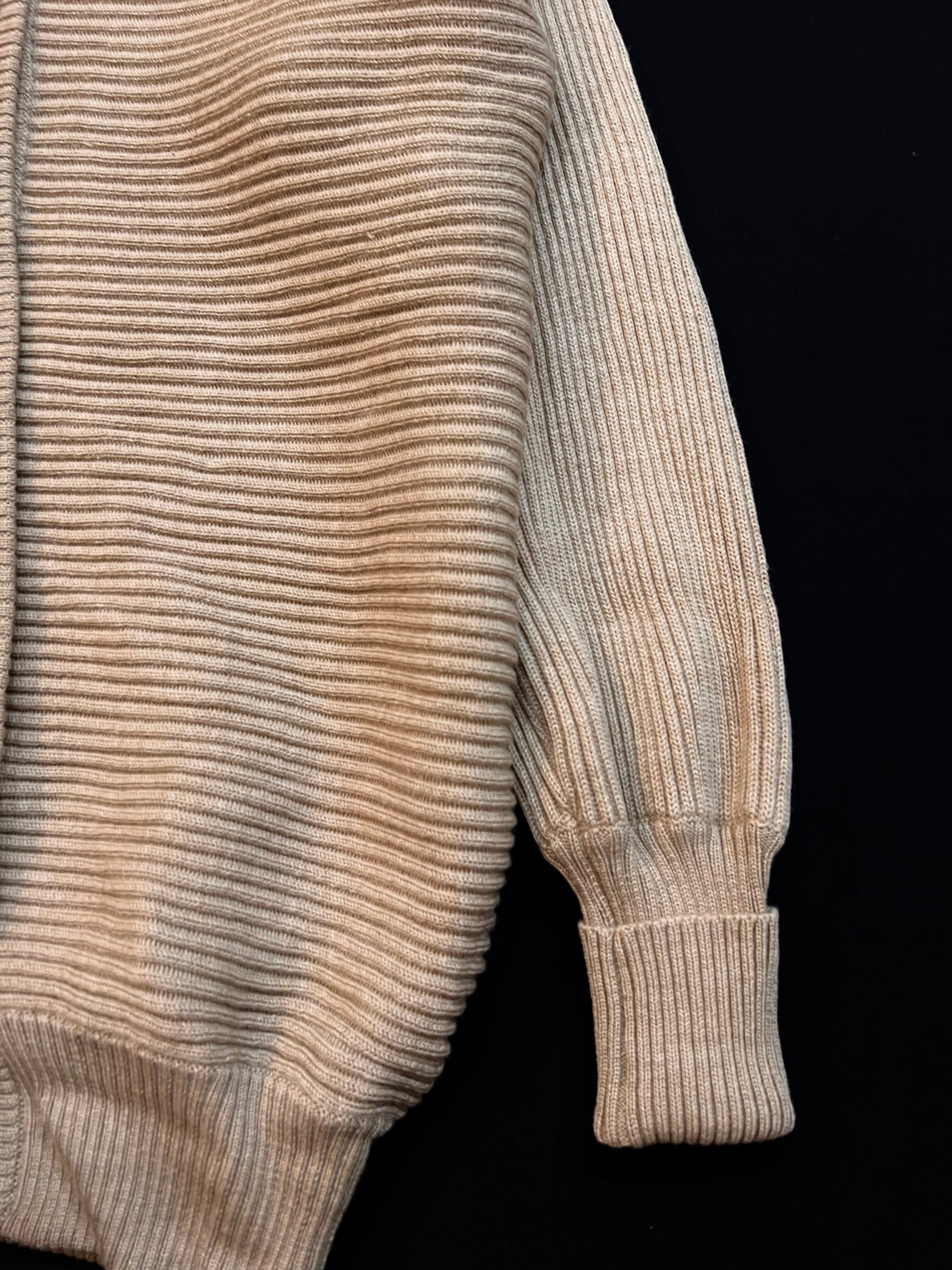 横向きのリブが特徴的なキャメルカラーのカーディガンです。